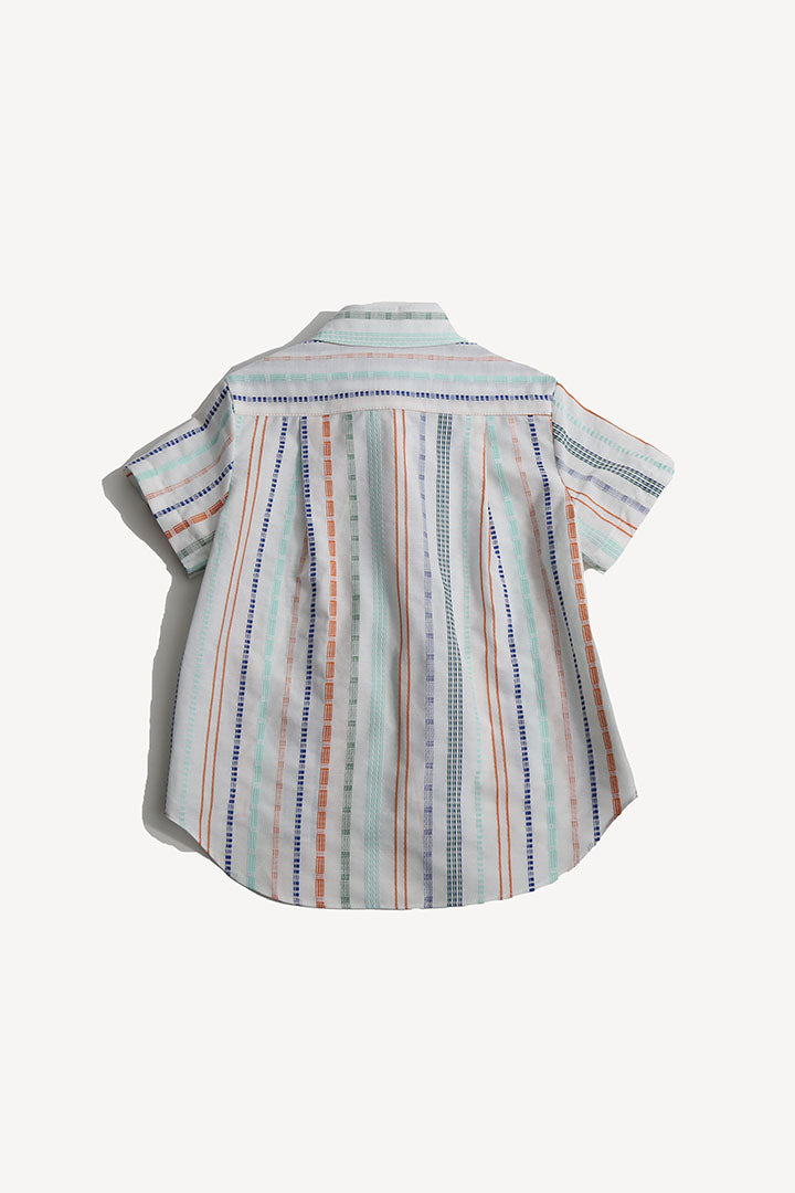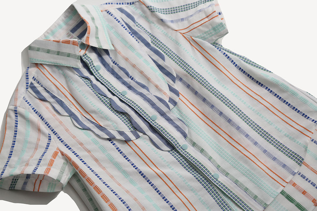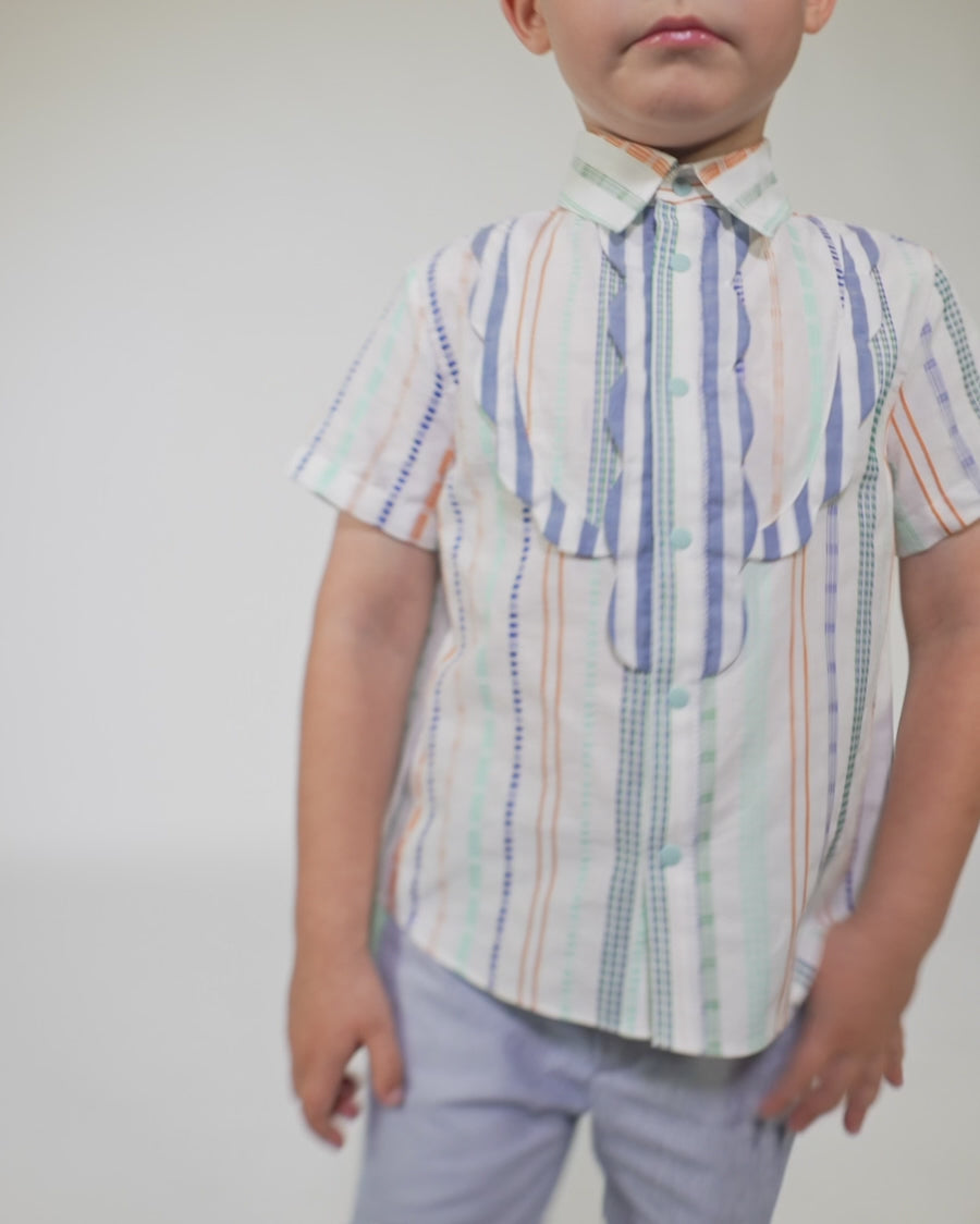 Introducing this season's boy’s scoop hem collared top, made neatly in the Paphos Stripe Shirting. Featuring a unique scalloped patchworking design thoughtfully crafted from past season fabrics in an effort to reduce waste, while repurposing scraps of fabric. The scalloped fabric creates an eye-catching bib detail at the front, adding a playful touch to this classic short sleeve top. With an easy snap closure, this top ensures quick and effortless dressing. Makes for a handsome and eco-conscious style for your little!