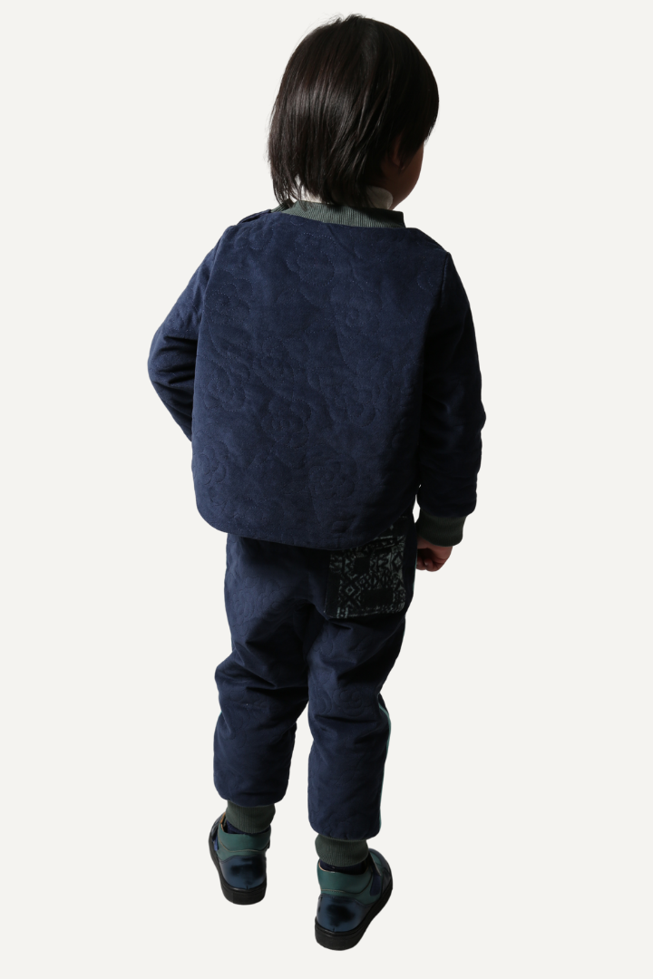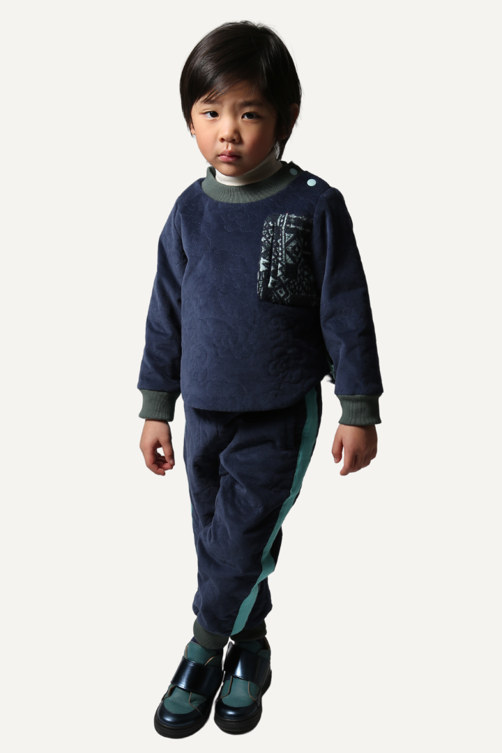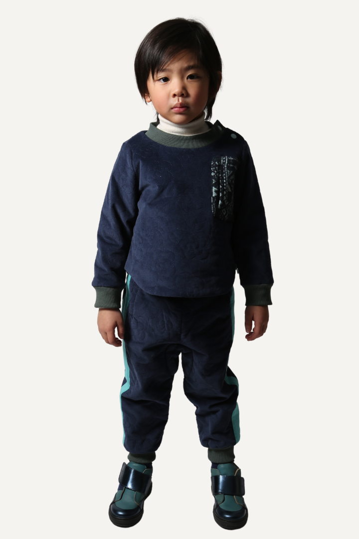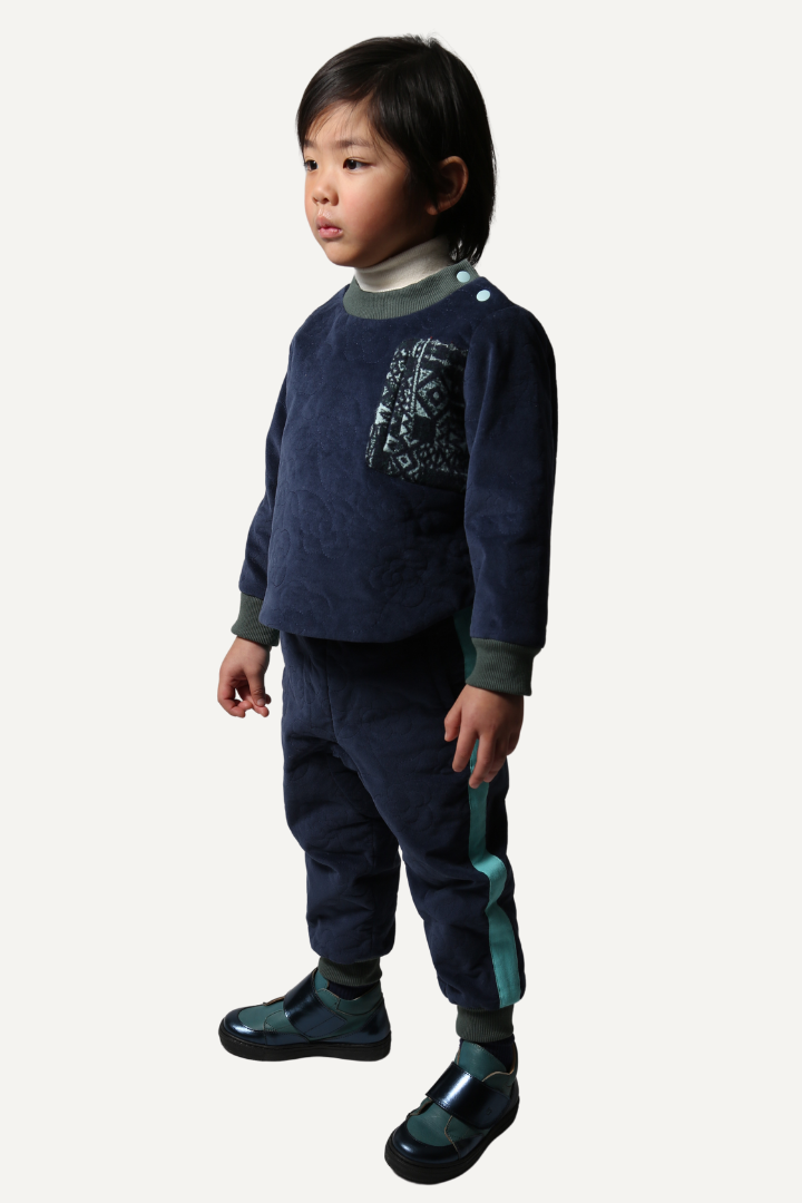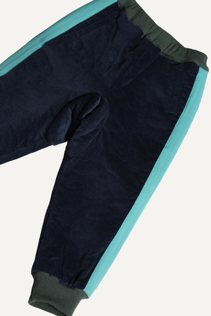 Sporty track pants for your little guy, made in this season's ultra soft Breton Tarp Velvet. Crafted with the rose bloom tufting pattern throughout, and heavily padded for extra warmth. Featuring a pull-on elastic ribbed waistband, side seam pockets and ribbing at the leg openings for a snug fit. With a contrast patch pocket at back and ribbons lining the sides. A cozy trouser for everyday wear and play.
