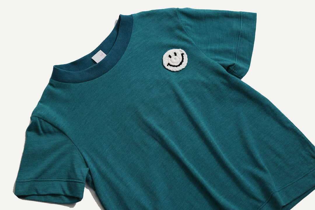 This top is sure to make them smile! This ultra-fine jersey classic short sleeve tee features a comfortable ribbed neckline. Finished sweetly with an adorable crochet smiley face embellishment! Made perfect for layering underneath jackets and vests, or can be worn on it's own. Ideal for everyday adventures and available in an array of colors, it’s a comfy staple that brings fun to any outfit!