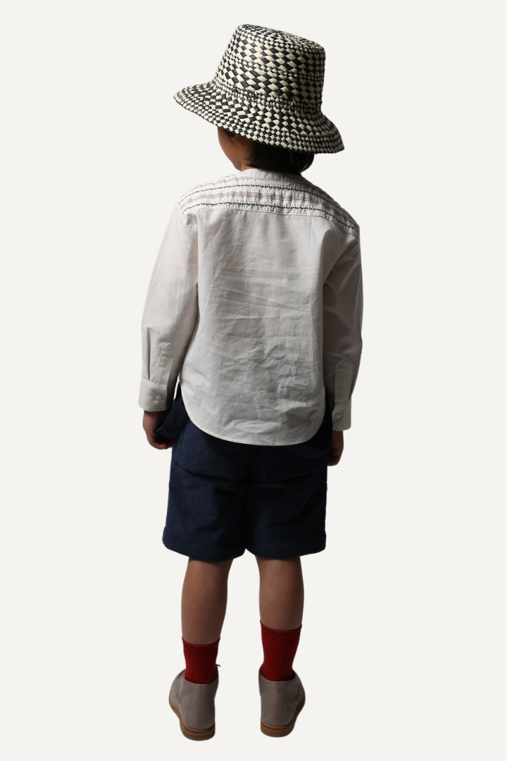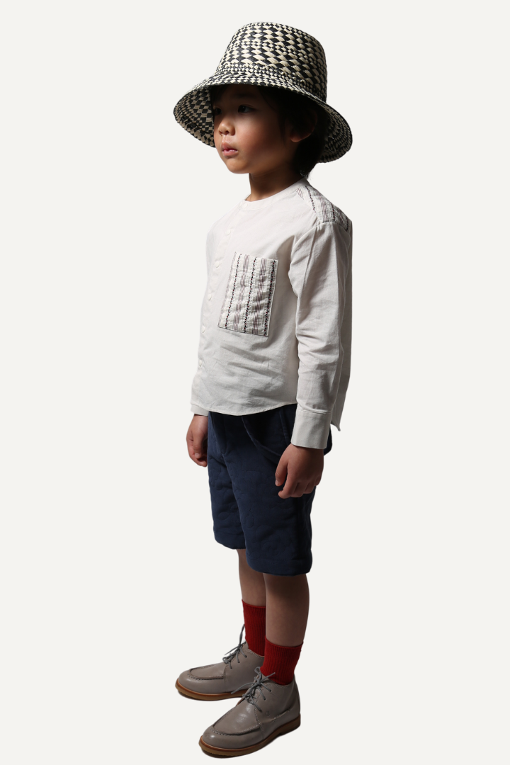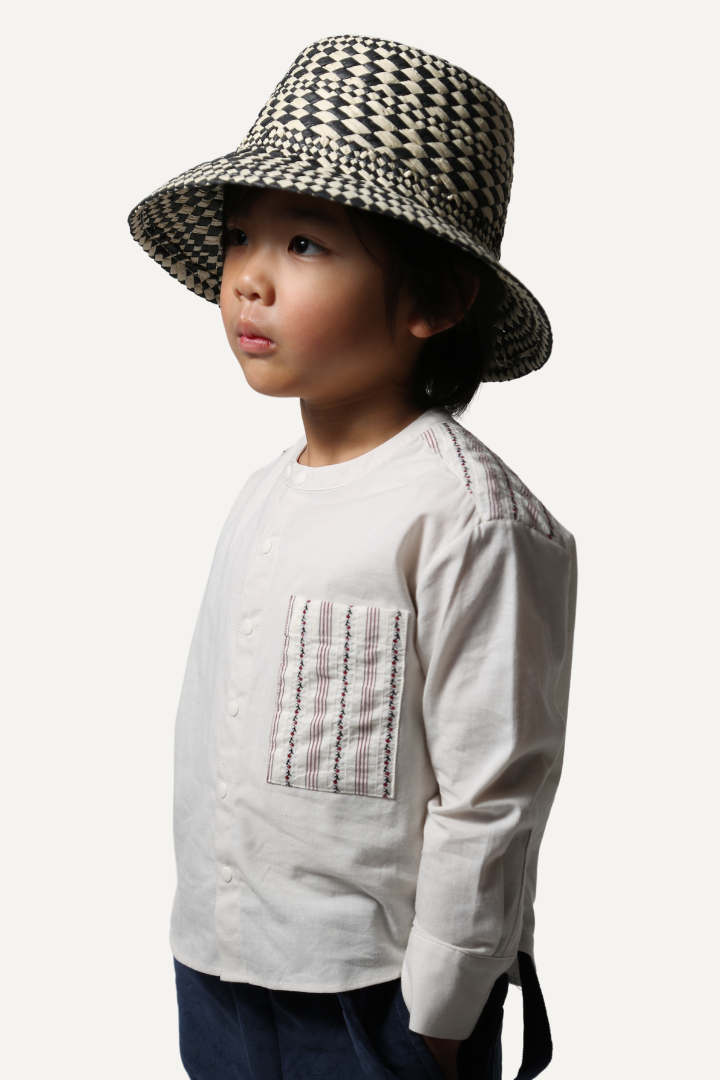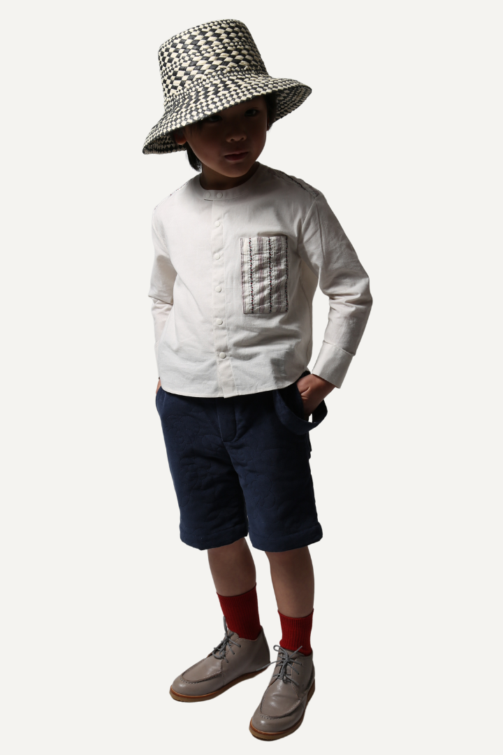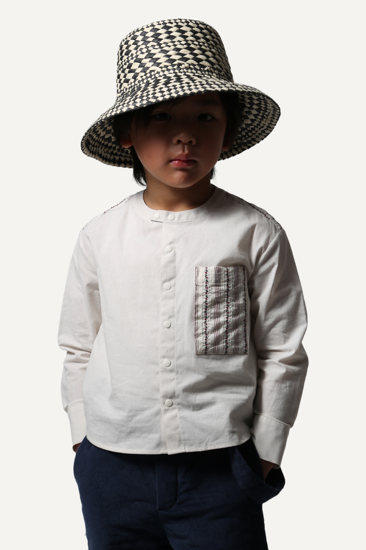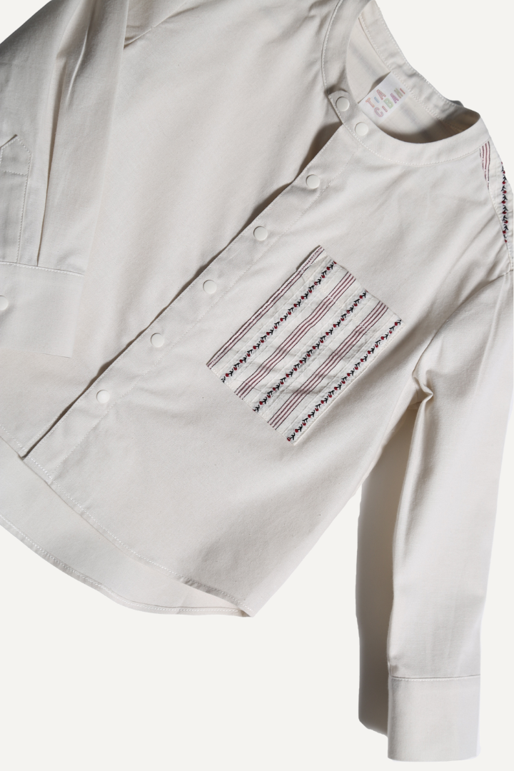 The classic patchwork snap shirt, now made in the Chambray Cotton Shirting with the Rosa Woven Stripe at the patch pocket and yoke at the back. Featuring snaps at the center front and cuffs, a high-low scoop hem and long sleeves. A very versatile style that can be dressed up or down.