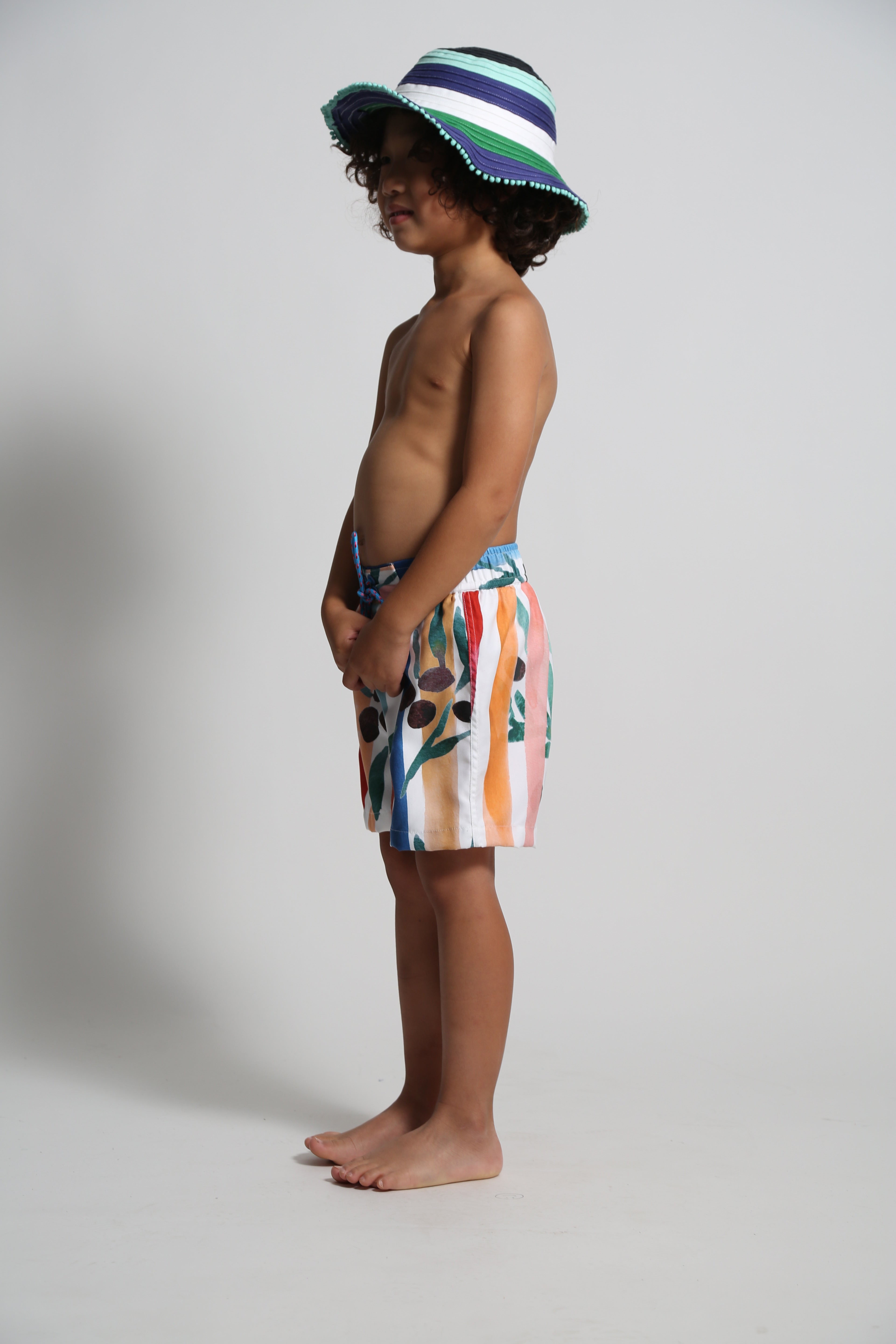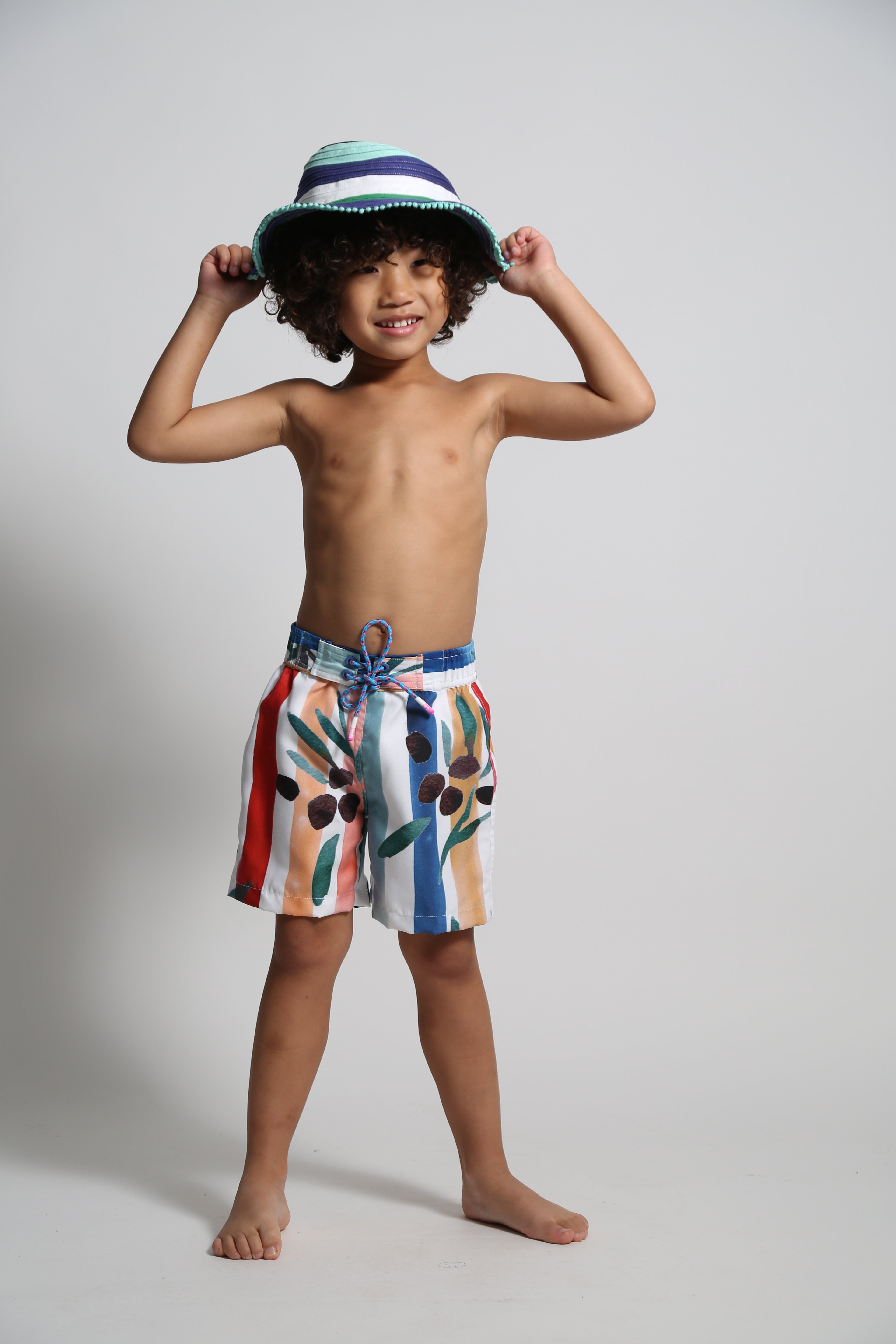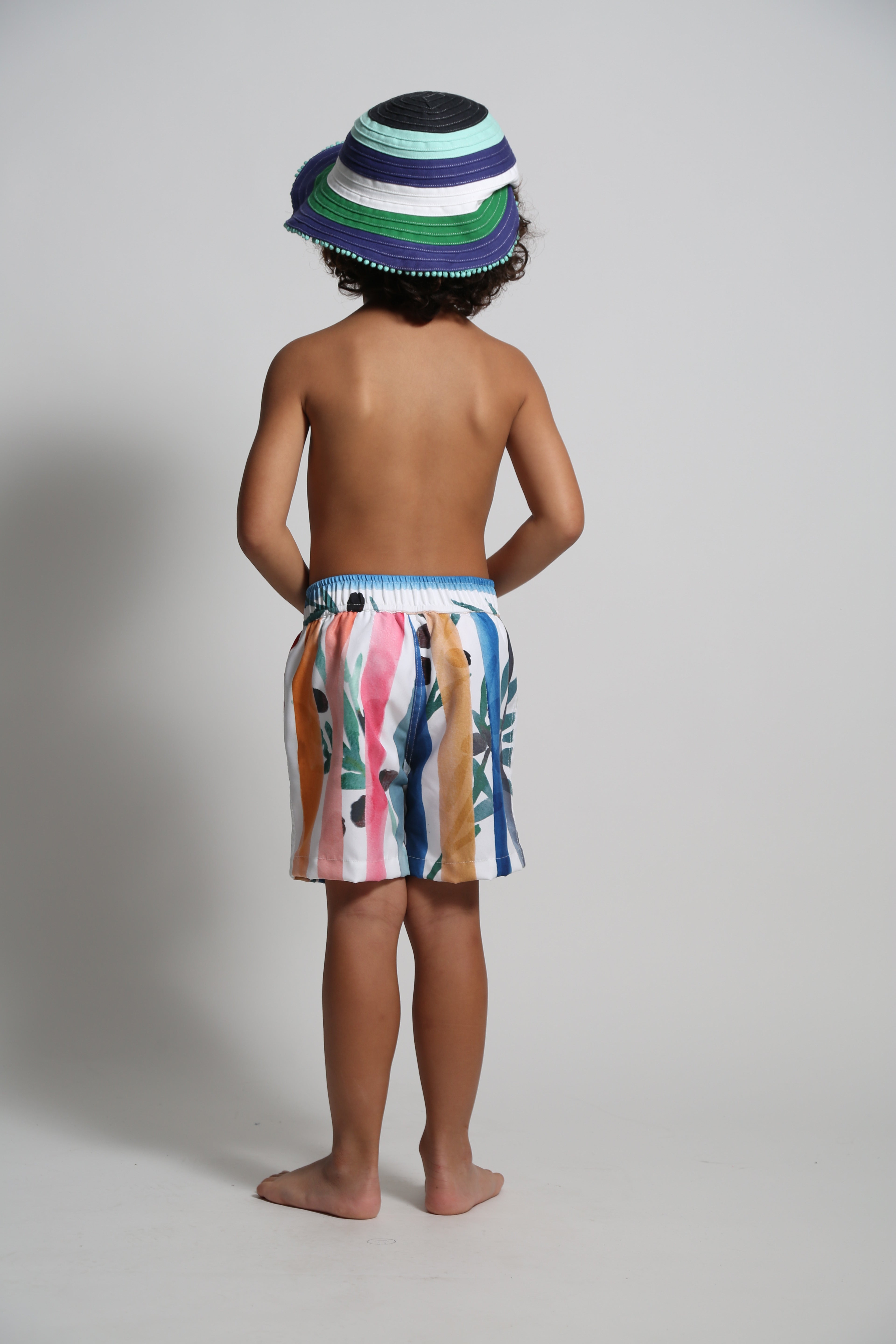 Classic fit boy's surf shorts, made in this season's Garden of Peaceful Stripe Swim fabric. With elastic, a colorful rope tie, and a grommeted front panel at waist for easy adjusting. Featuring on-seam side pockets to hold all their beach treasures and mesh lining for extra support. Treated with UV protection, he can dive straight into summer in these playful surf shorts!