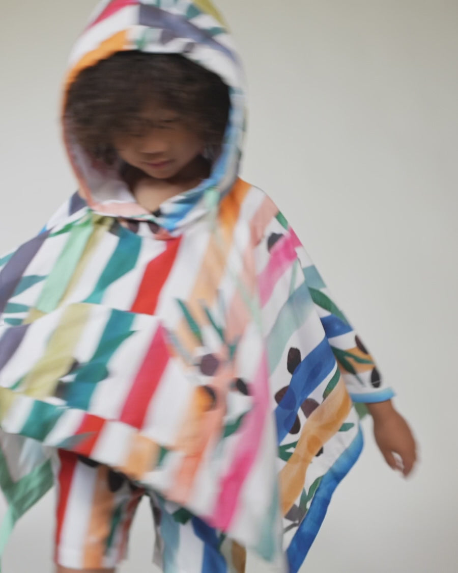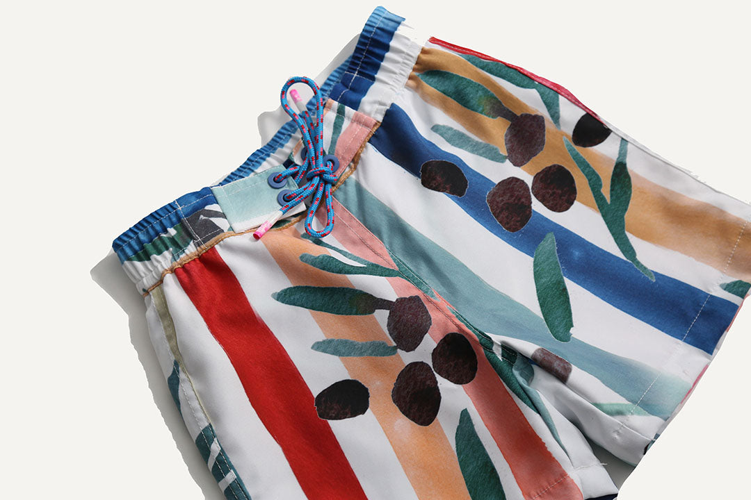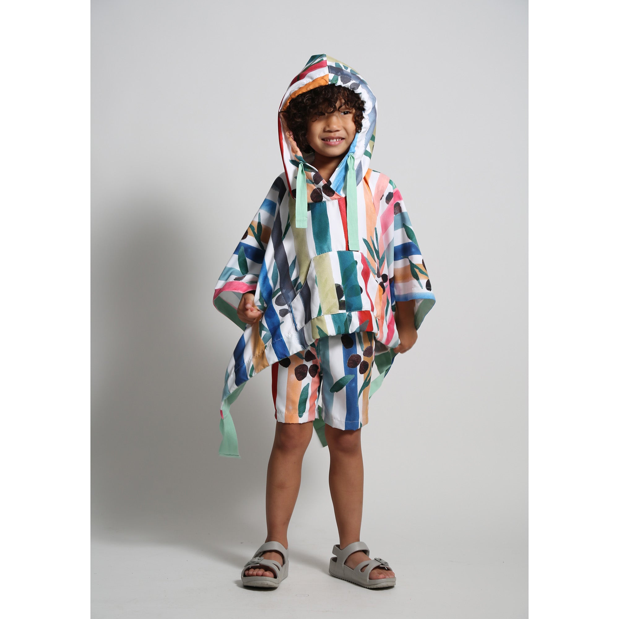 Classic fit boy's surf shorts, made in this season's Garden of Peaceful Stripe Swim fabric. With elastic, a colorful rope tie, and a grommeted front panel at waist for easy adjusting. Featuring on-seam side pockets to hold all their beach treasures and mesh lining for extra support. Treated with UV protection, he can dive straight into summer in these playful surf shorts!
