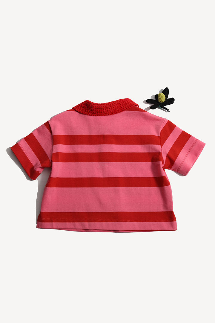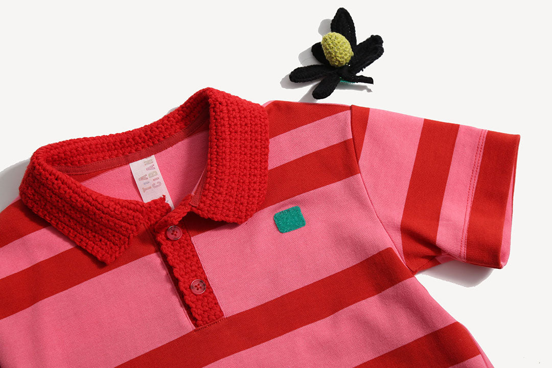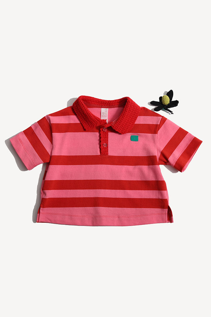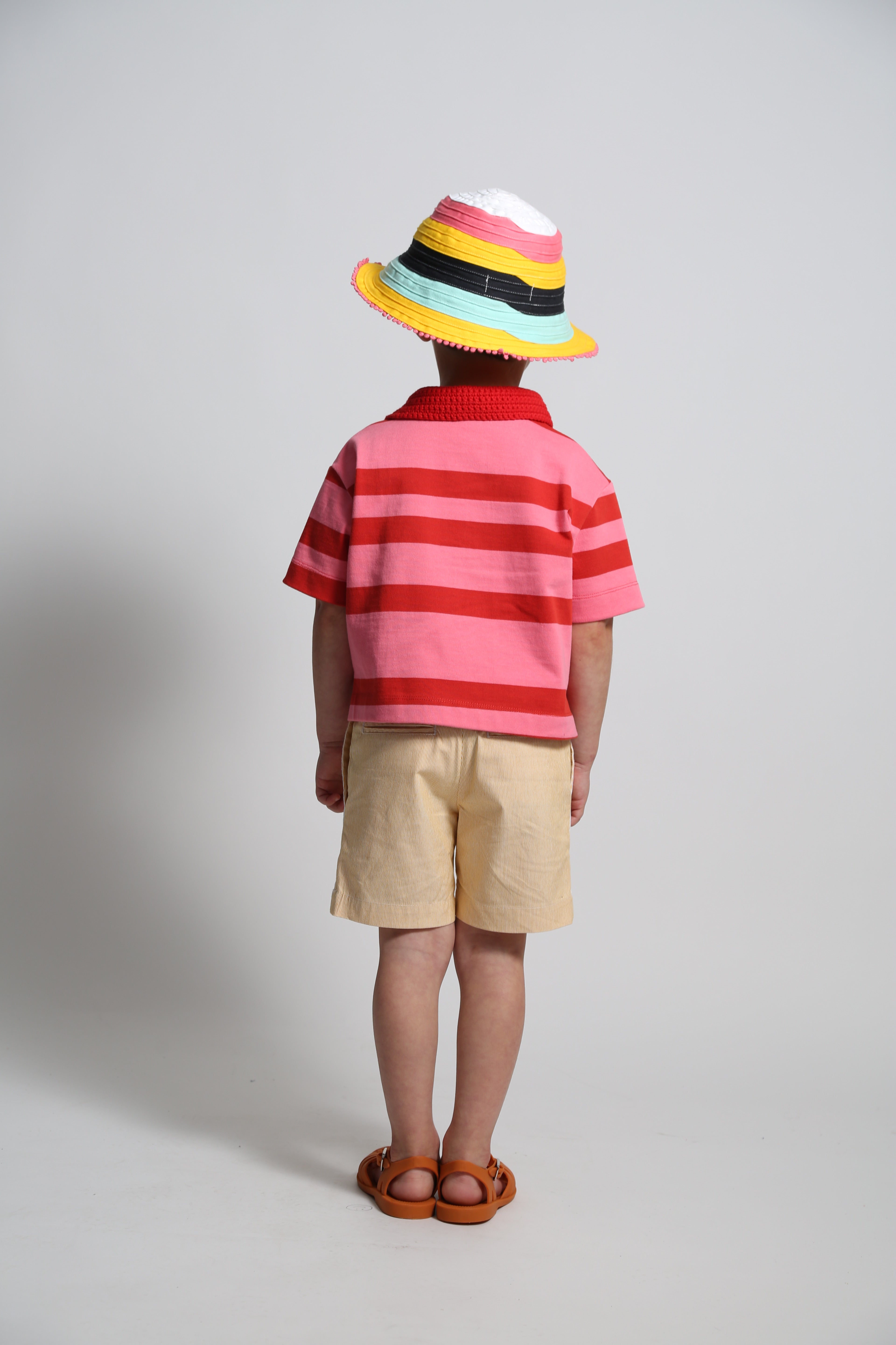 The cutest boy’s classic short sleeve polo shirt in the Mykonos Stripe Jersey, made for comfort and all day play. The hand-crochet collar adds a unique, artisanal touch, complemented by a button placket for easy wear. Featuring a charming crochet olive detail at the left chest, making for a fun design detail. A cool ensemble when worn with the Patchwork Bermudas.