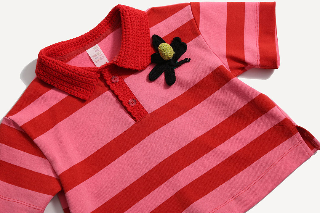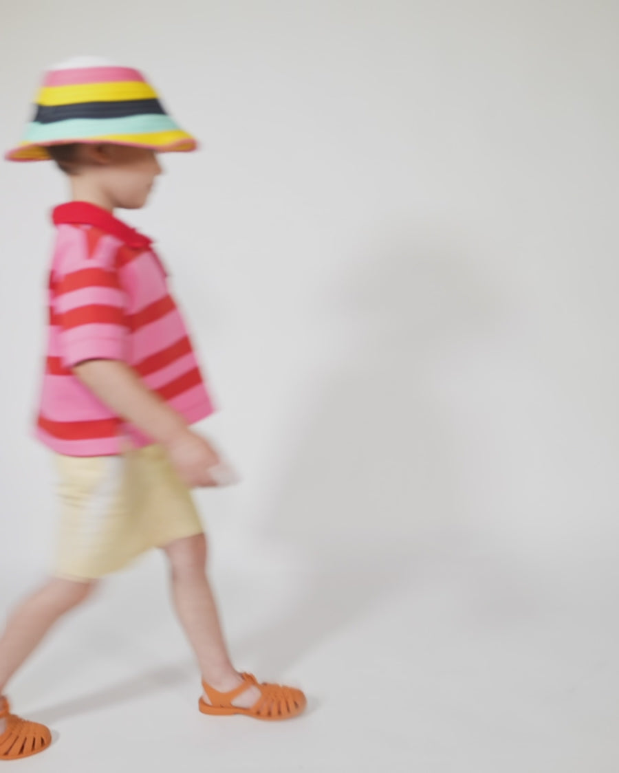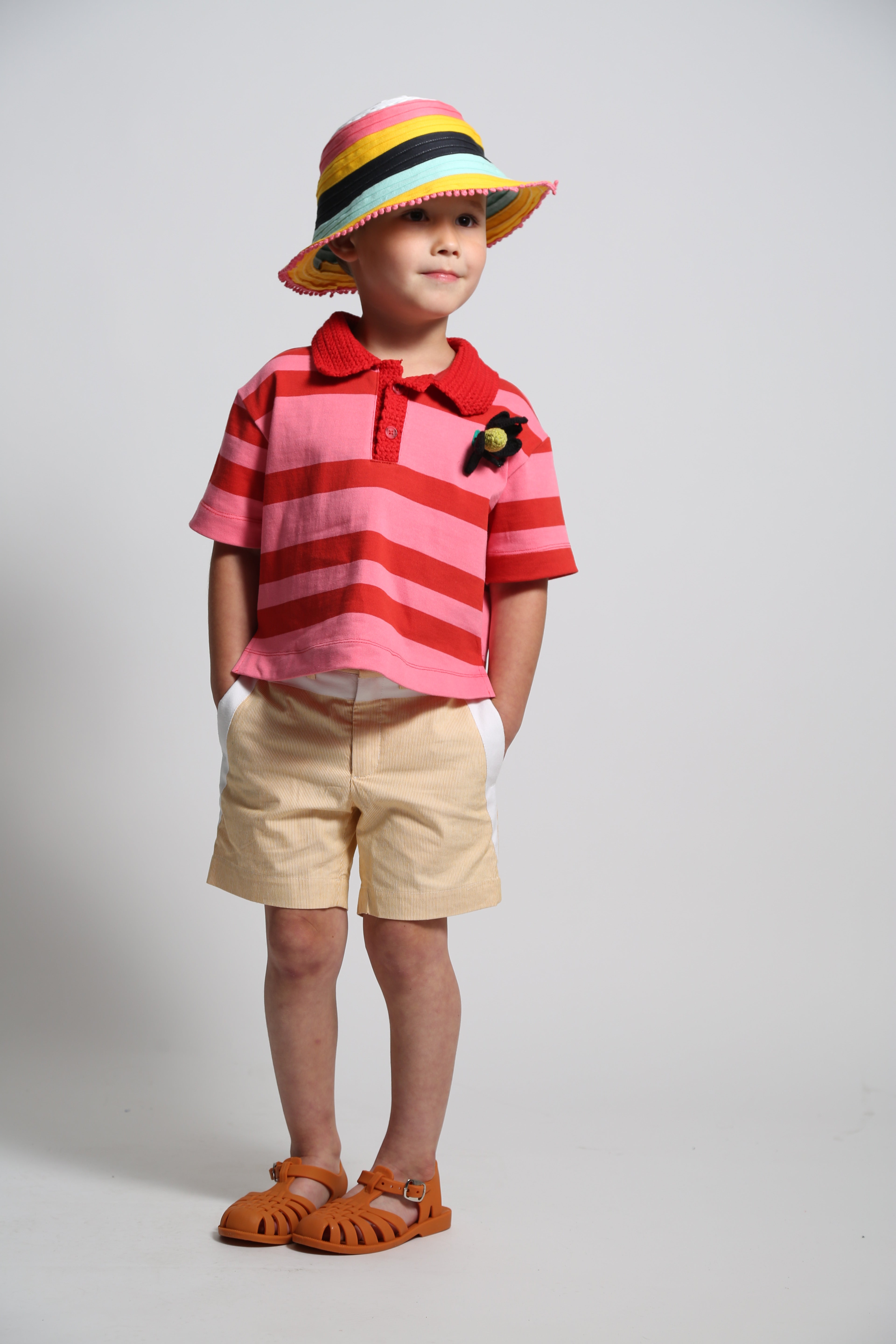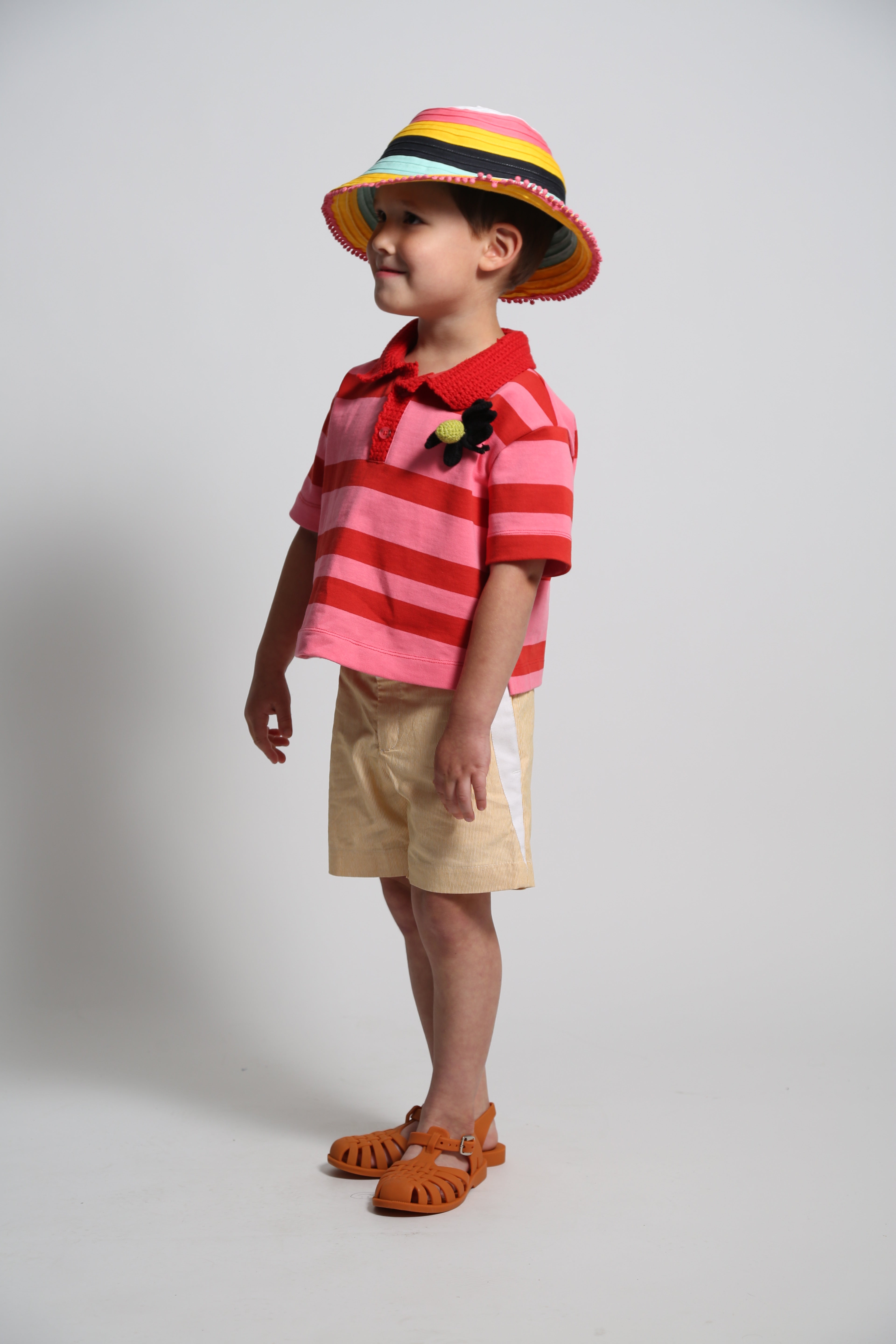The cutest boy’s classic short sleeve polo shirt in the Mykonos Stripe Jersey, made for comfort and all day play. The hand-crochet collar adds a unique, artisanal touch, complemented by a button placket for easy wear. Featuring a charming crochet olive detail at the left chest, making for a fun design detail. A cool ensemble when worn with the Patchwork Bermudas.