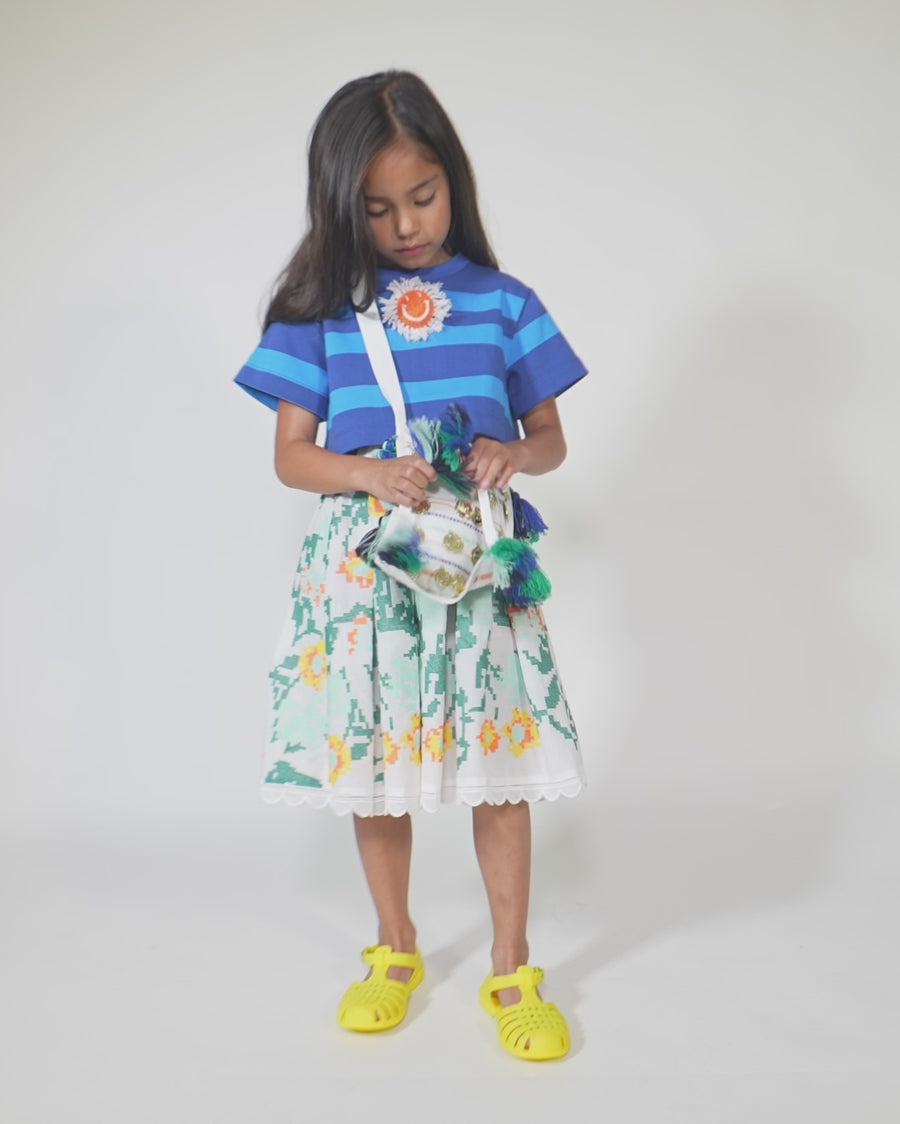 Get your little girl ready for summer fun with this cute cropped tee, made in the Mykonos Stripe Jersey and designed for both comfort and style. This short sleeve top features a crochet yarn detail patchworked at the back, adding a unique touch. The best part is the adorable crochet sun smiley face embellishment at the chest that can be seamlessly taken off due to the velcro backing. Style this top with the Ophelia Scalloped Skirt for an outfit that offers a blend of casual and dressed-up!