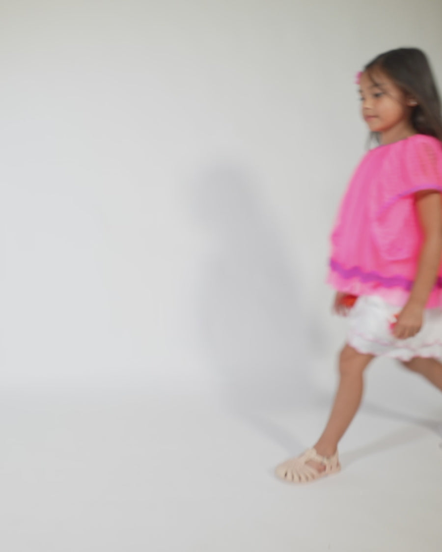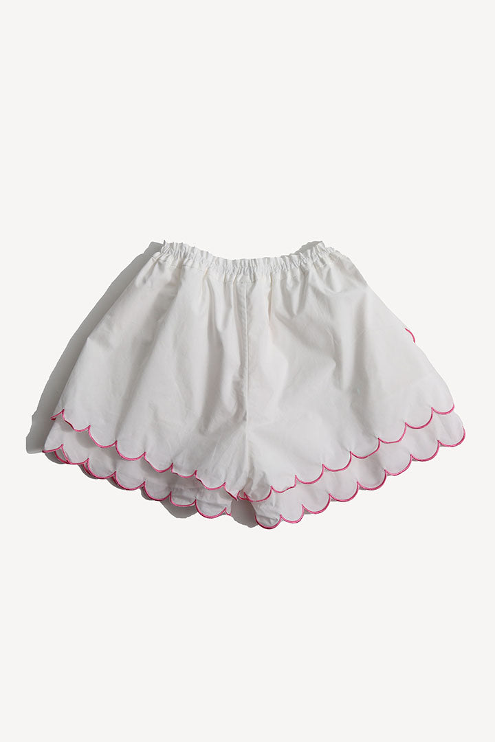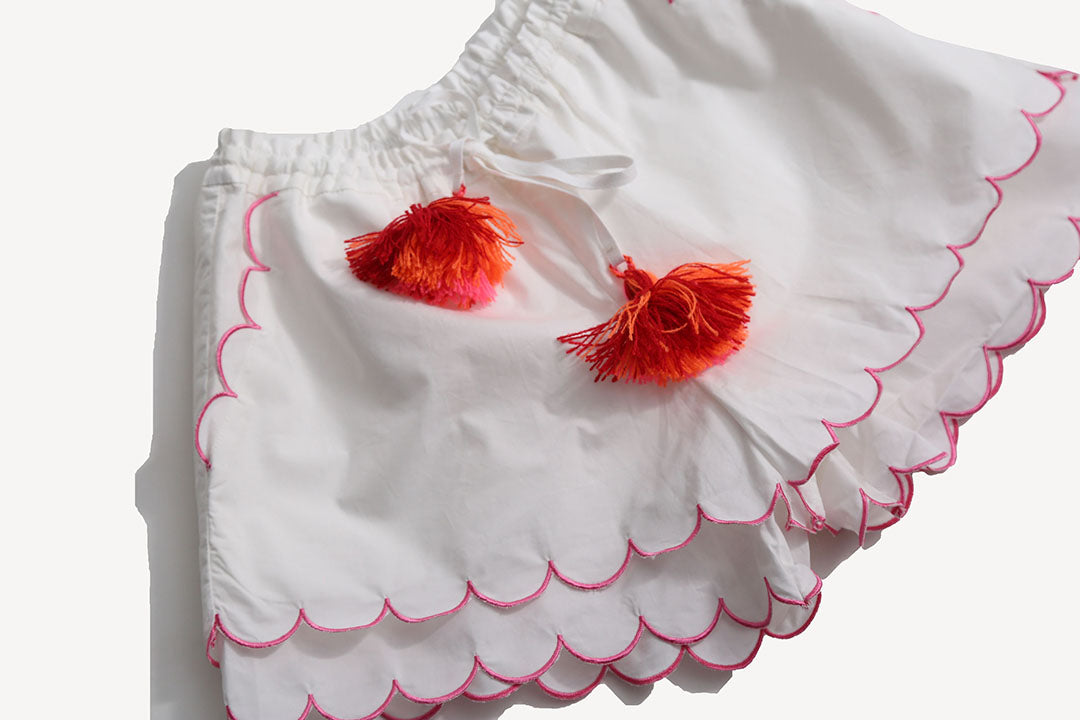 These girl’s easy everyday shorts are sure to become her new favorite pair for summer adventures. With a stylish tiered scalloped detail at the hem, they’re beautifully finished with contrasting embroidery thread for an added touch of charm. The high-waisted design features an elastic waistband and pockets, making them both practical and comfortable Plus, the self-drawstring at the waist, complete with a colorful tassel detail, adds a playful finishing touch to these must-have shorts! Wear these shorts with the Laurel Scalloped Summer Blouse for the complete Classic Cotton Poplin outfit!