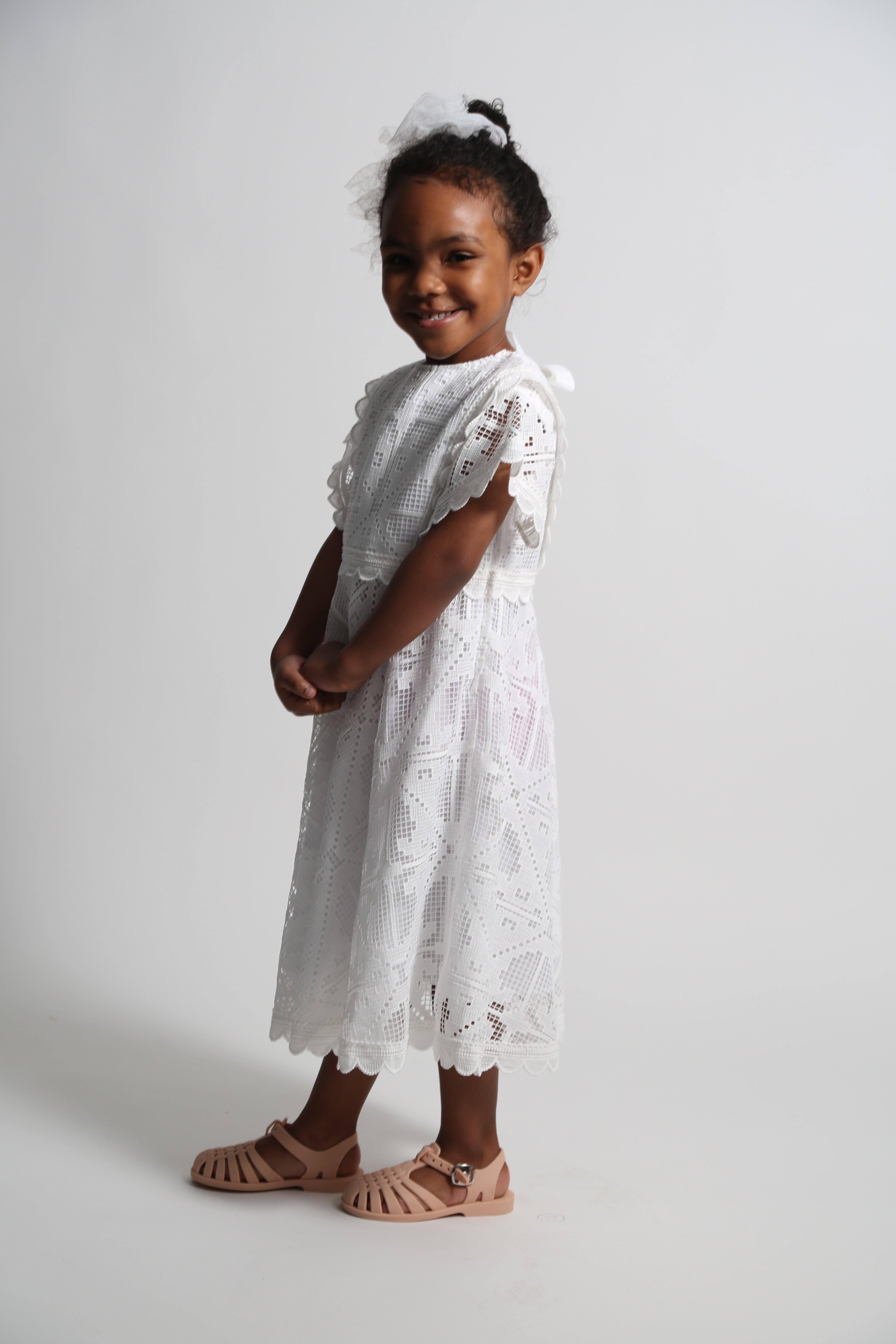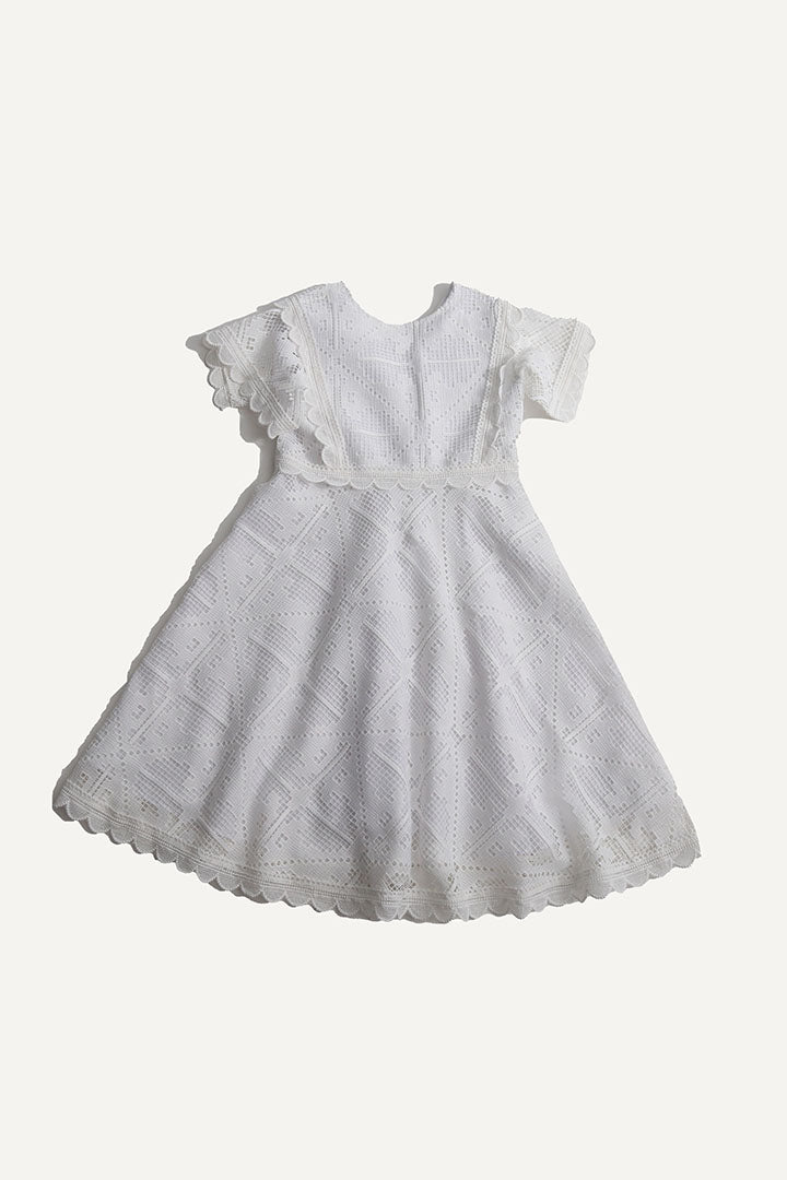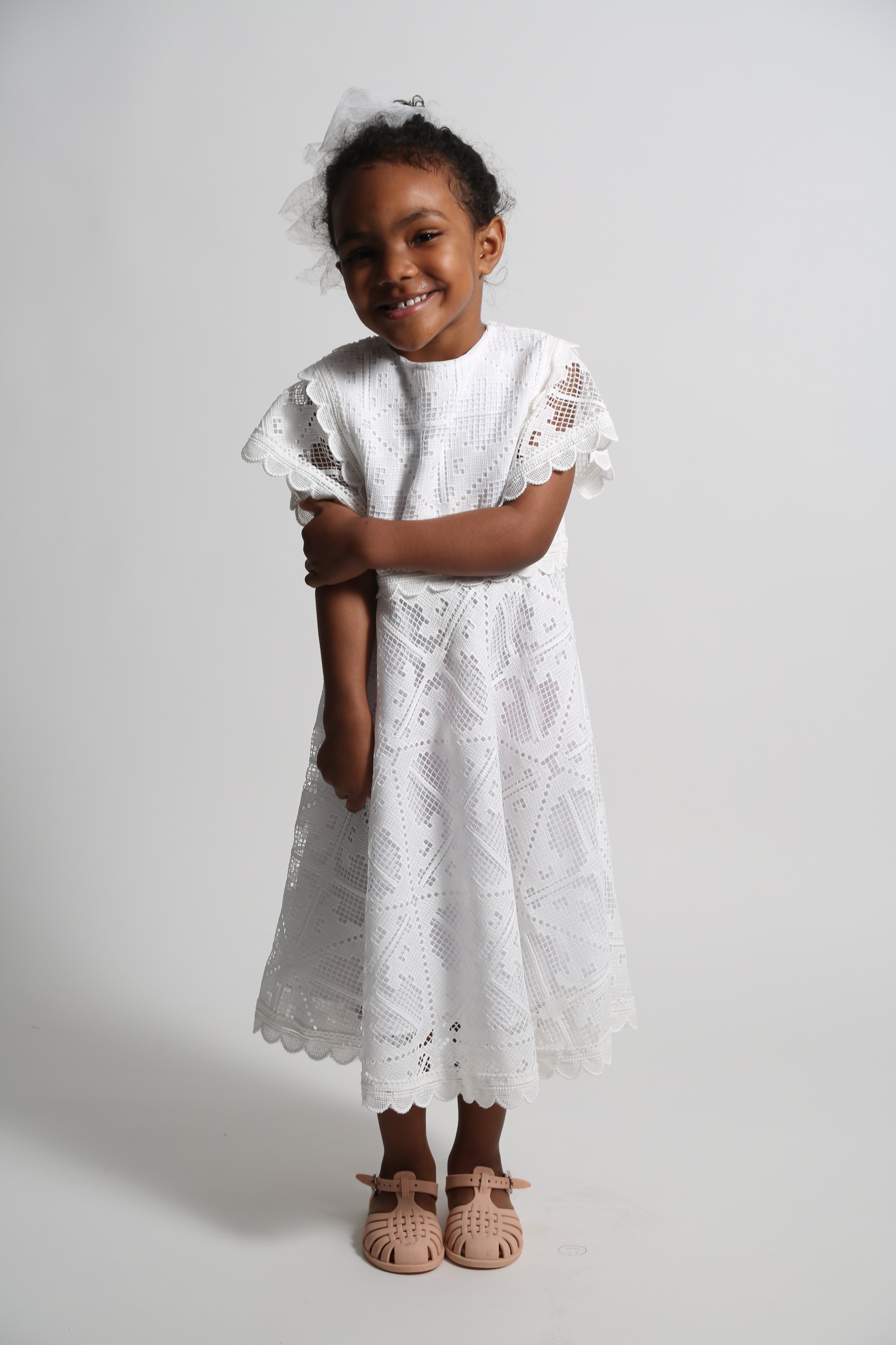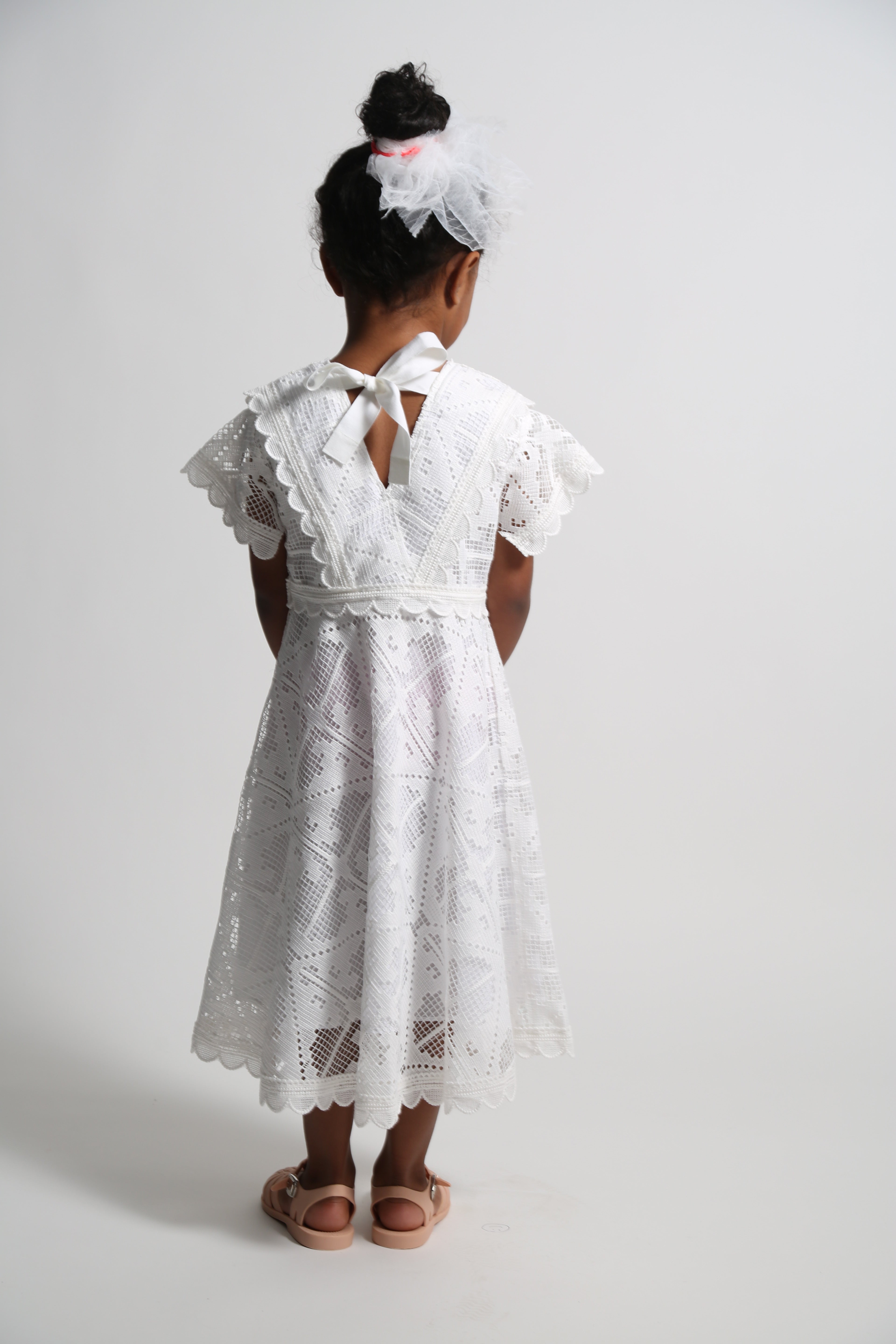 Fit and flare tea-length frock made in the dreamy Lefkara Embroidered Lace. The sailor-style bodice and squared sleeves create a timeless silhouette, while the embroidered lace ribbon accents at the sleeves, bib, and hem add a touch of elegance. Featuring a classic crew neckline at the front and a V-neckline at the back, complete with ribbons that tie into a sweet bow, this frock is both playful and sophisticated. The lace is artfully patchworked, creating intricate panels that enhance its beauty, making it a perfect choice for special occasions.