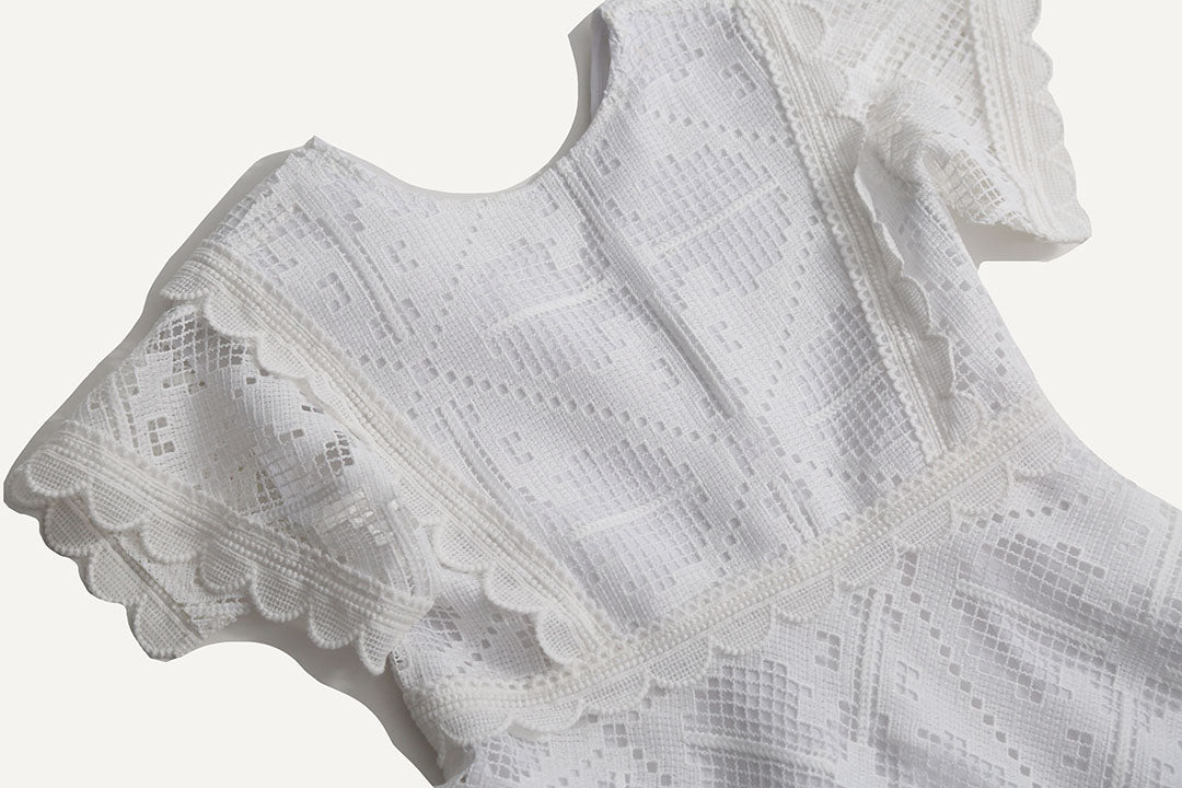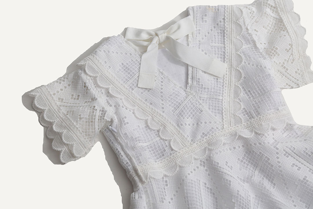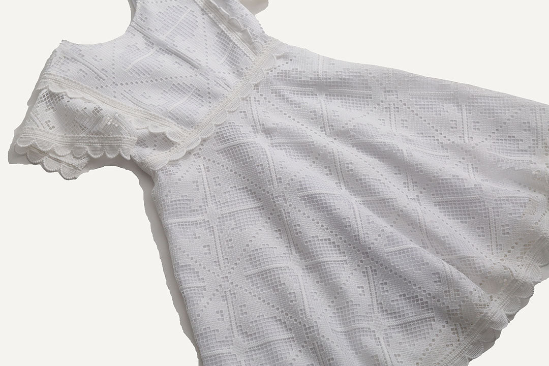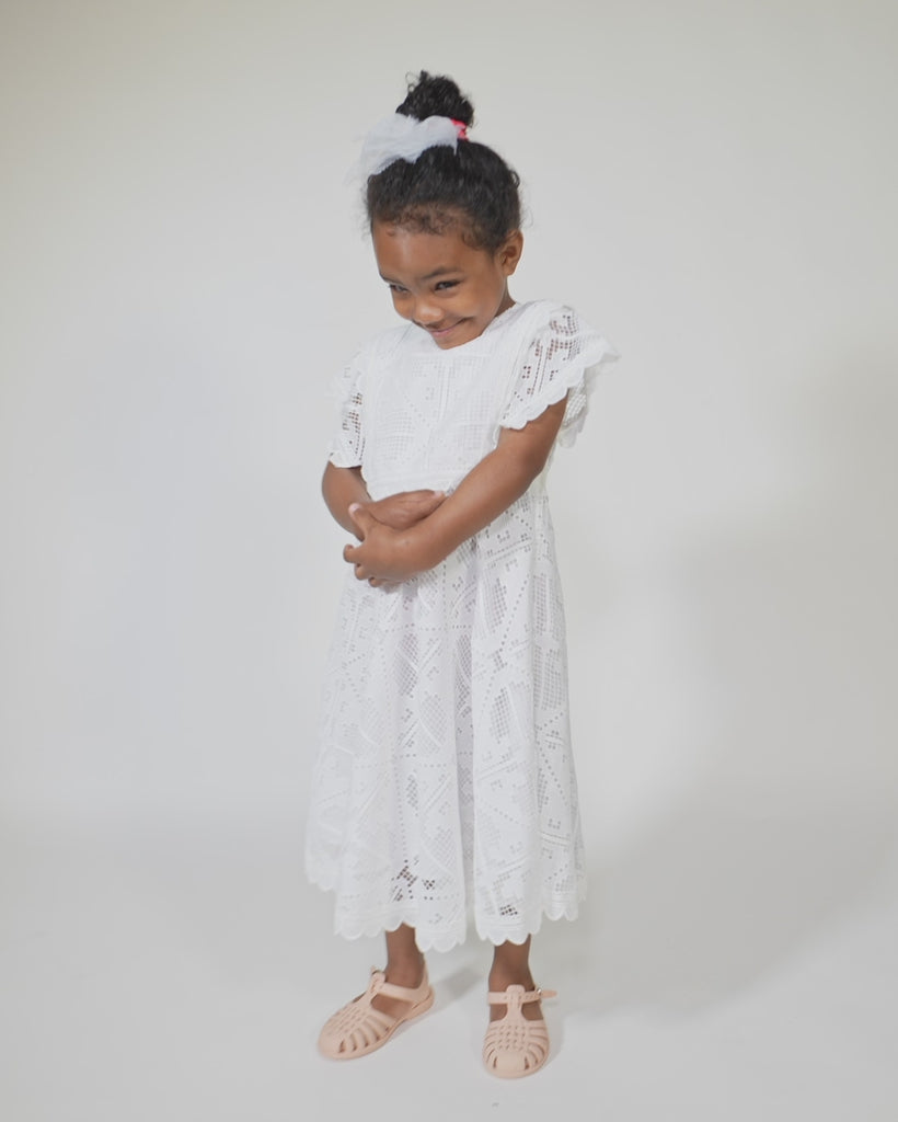 Fit and flare tea-length frock made in the dreamy Lefkara Embroidered Lace. The sailor-style bodice and squared sleeves create a timeless silhouette, while the embroidered lace ribbon accents at the sleeves, bib, and hem add a touch of elegance. Featuring a classic crew neckline at the front and a V-neckline at the back, complete with ribbons that tie into a sweet bow, this frock is both playful and sophisticated. The lace is artfully patchworked, creating intricate panels that enhance its beauty, making it a perfect choice for special occasions.