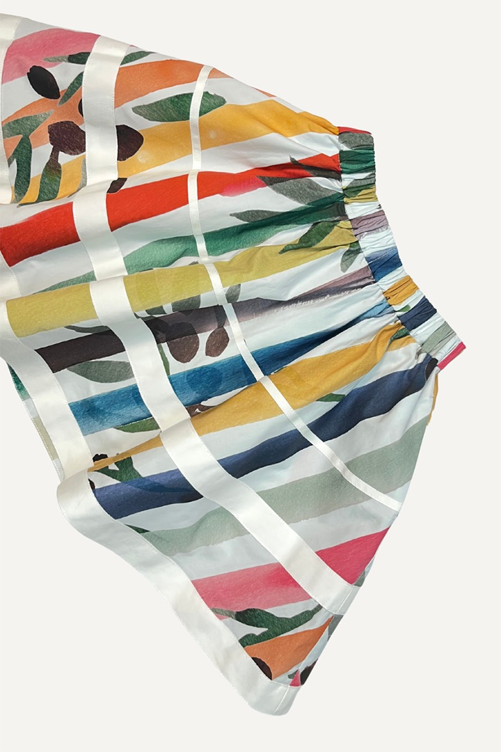 A TiA CiBANi exclusive style, only available here on our website! Made in the Garden of Peaceful Stripes print, this flared skirt was made for twirling! Various sized contrasting ribbons are tiered horizontally at the skirt. With in seam pockets and an elastic waistband for easier dressing. Makes for a sweet set when paired with the Sofia Smocked Blouse in its matching print.