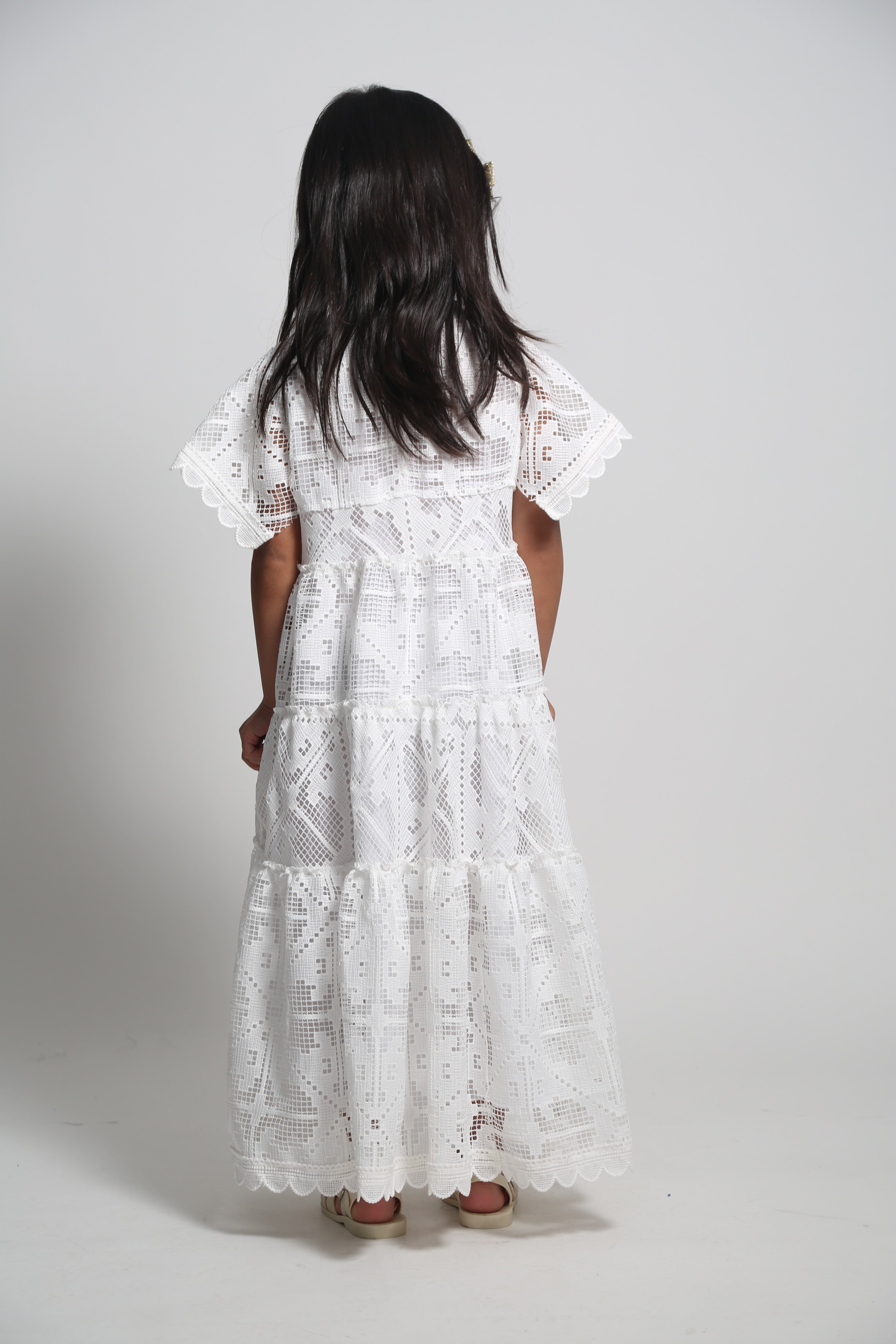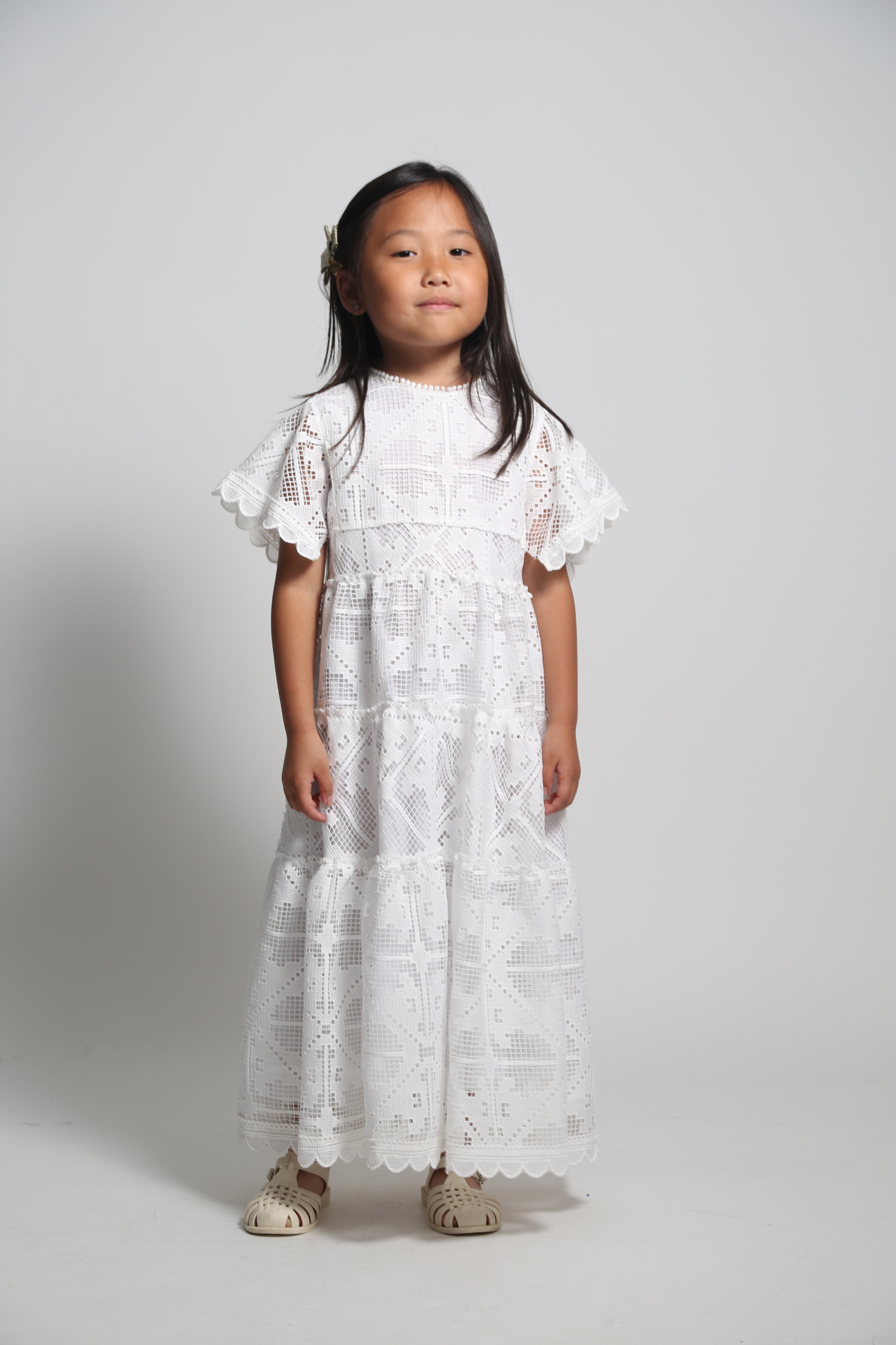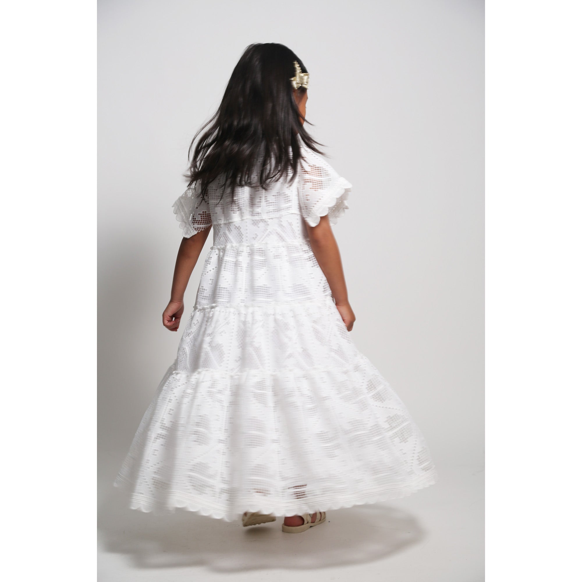 An enchanting full-length gown, crafted in the dreamy Lefkara Embroidered Lace, and designed to make your little one feel like a princess. This tiered maxi features a classic crew neckline beautifully trimmed with bobble detailing. Each tier features playfully patchworked lace panels, creating a stunning visual effect that is sure to turn heads. A keyhole and button loop closure at the back, complemented by a modesty lip ribbon, ensures an ease of dressing. The gown is finished with square unlined sleeves and a hem embellished with embroidered scalloped ribbon, making it a truly exquisite choice for special occasions.