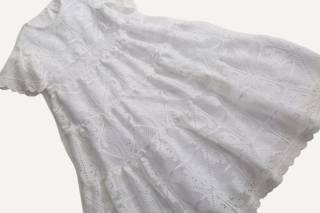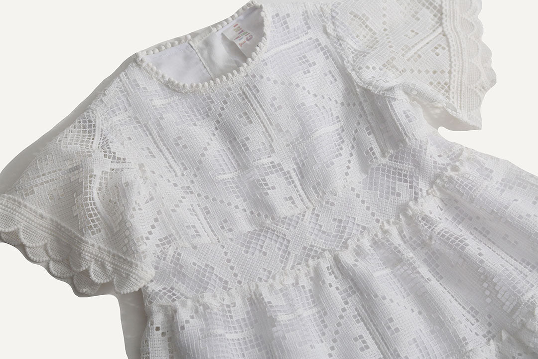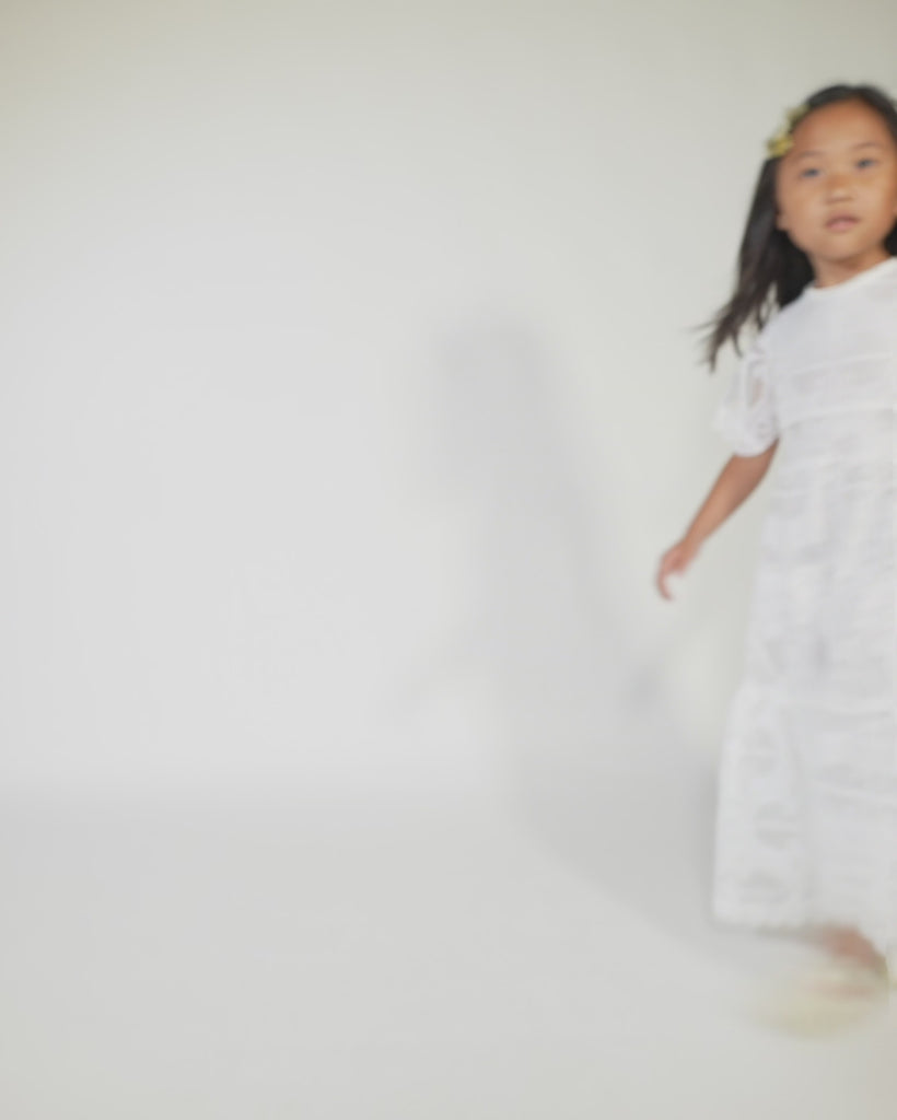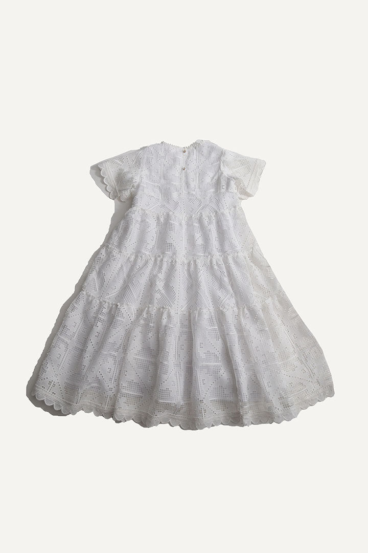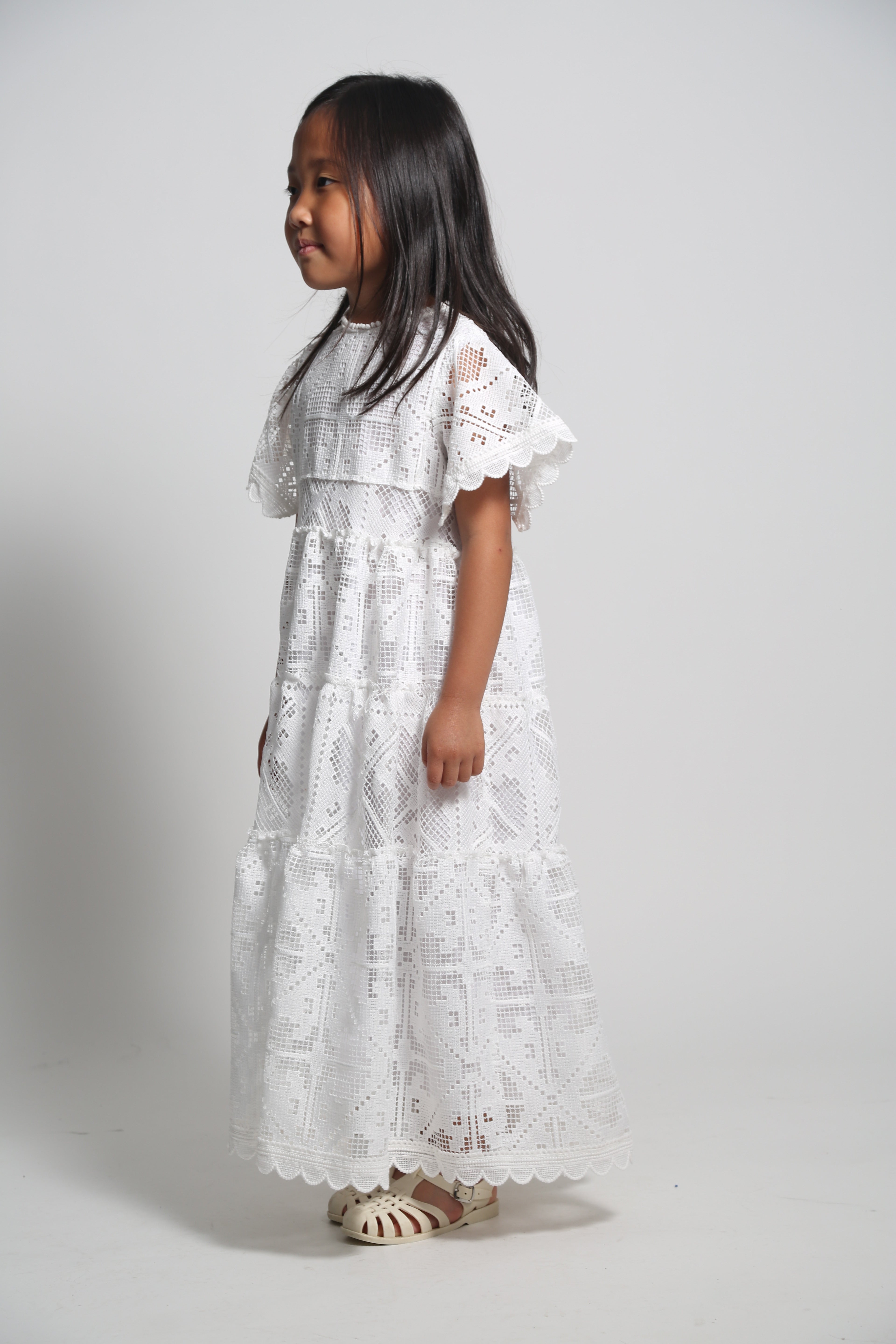 An enchanting full-length gown, crafted in the dreamy Lefkara Embroidered Lace, and designed to make your little one feel like a princess. This tiered maxi features a classic crew neckline beautifully trimmed with bobble detailing. Each tier features playfully patchworked lace panels, creating a stunning visual effect that is sure to turn heads. A keyhole and button loop closure at the back, complemented by a modesty lip ribbon, ensures an ease of dressing. The gown is finished with square unlined sleeves and a hem embellished with embroidered scalloped ribbon, making it a truly exquisite choice for special occasions.