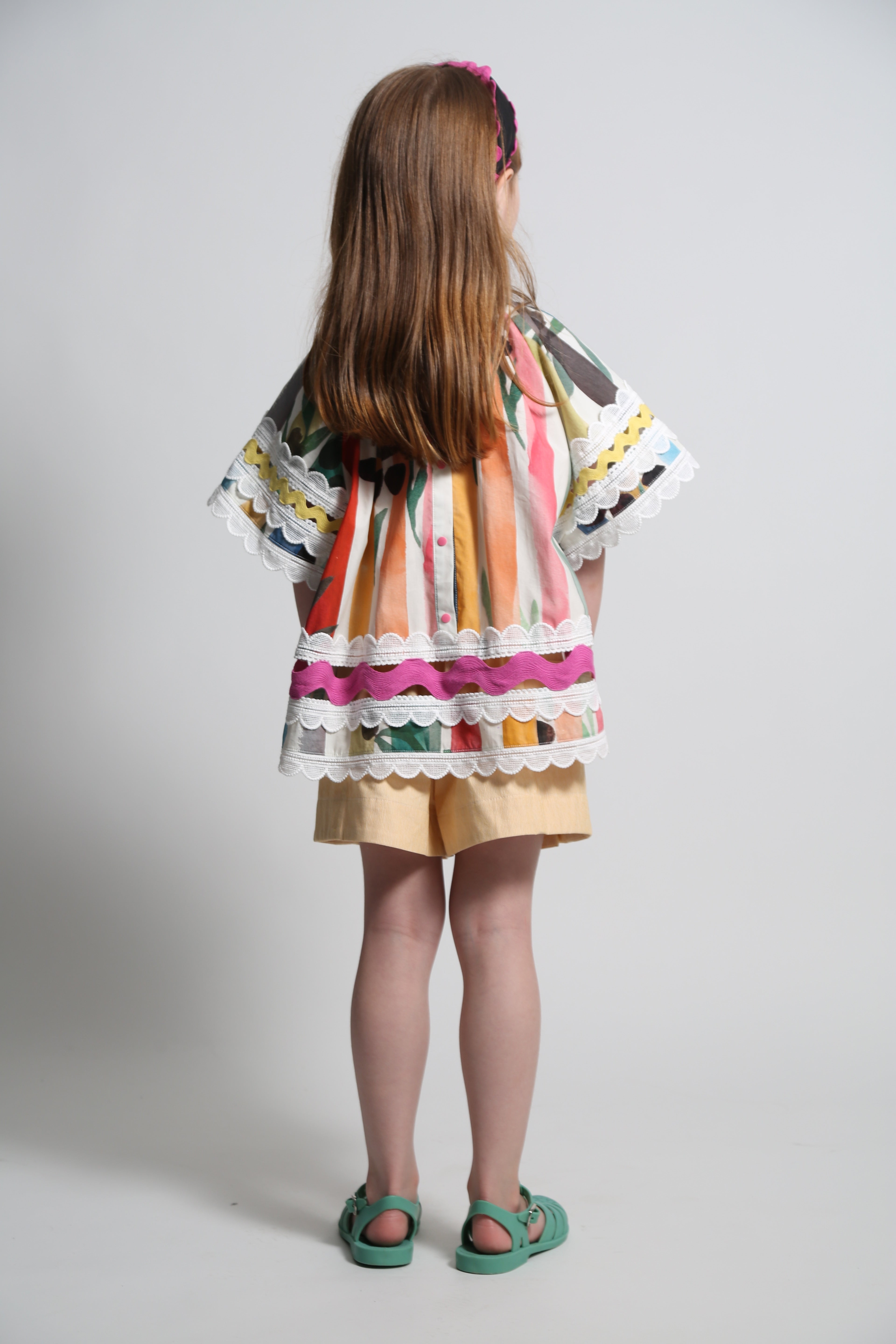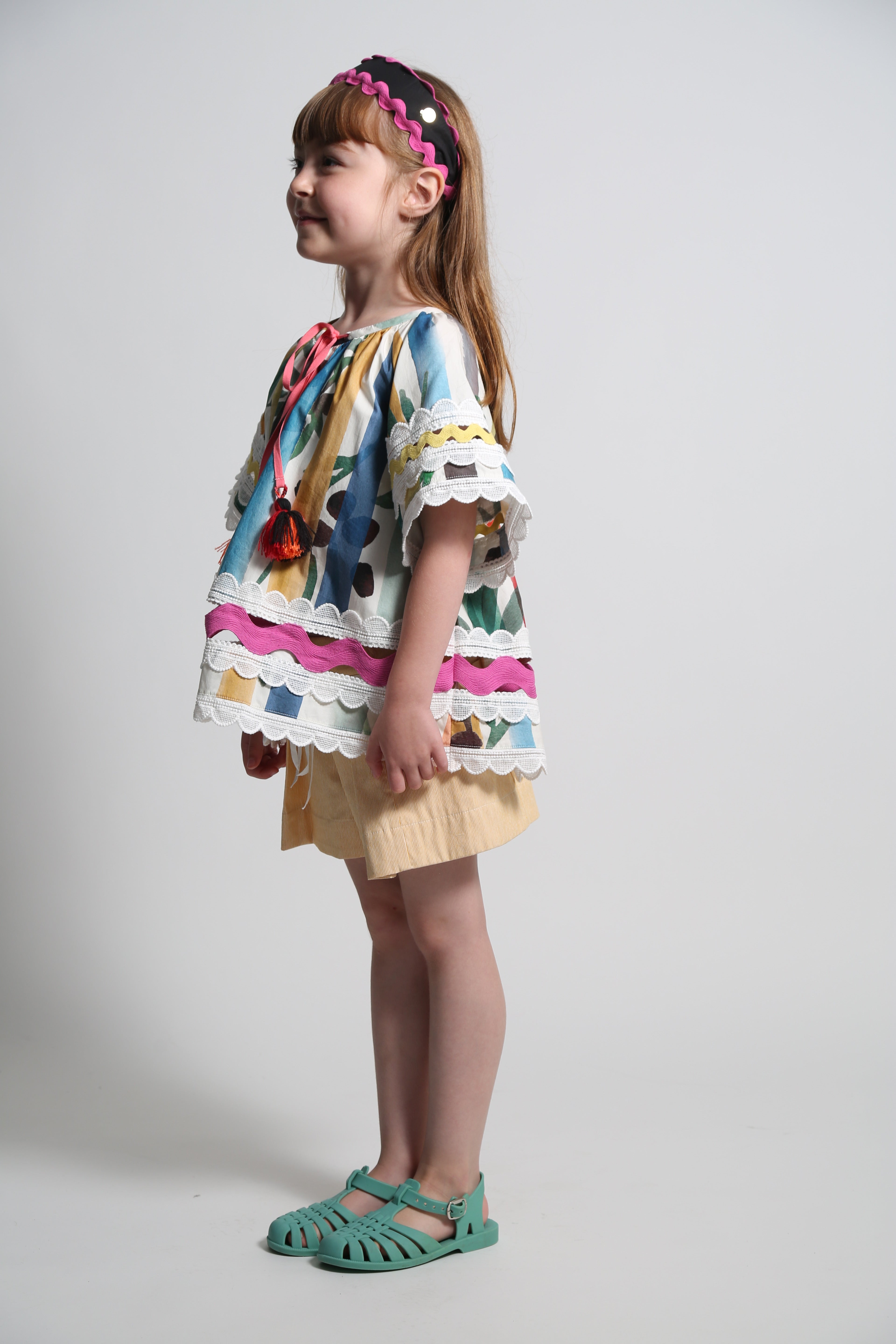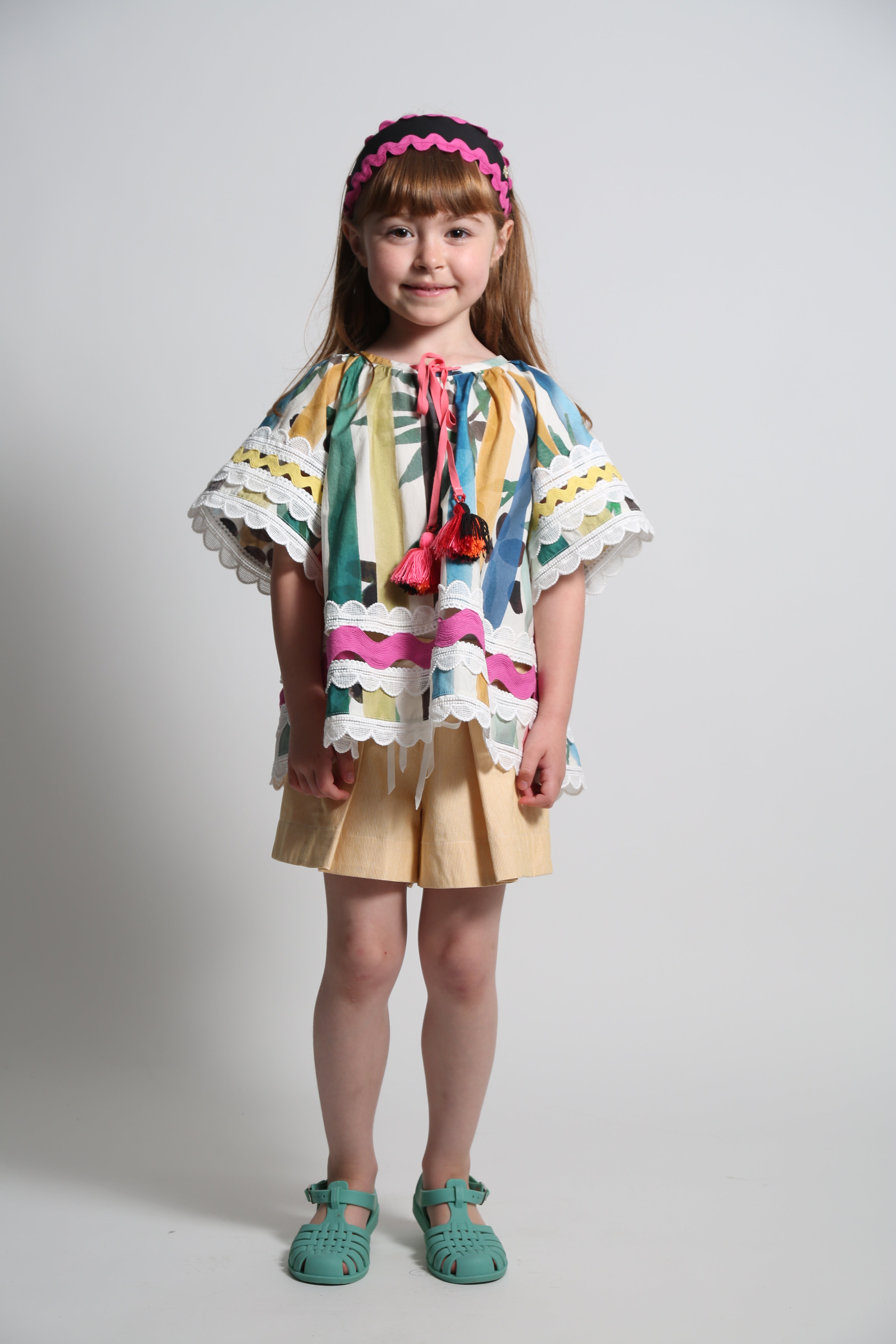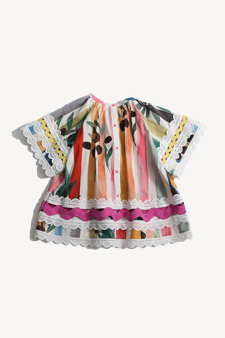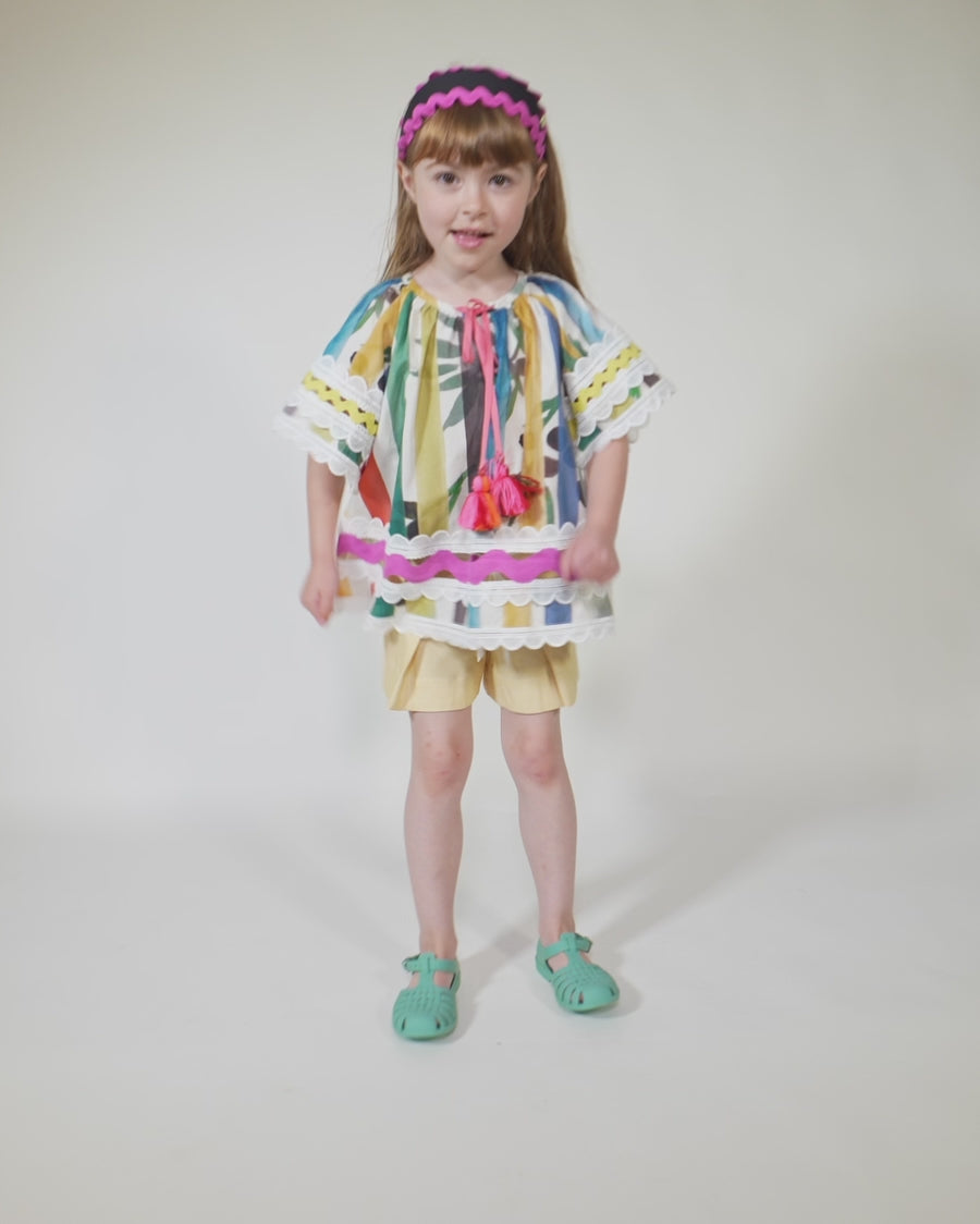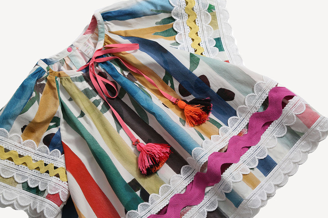 Radiating playful elegance, this girls tunic in the Garden of Peaceful Stripes print is certainly a colorful statement for her wardrobe! An easy breezy tunic shape with decorative feminine touches. Featuring billowing butterfly sleeves trimmed with delicate lace ribbon, and embellishments of vibrant ric rac ribbon, lace ribbon and sparkly macrame ribbon patchworked at the transparent panels at the sleeves and hems. The neckline is accented with bright ribbons and tassels to be left free or to tie into a sweet bow. A charming style for warm summer days and all day play, especially when paired with the Stella Walking Shorts.