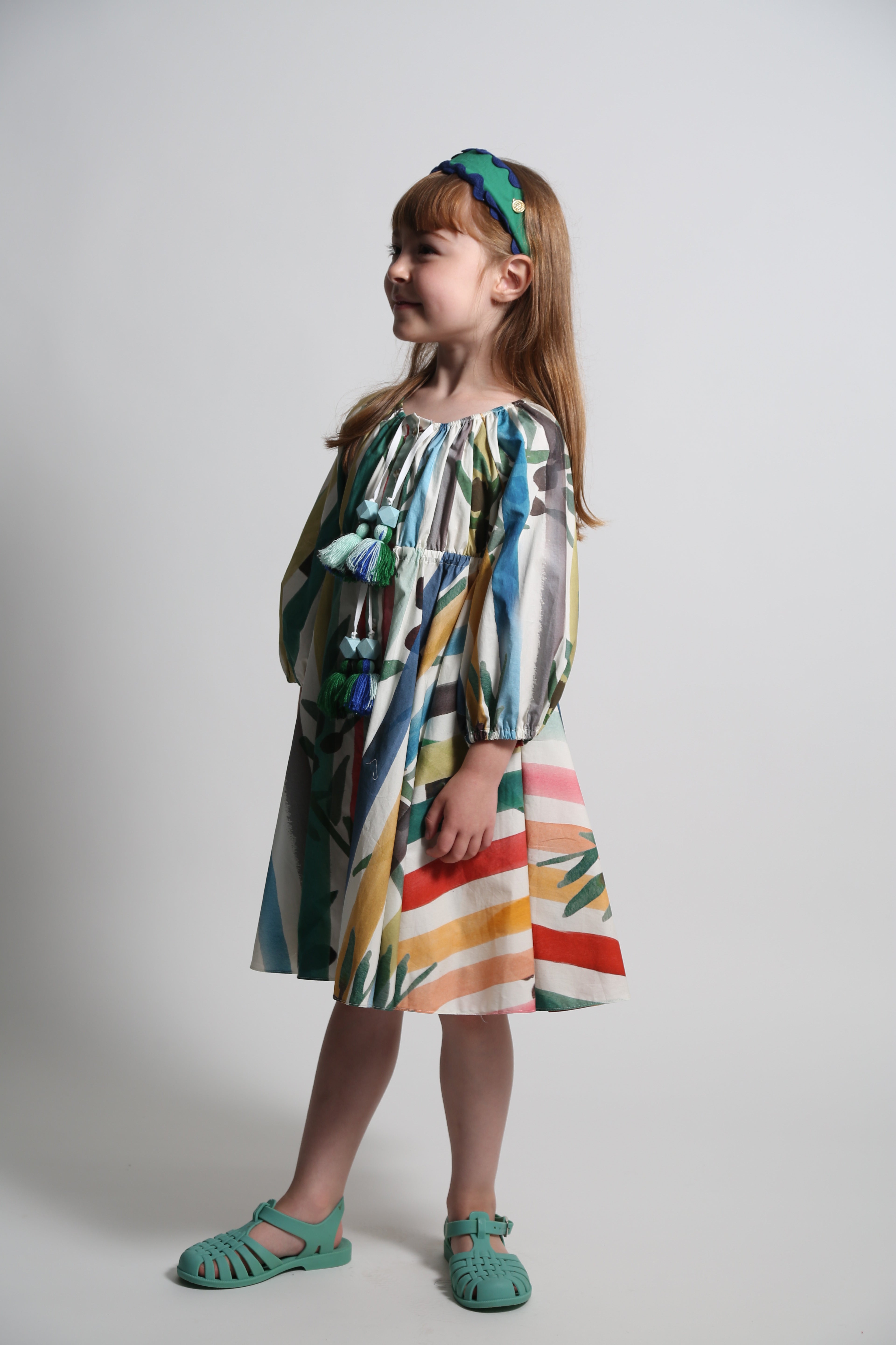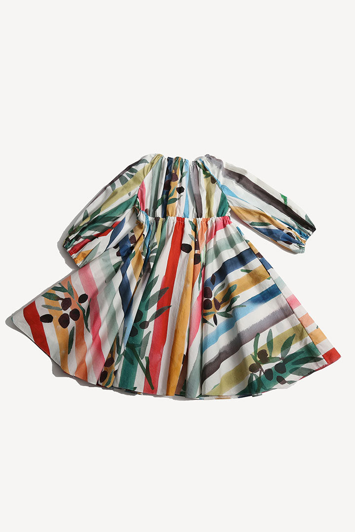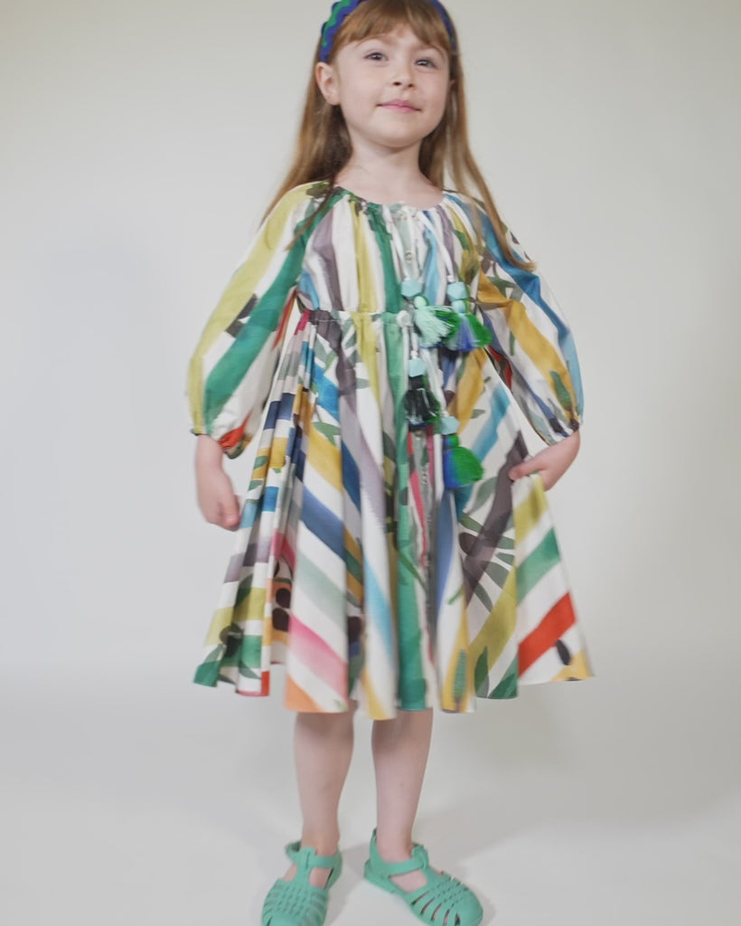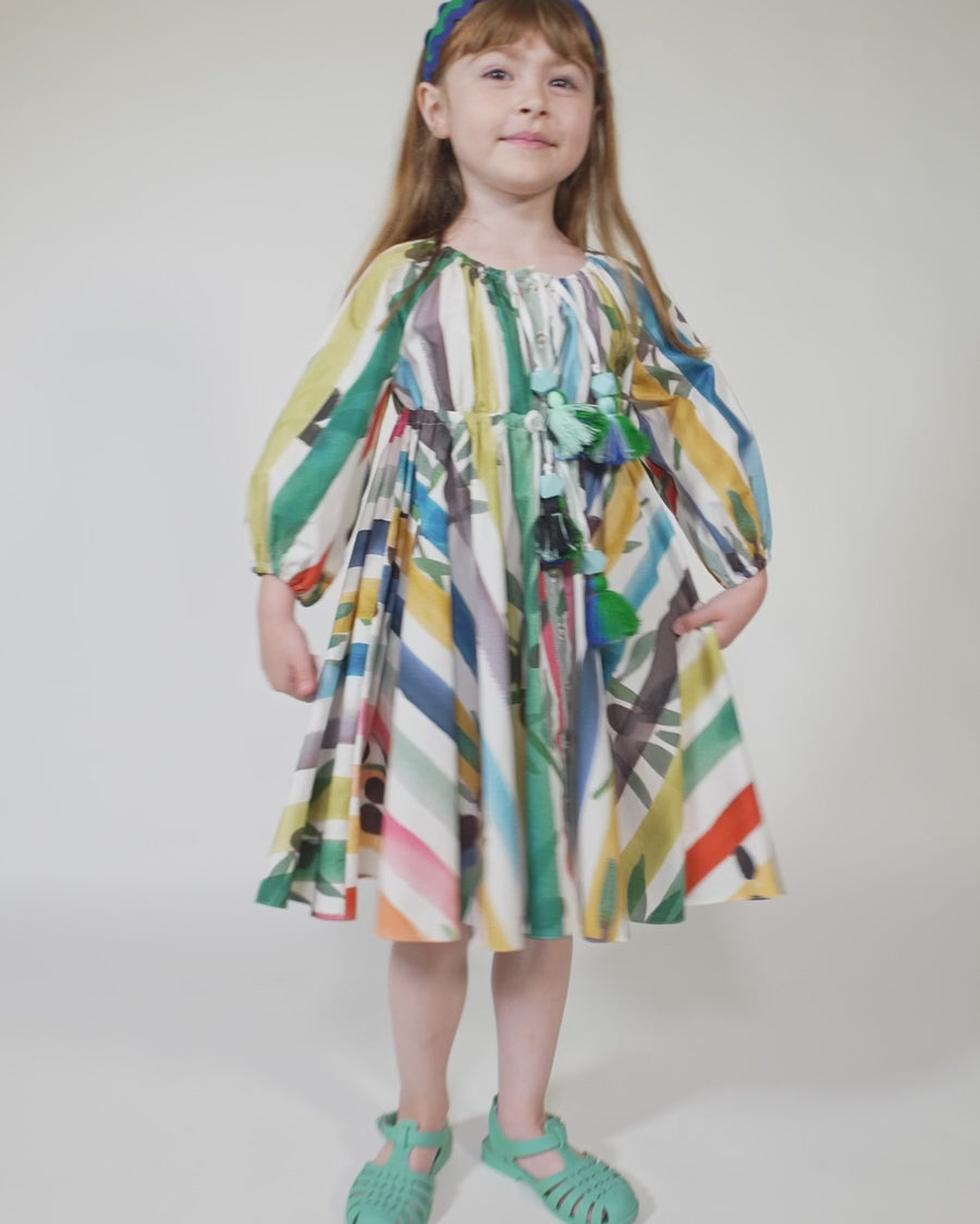 A charming shirt dress for her, made in the Garden of Peaceful Stripes print. This tea length twirl dress features buttons down the center front for easy dressing. Made complete with cinched 3/4 sleeves and a sweet ribbon tie and tassel detail at the elastic neckline and waistband. A cute style, perfect for both everyday wear and more formal occasions.
