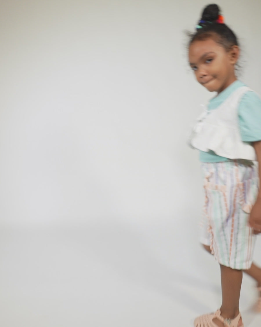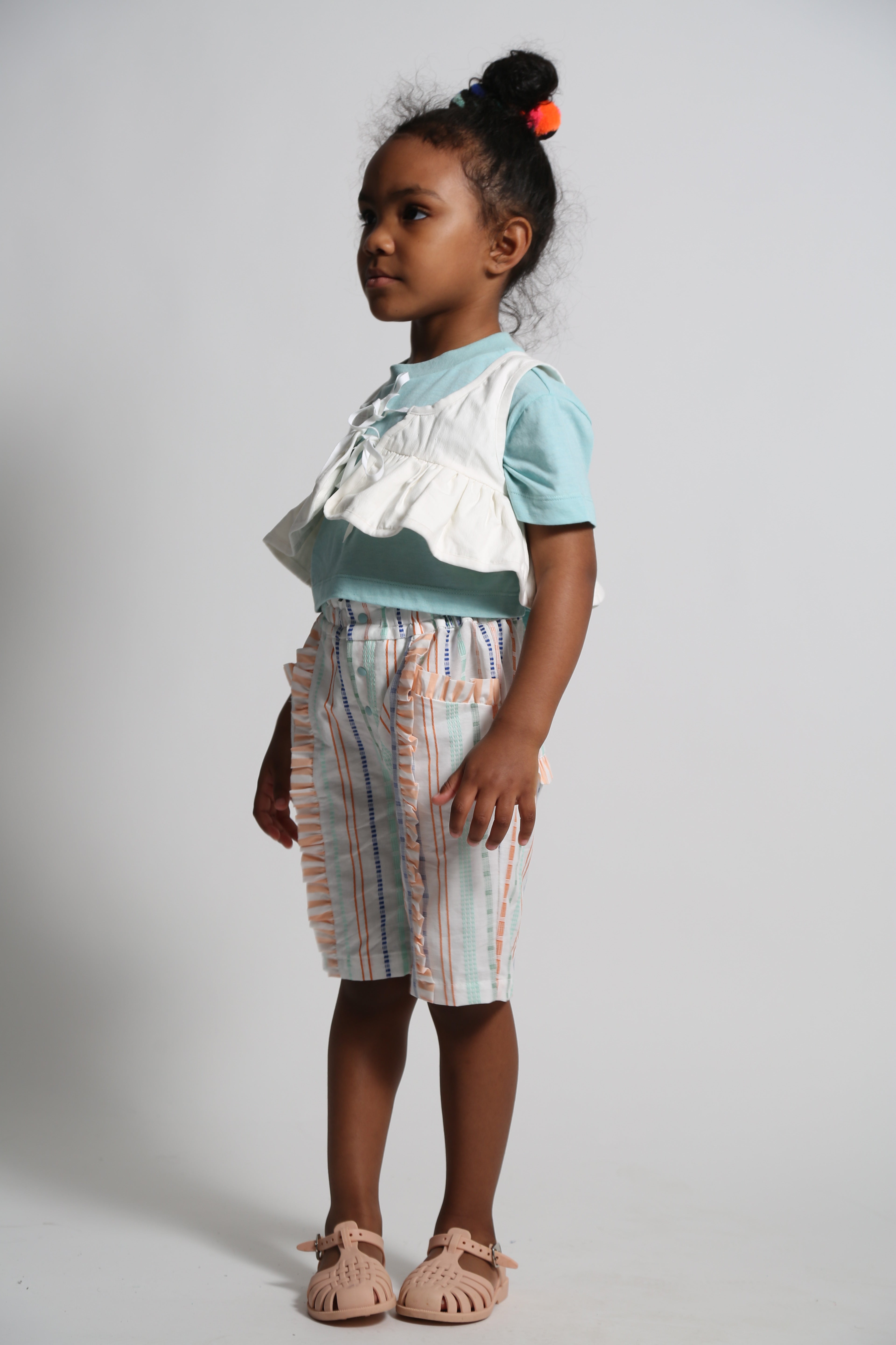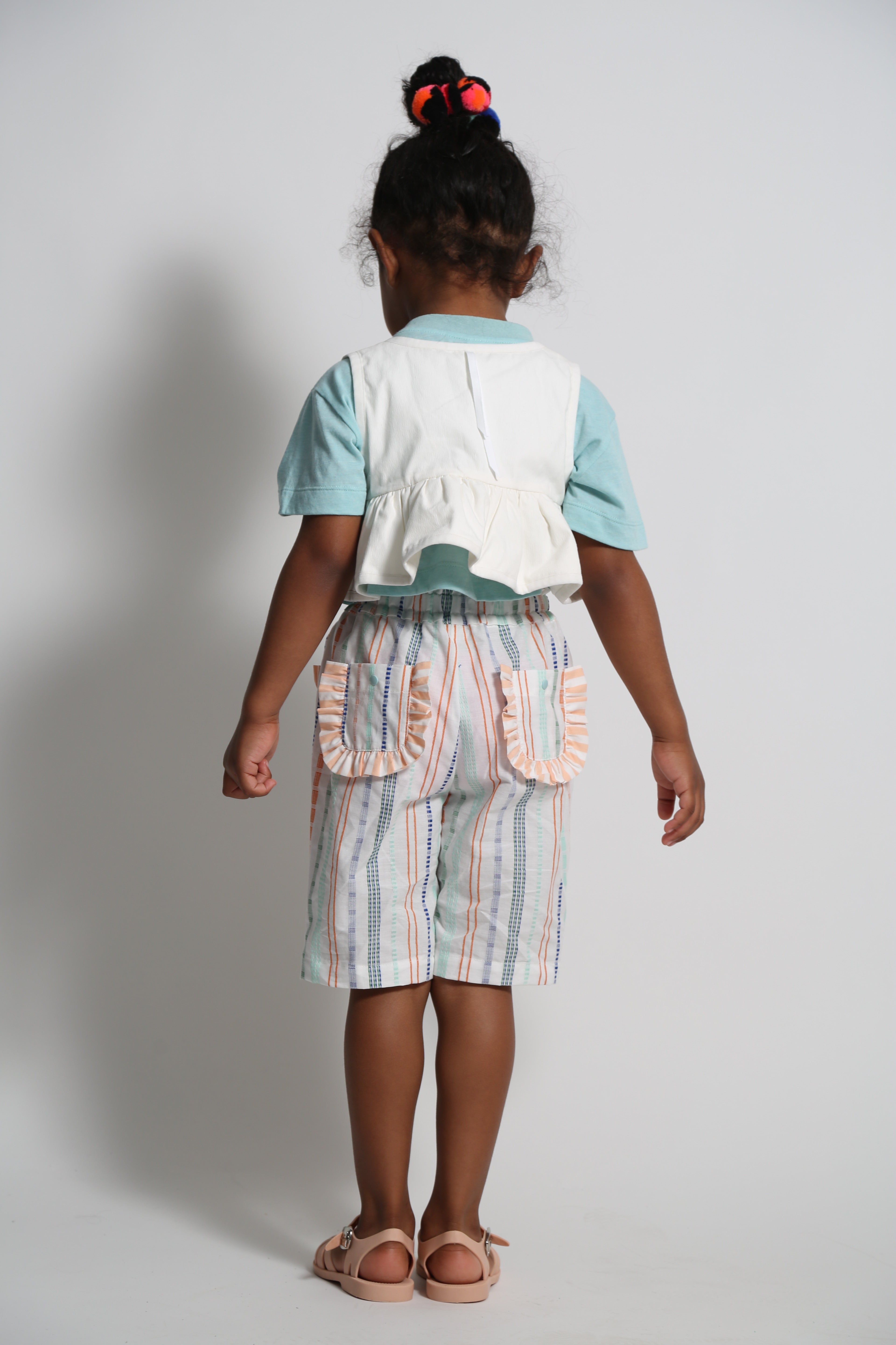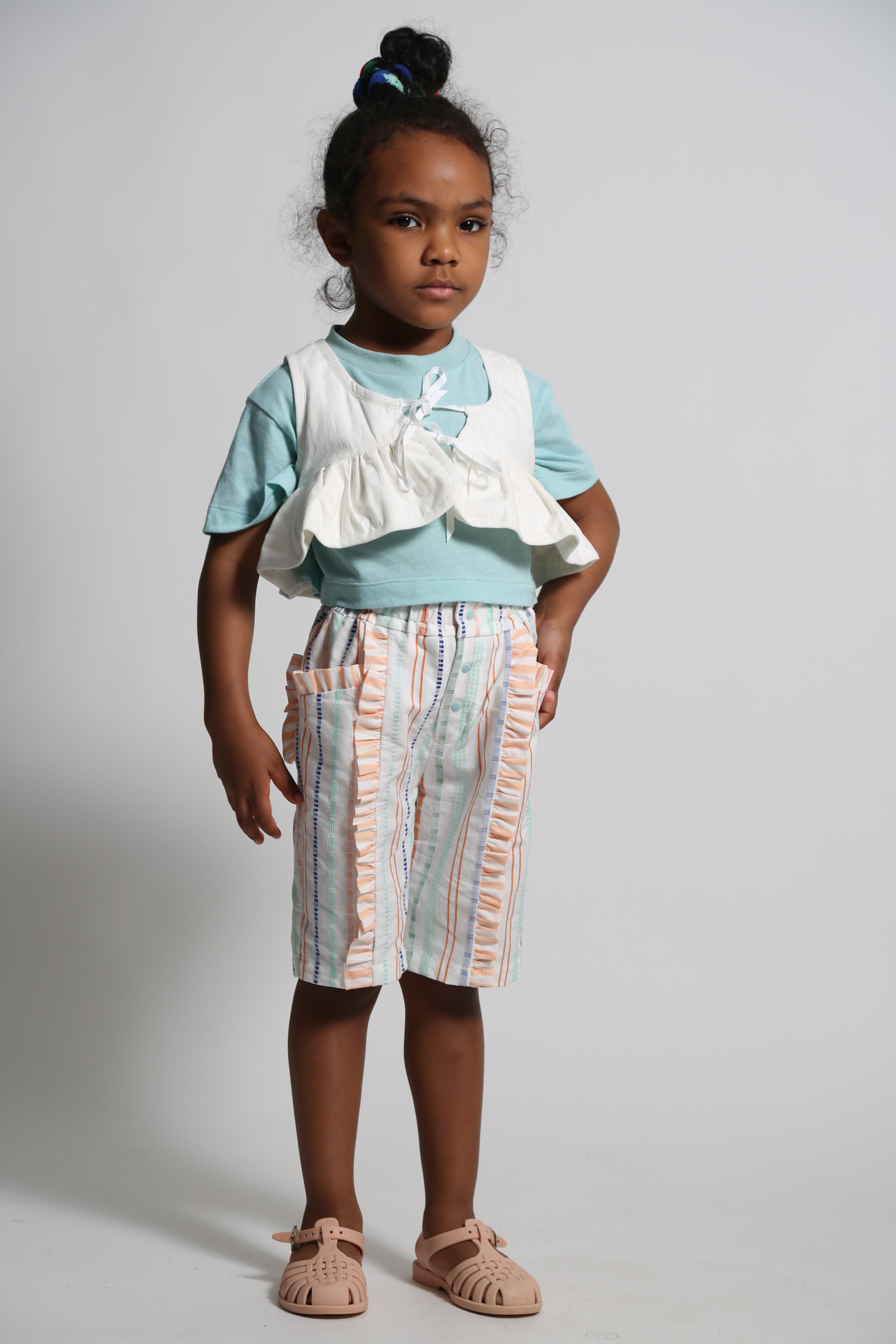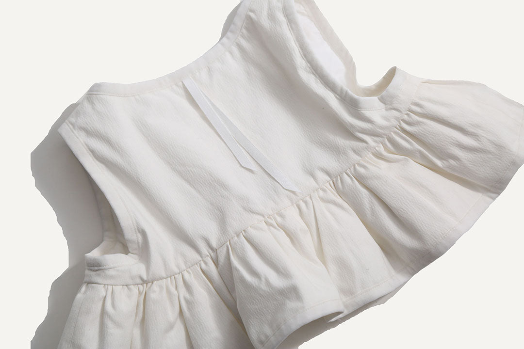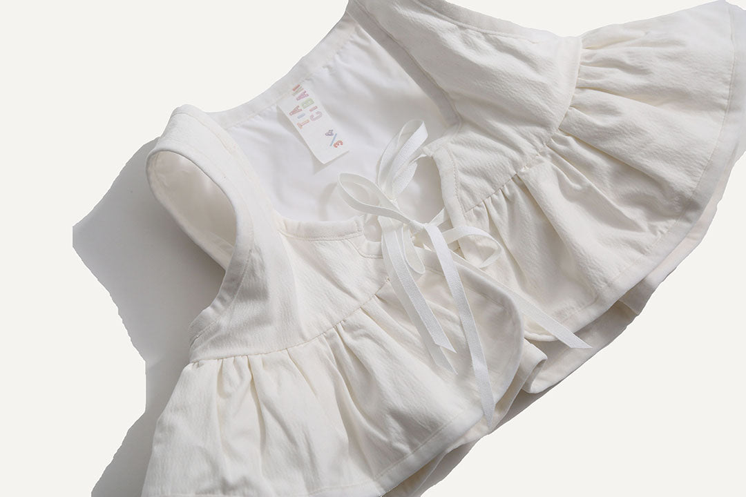 This girls vest adds a charming layer to any outfit with its sweet peplum flare at the hem. Featuring ribbon ties at the front for a secure closure and to tie into bow ties and binding tape ribbon finishing at all edges. Lined in cire and lightly padded, this vest is perfect for transitional weather and elevating everyday looks! Wear this vest over the Classic Smiley Cropped Tee for a sweet ensemble.