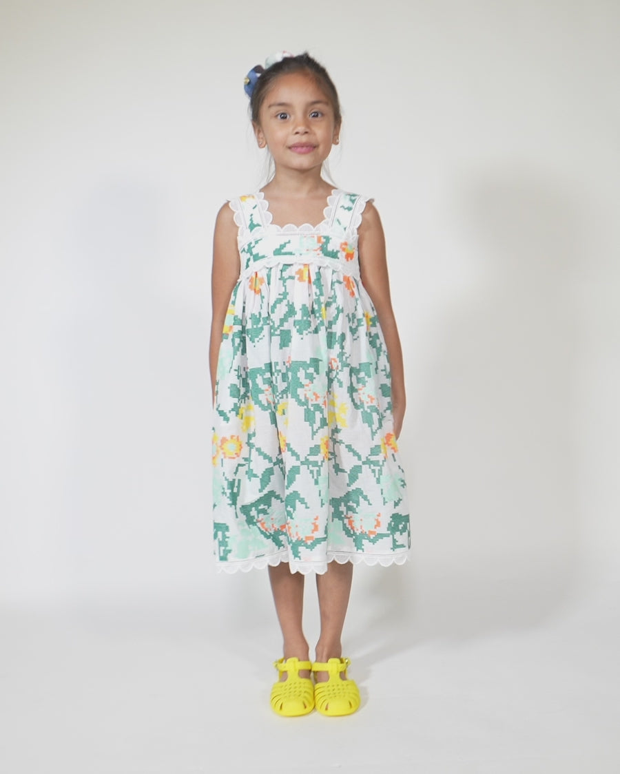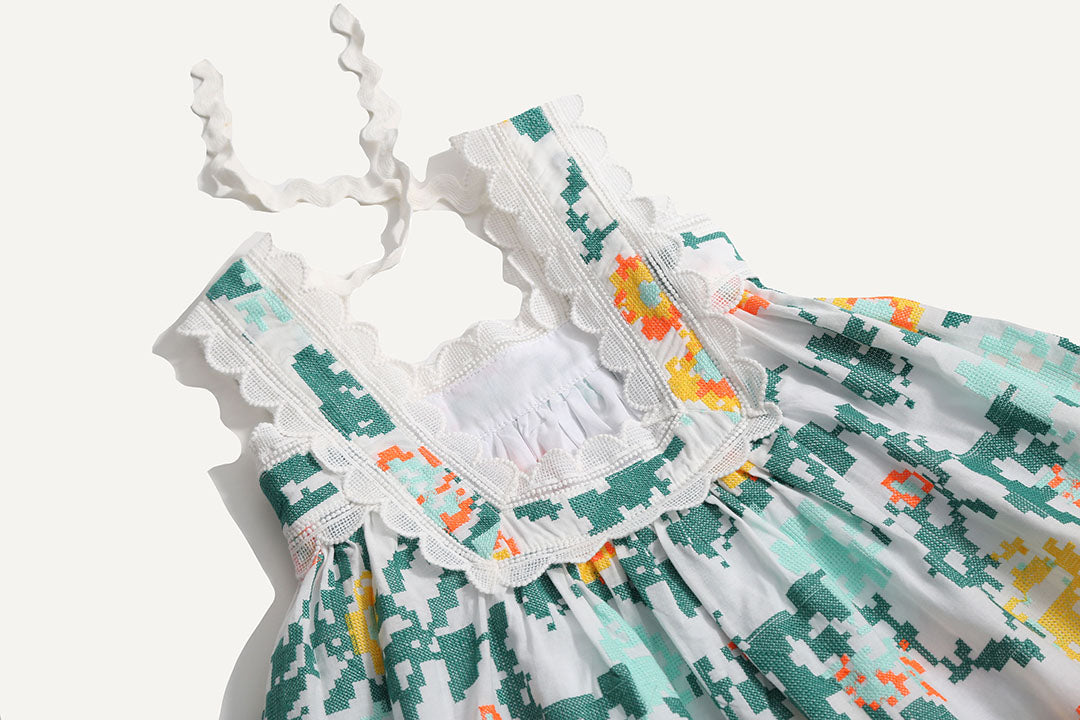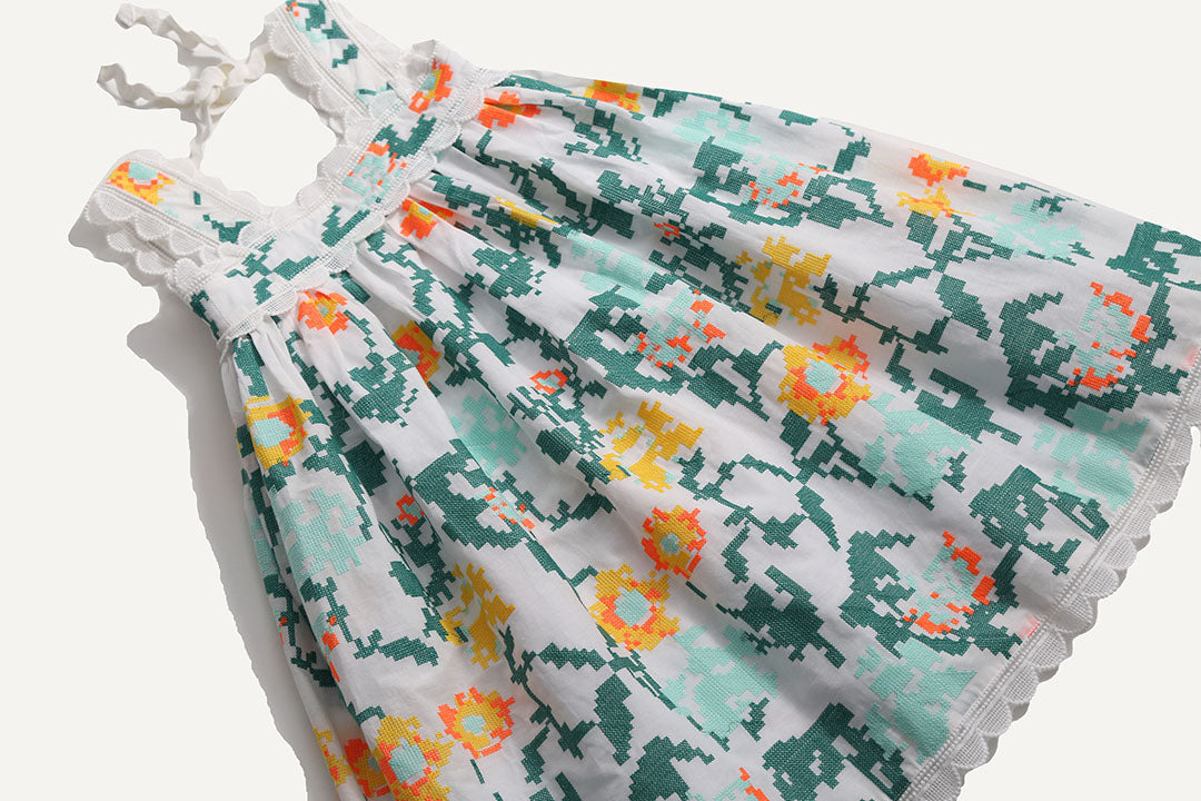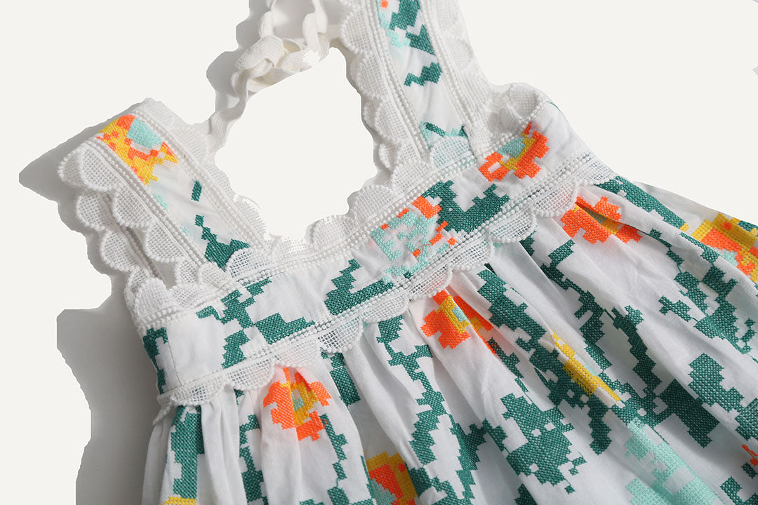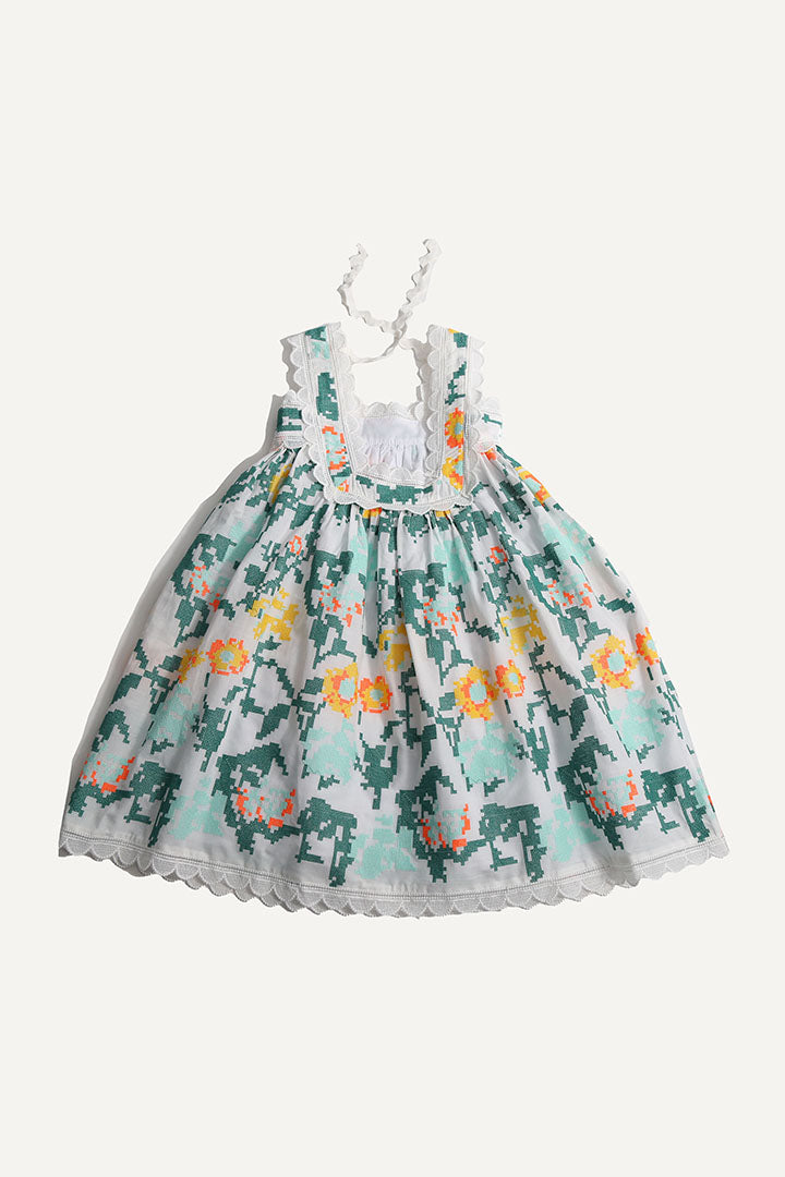 Embrace summer days with this breathtaking sundress! Expertly crafted from this season's Chloris Cross-Stitch Poplin, with a soft cotton base finished with an intricate embroidery pattern all over, making for a beautiful design. Tea length with convenient in-seam pockets and ric rac ribbon ties at the back of the elegant square neckline to tie into a sweet bow at the neck. The straps, chest, and hem are beautifully adorned with embroidered lace ribbon trim, finishing this already gorgeous style!