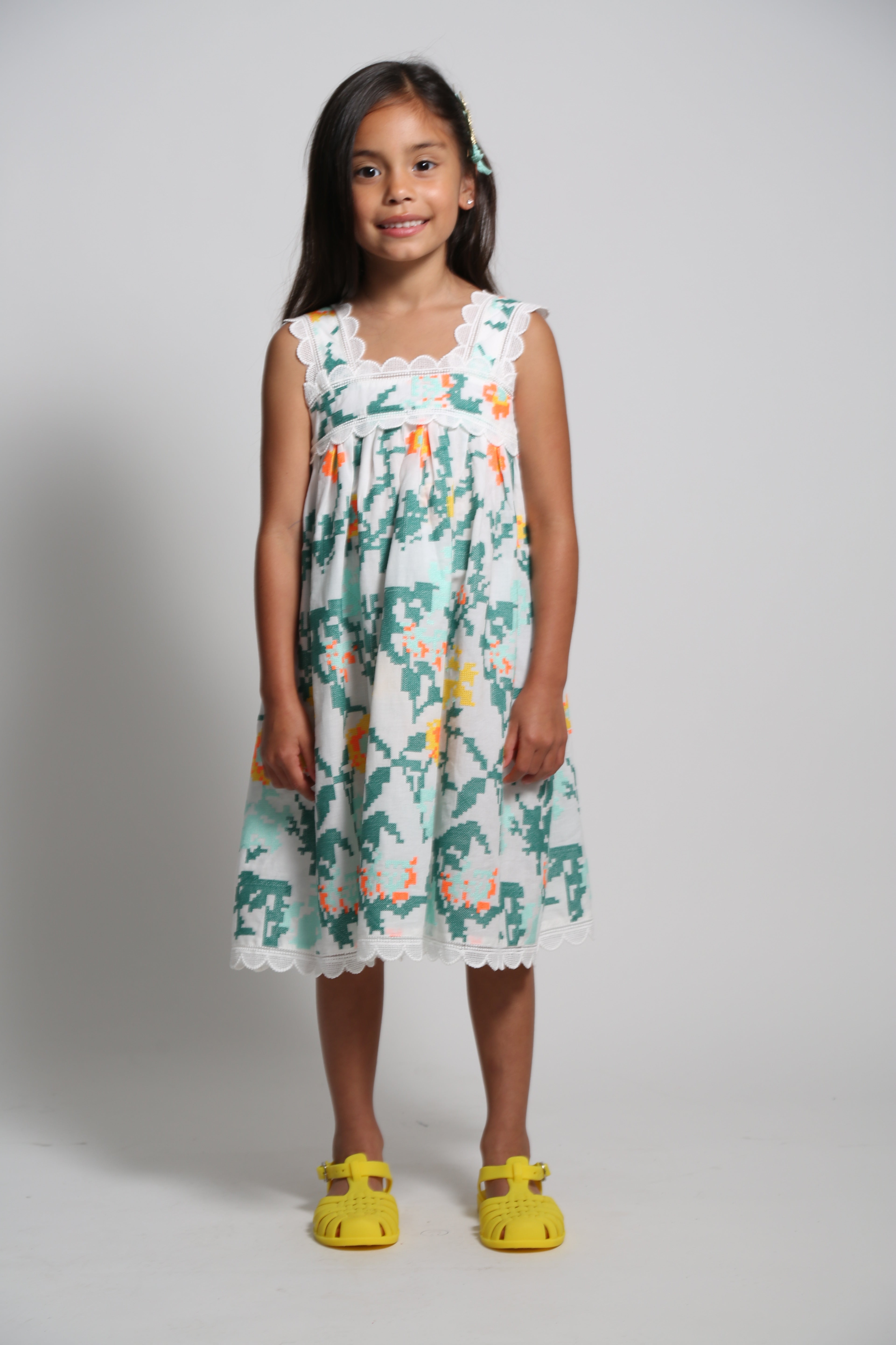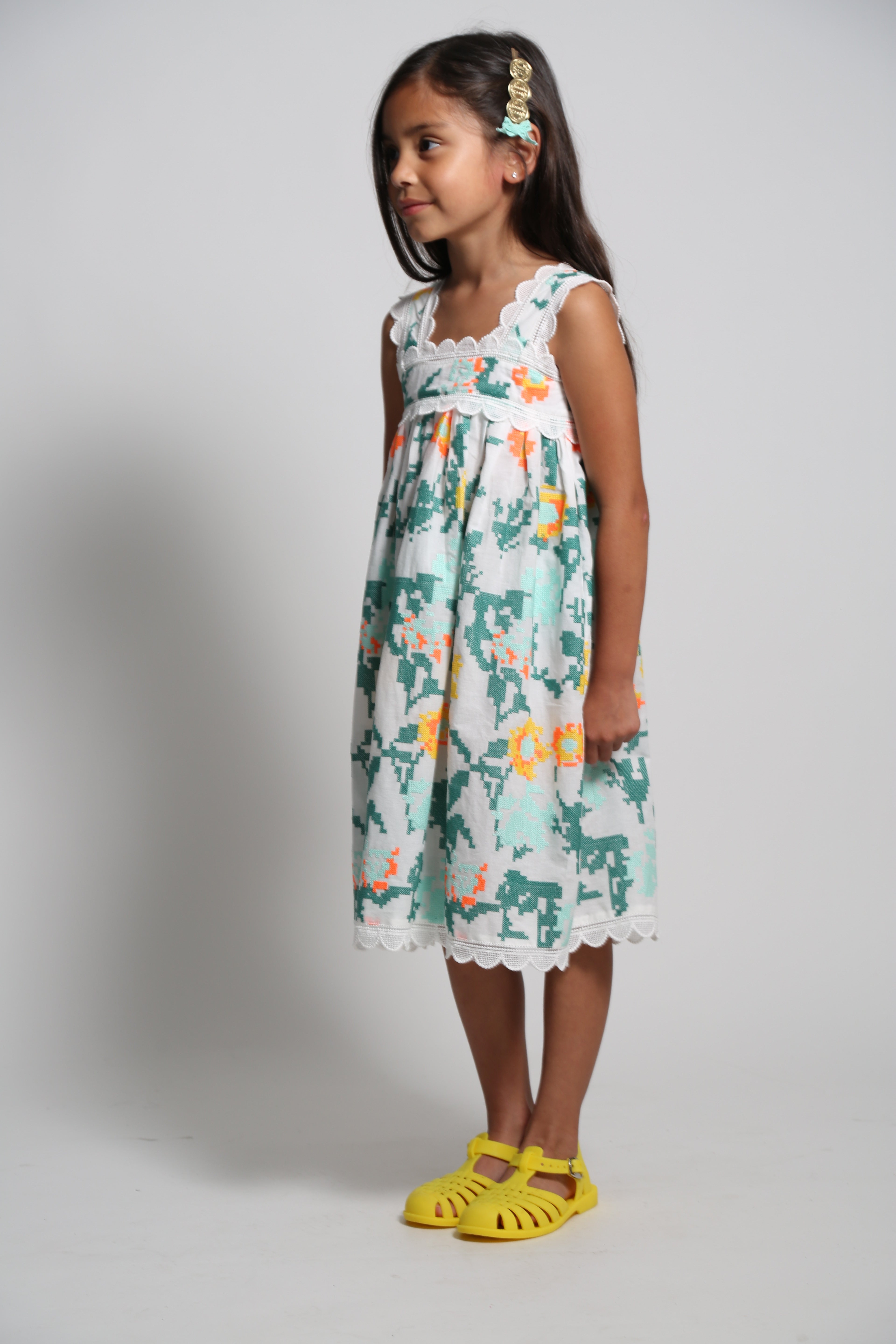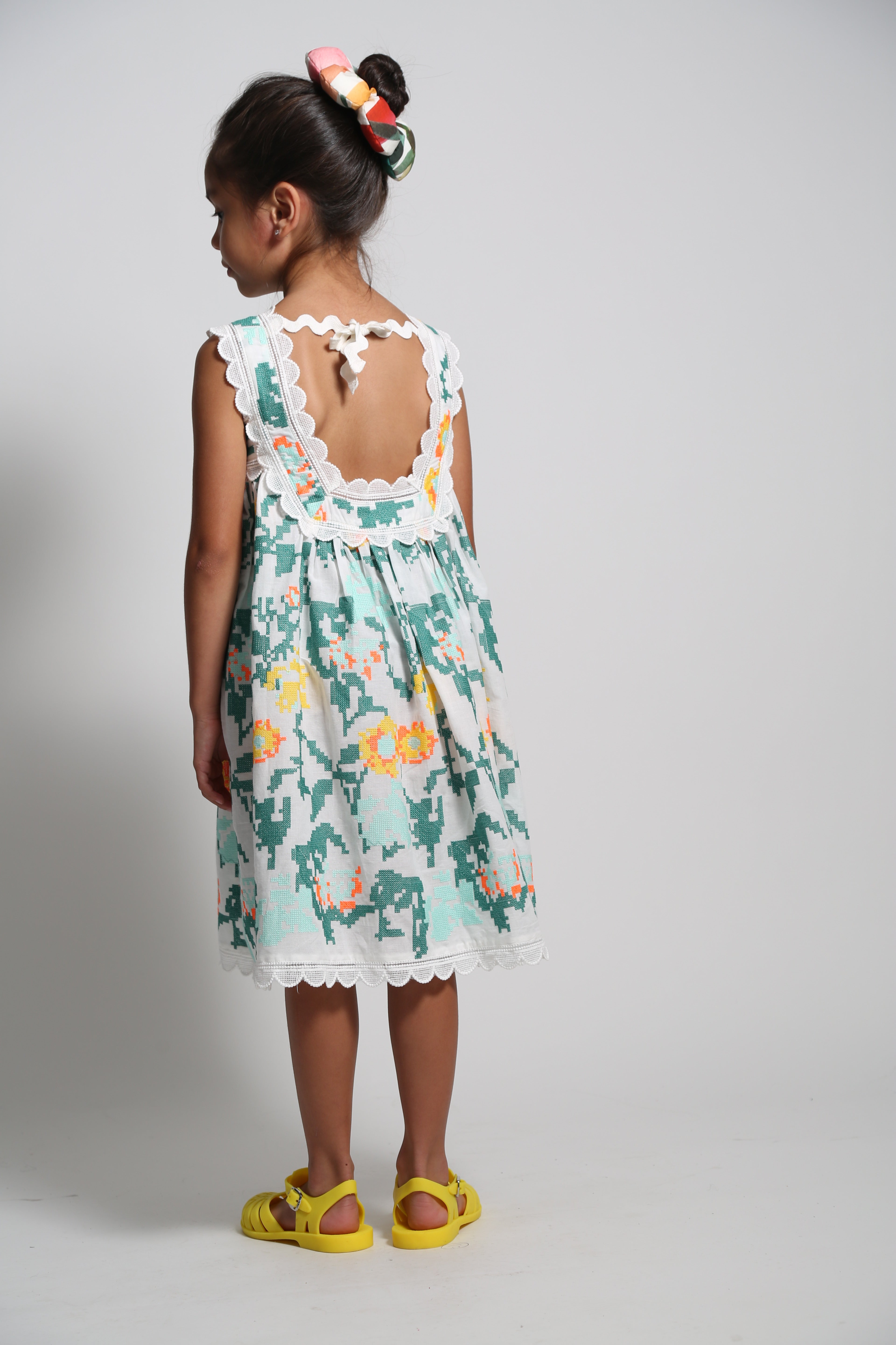 Embrace summer days with this breathtaking sundress! Expertly crafted from this season's Chloris Cross-Stitch Poplin, with a soft cotton base finished with an intricate embroidery pattern all over, making for a beautiful design. Tea length with convenient in-seam pockets and ric rac ribbon ties at the back of the elegant square neckline to tie into a sweet bow at the neck. The straps, chest, and hem are beautifully adorned with embroidered lace ribbon trim, finishing this already gorgeous style!