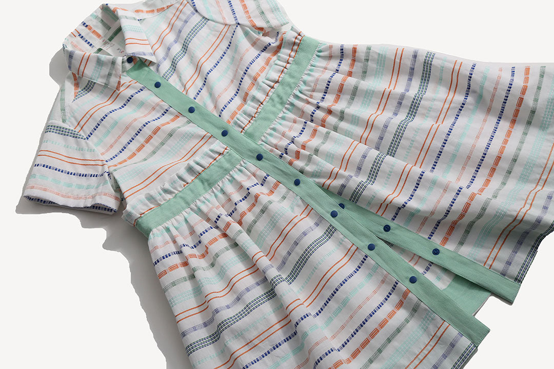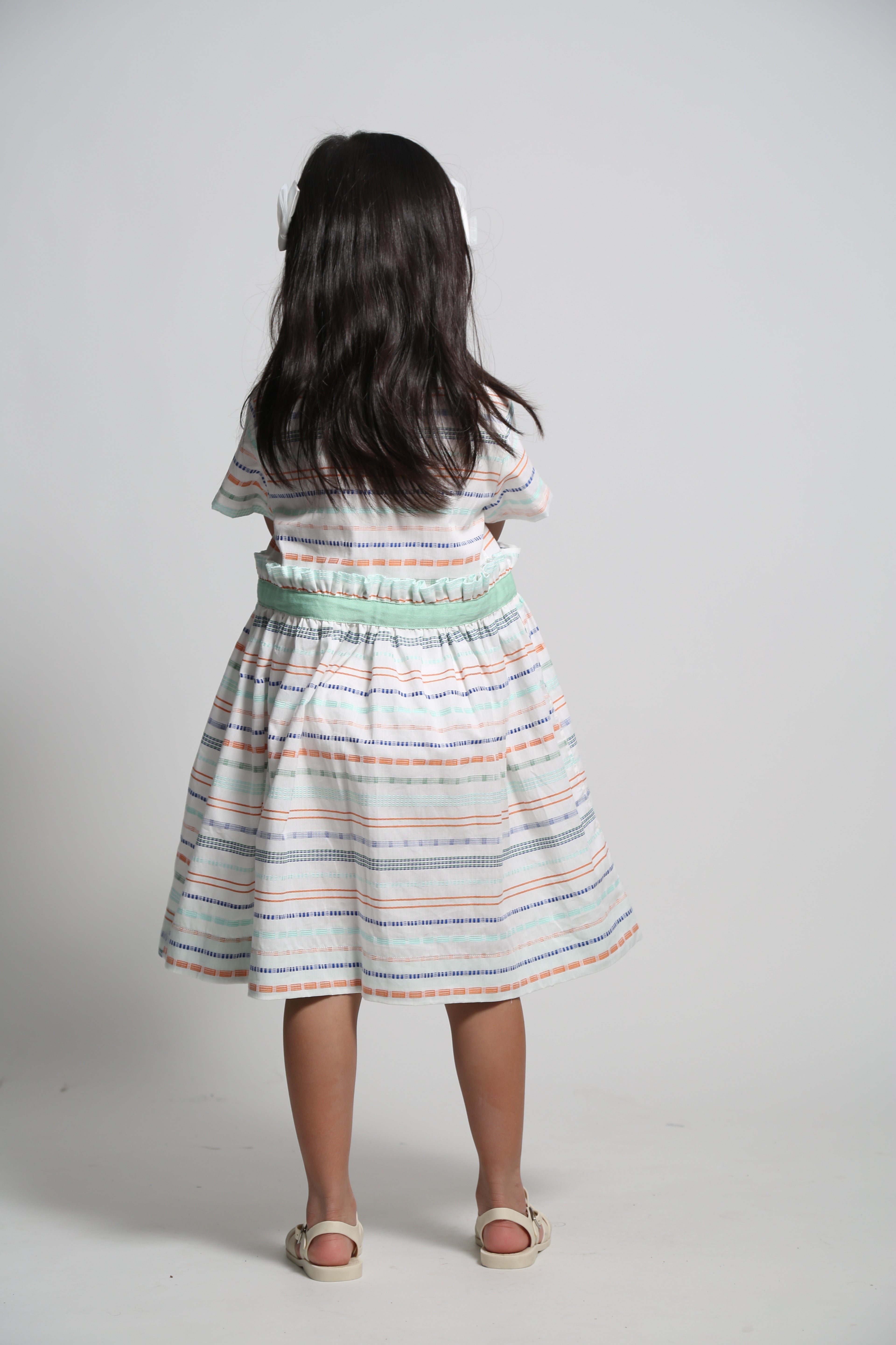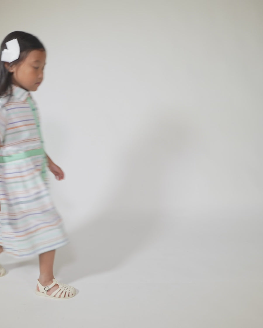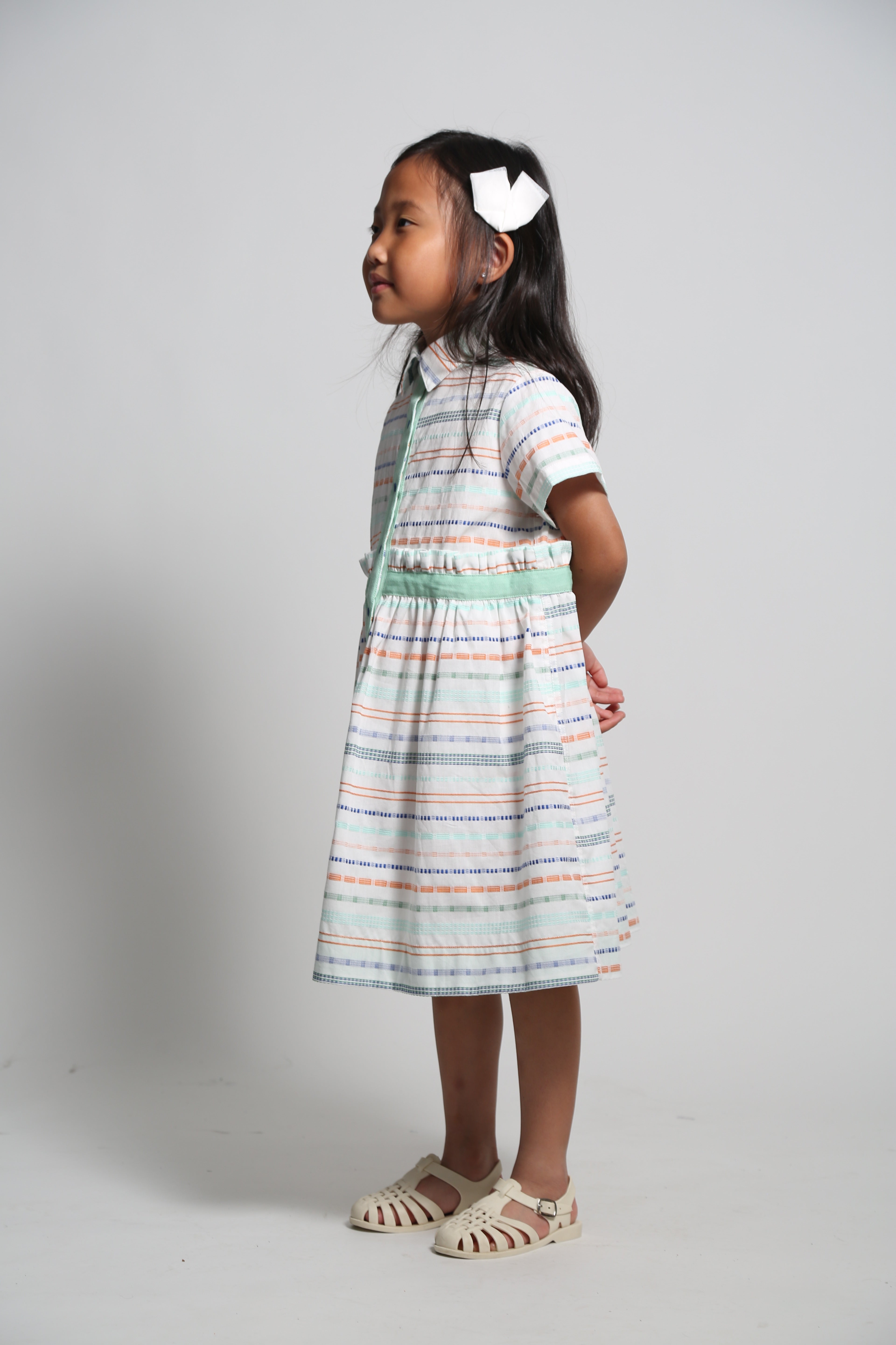 Made in the soft, cotton Paphos Stripe Shirting, this easy-fit, short-sleeve dress with ruffles at the waist makes for the cutest flared silhouette season after season. A high peter pan collar frock featuring a snap button closure and ribbon down the front and waistline, the Pia Ruffled Frock is versatile, perfect for everyday school play or for more occasional settings.