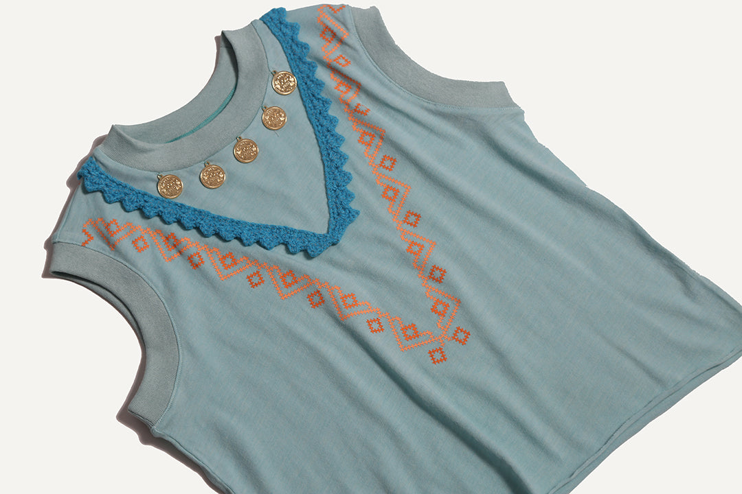 This girl’s sleeveless ultra-fine jersey tee is a perfect blend of comfort and style for everyday wear. Adorned with playful crochet and geometric screen printing that runs from the front to the back of the neckline, adding a fun touch. The ribbed collar is beautifully surrounded by charming coins, making for a unique detail. With a relaxed box fit, this tee ensures a comfortable fit that’s perfect for warm weather moments!
