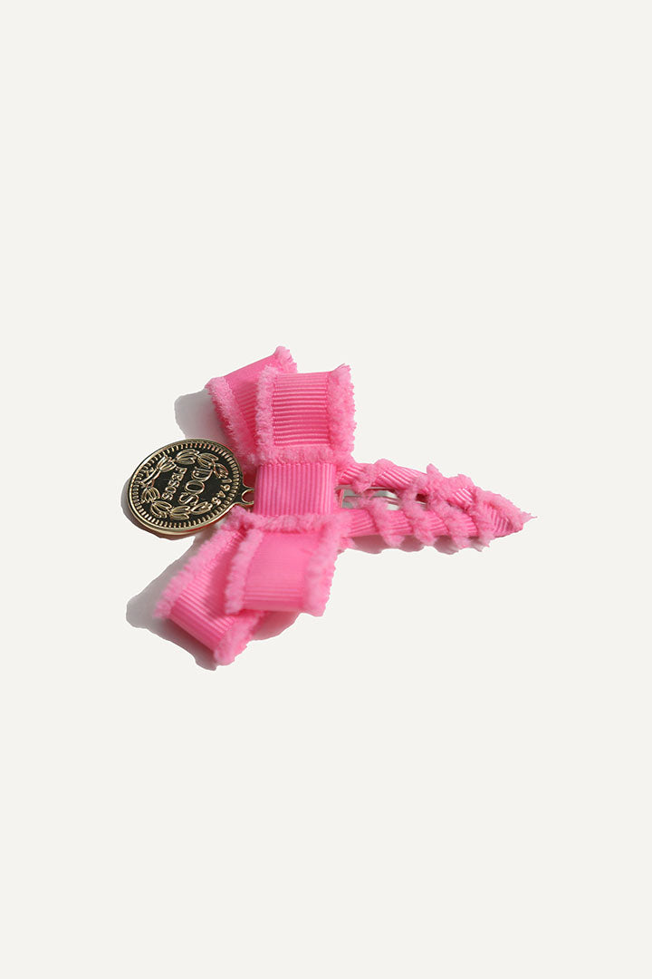 Add a touch of sparkle to your child's hairstyle with this bow hair clip. The bright pink ribbon is beautifully tied into a layered bow at the top of the metal hair clip. Finished with a decorative gold coin, this clip is the perfect accessory to elevate any outfit!