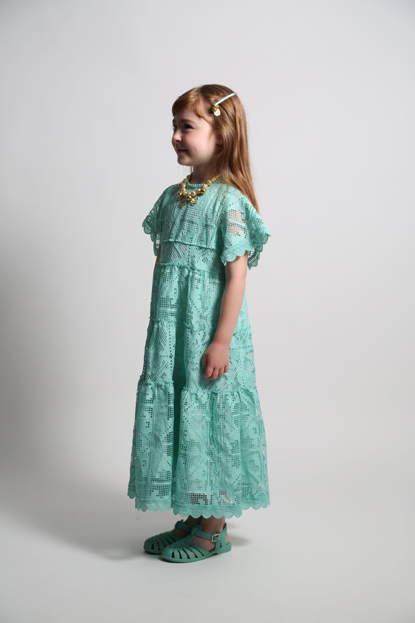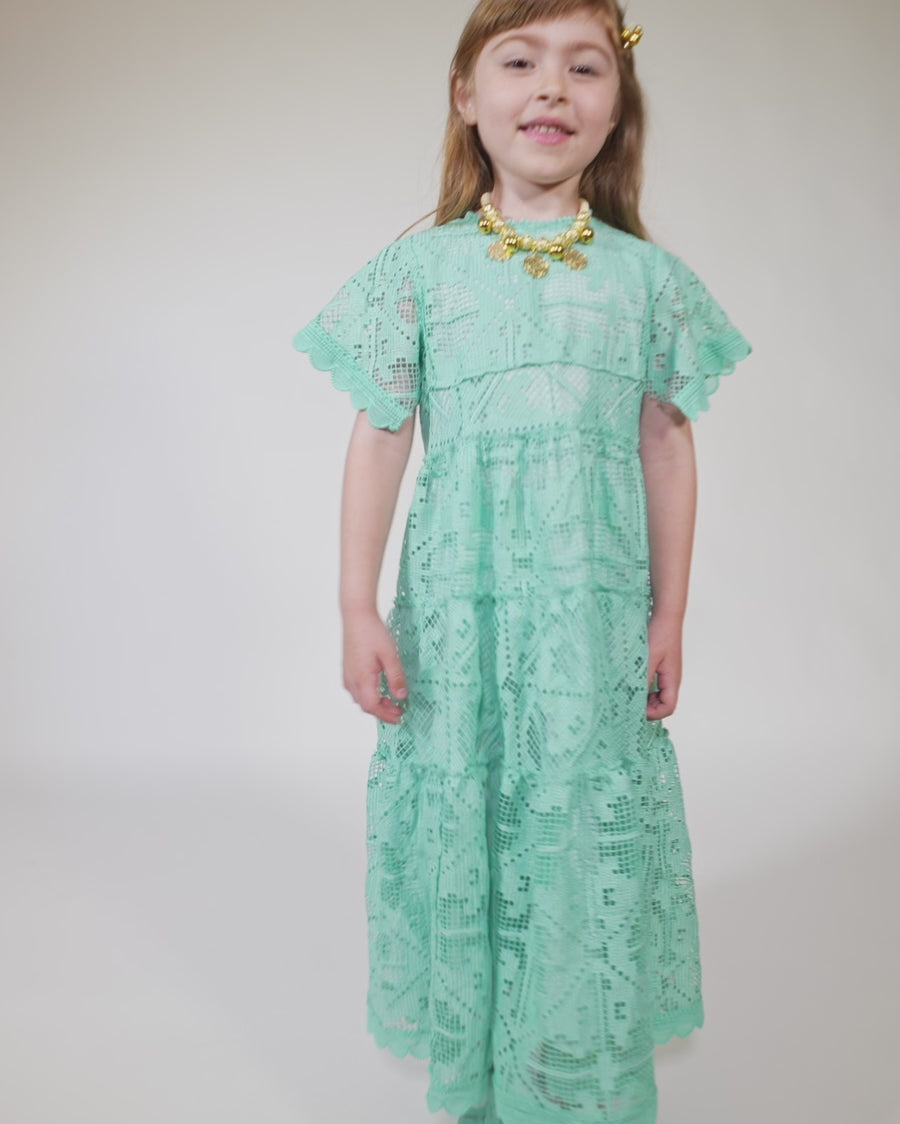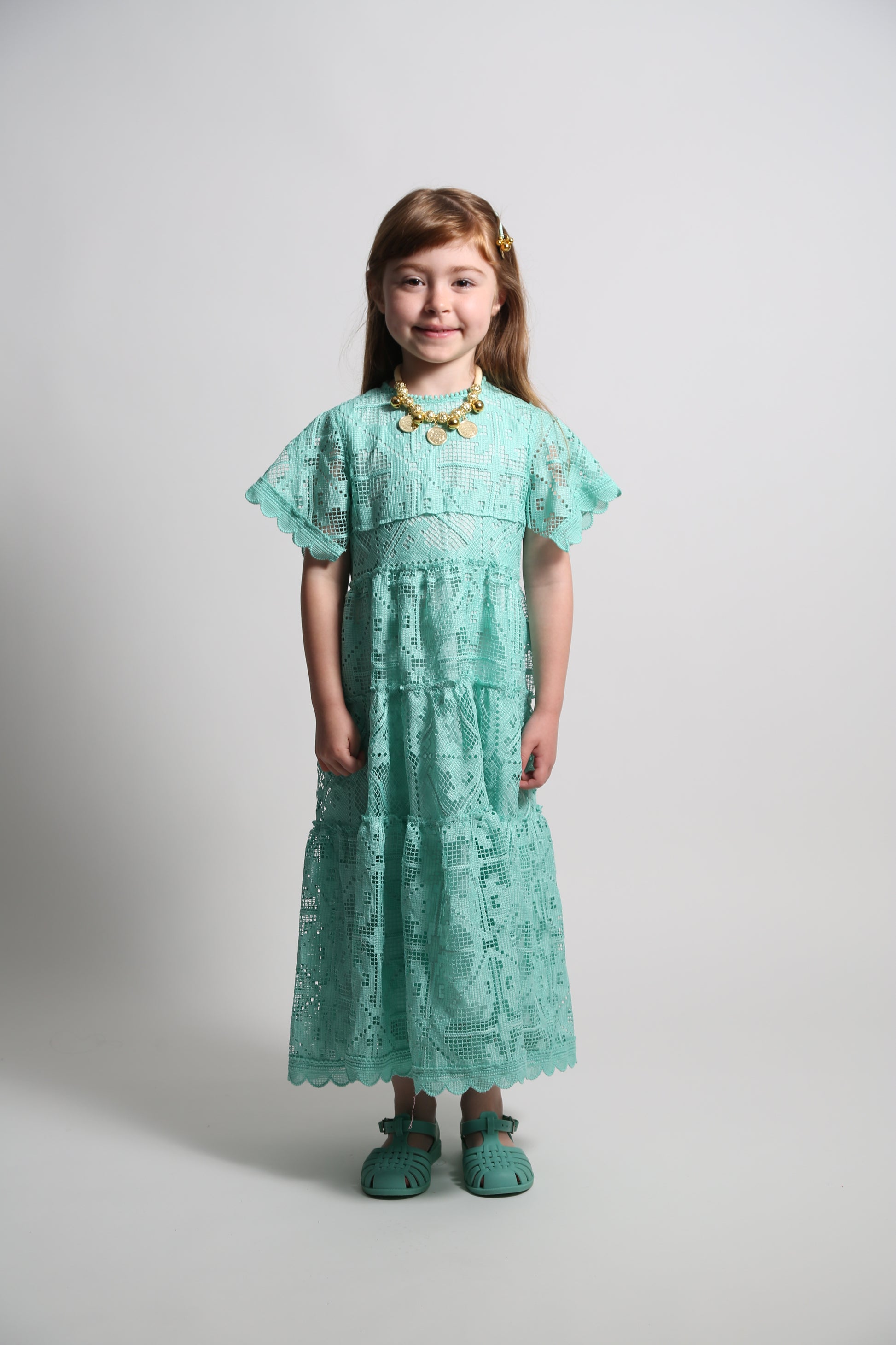 An enchanting full-length gown, crafted in the dreamy Lefkara Embroidered Lace, and designed to make your little one feel like a princess. This tiered maxi features a classic crew neckline beautifully trimmed with bobble detailing. Each tier features playfully patchworked lace panels, creating a stunning visual effect that is sure to turn heads. A keyhole and button loop closure at the back, complemented by a modesty lip ribbon, ensures an ease of dressing. The gown is finished with square unlined sleeves and a hem embellished with embroidered scalloped ribbon, making it a truly exquisite choice for special occasions.