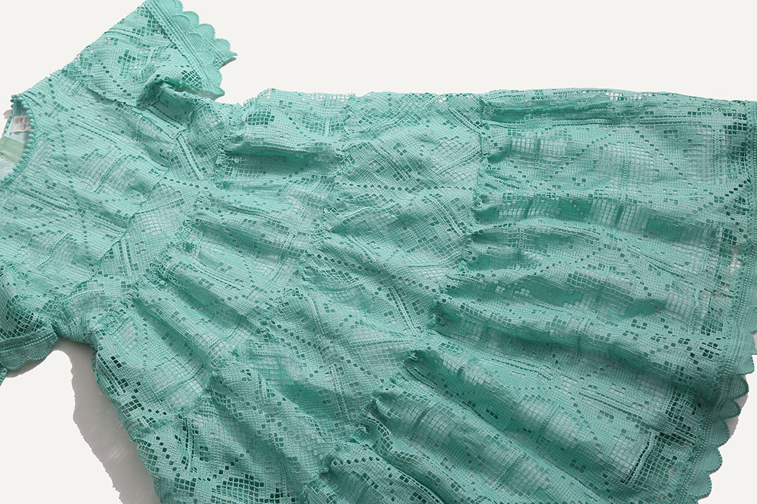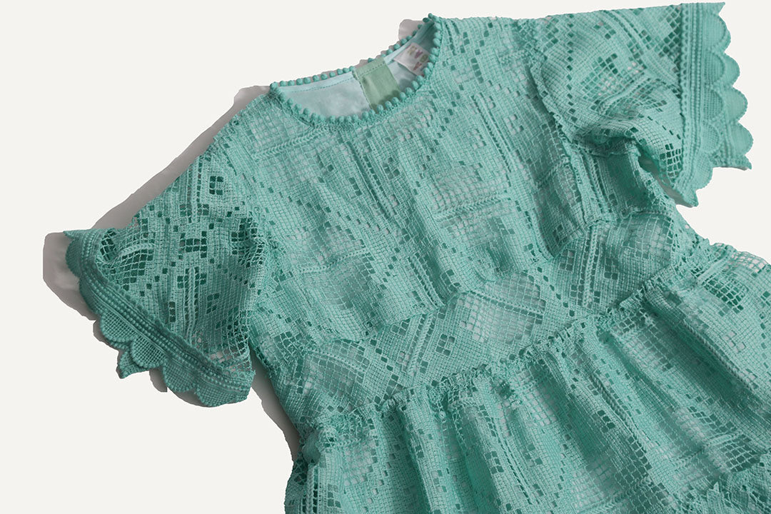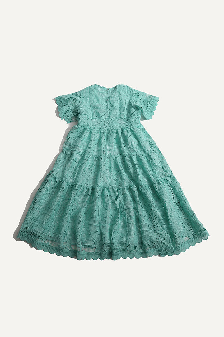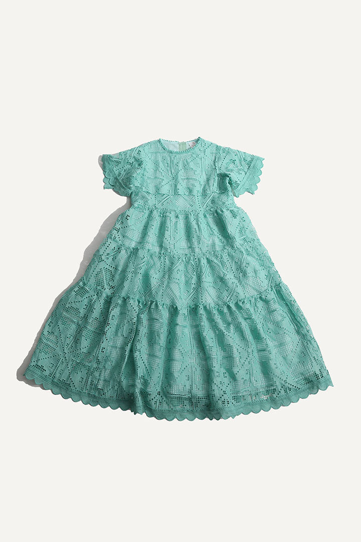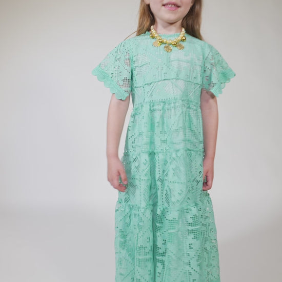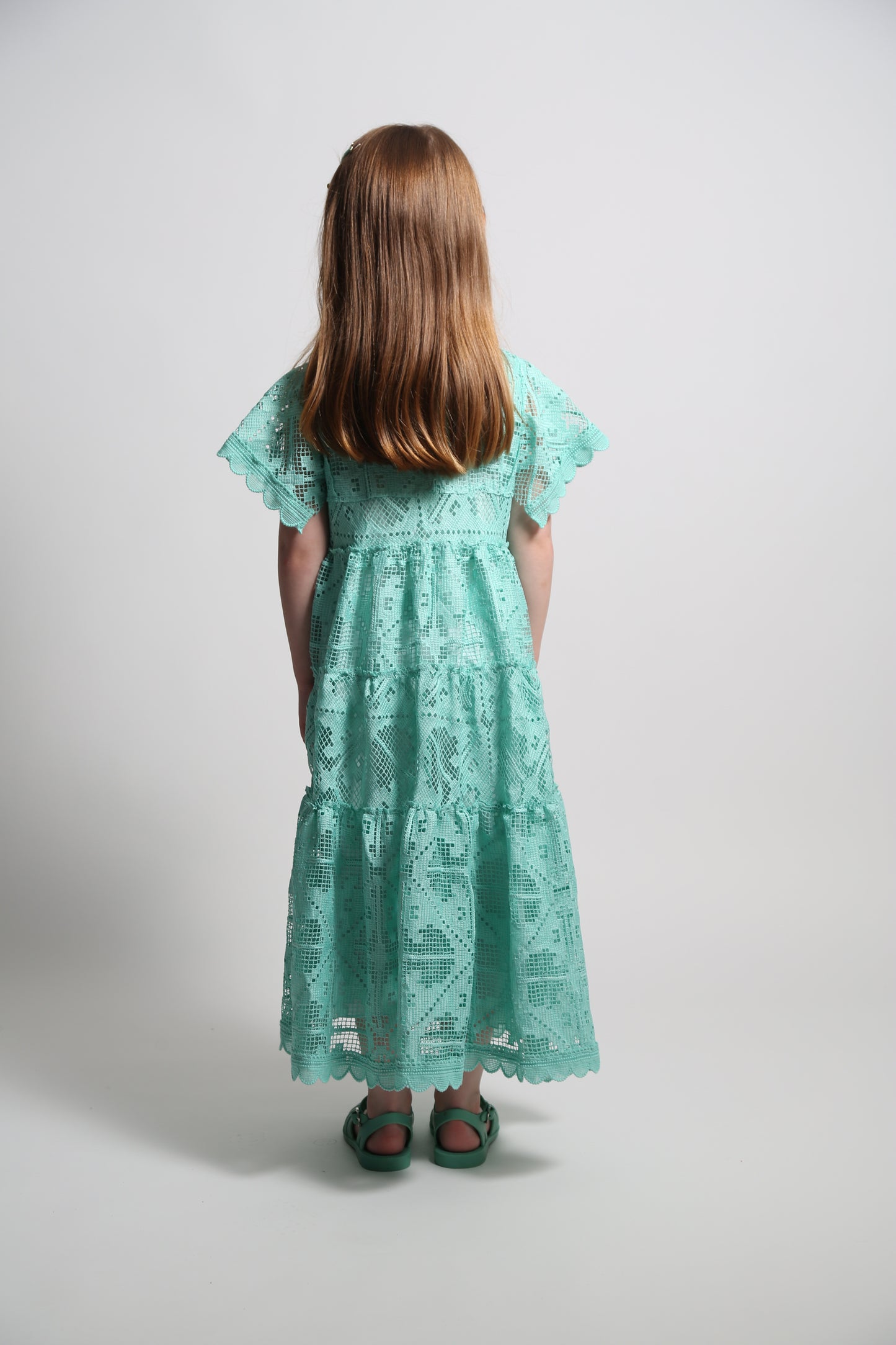 An enchanting full-length gown, crafted in the dreamy Lefkara Embroidered Lace, and designed to make your little one feel like a princess. This tiered maxi features a classic crew neckline beautifully trimmed with bobble detailing. Each tier features playfully patchworked lace panels, creating a stunning visual effect that is sure to turn heads. A keyhole and button loop closure at the back, complemented by a modesty lip ribbon, ensures an ease of dressing. The gown is finished with square unlined sleeves and a hem embellished with embroidered scalloped ribbon, making it a truly exquisite choice for special occasions.