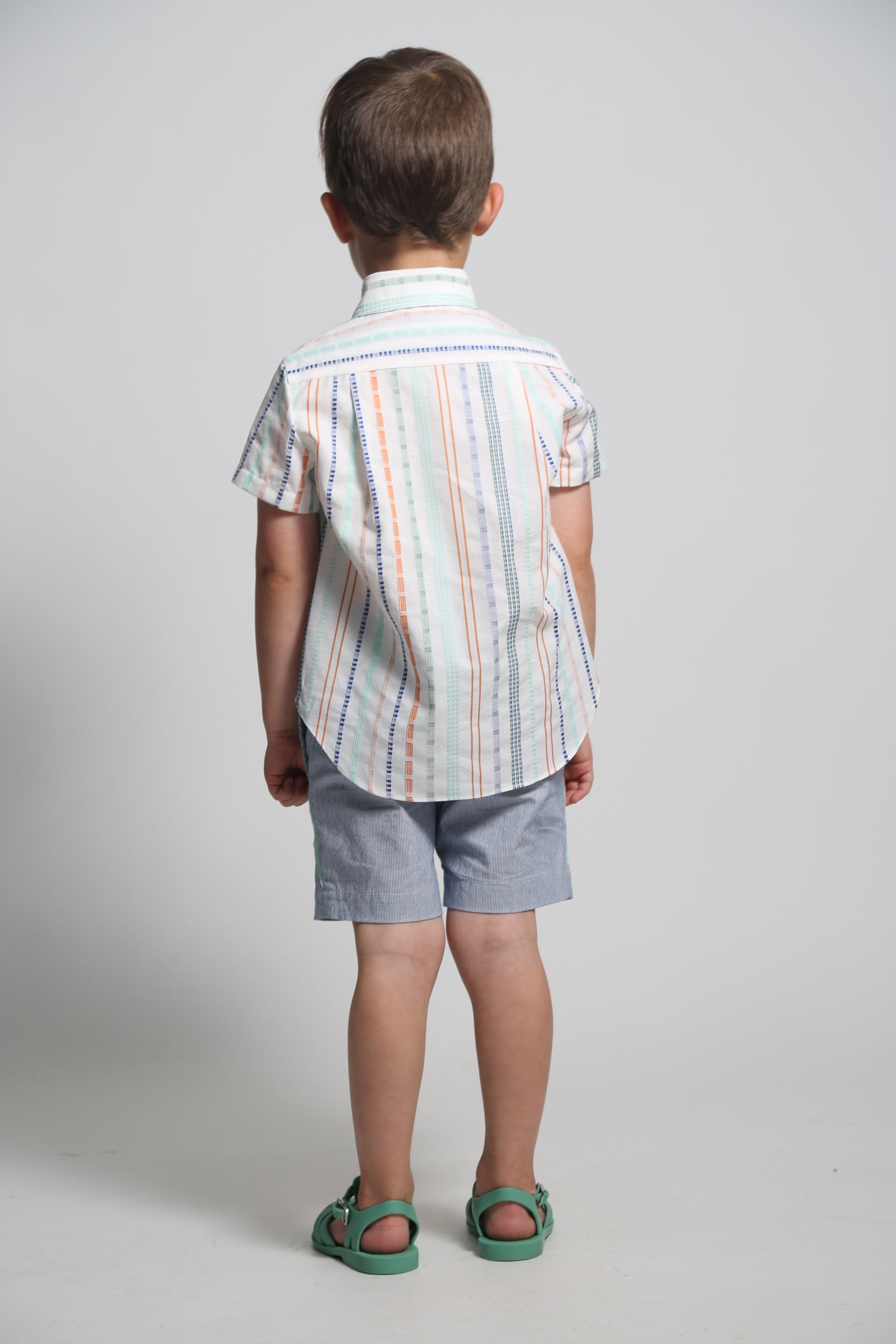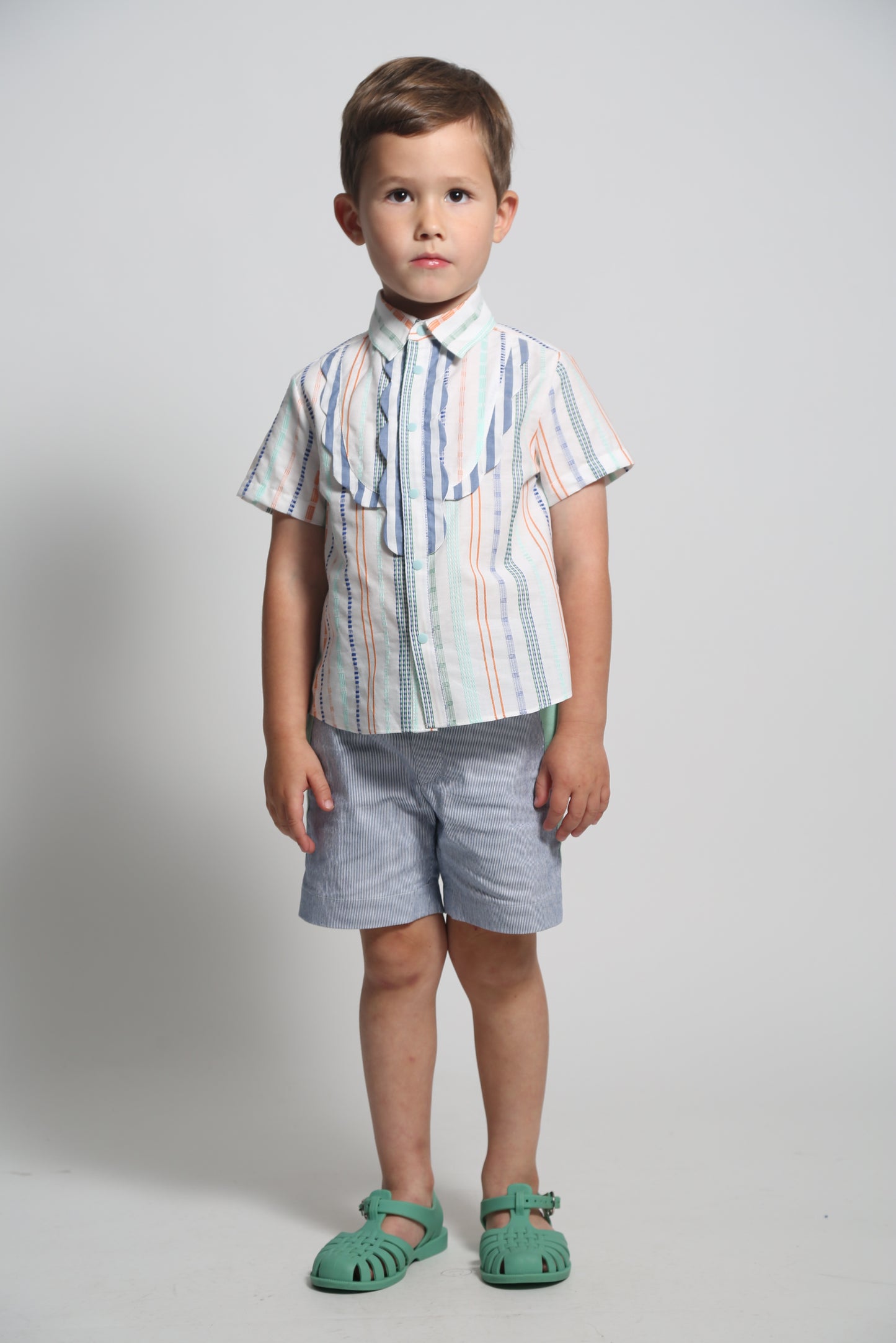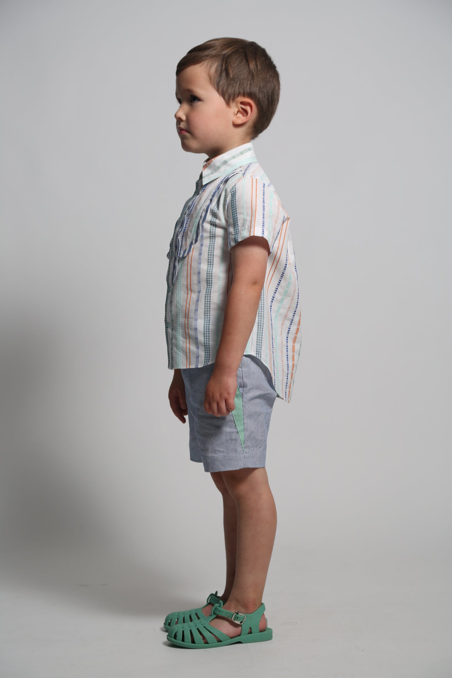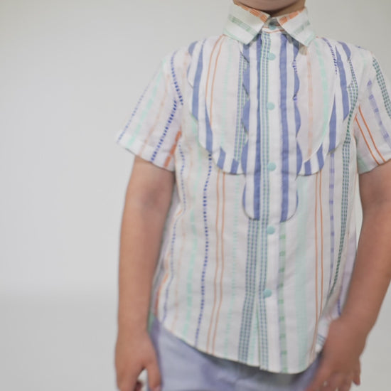 Introducing this season's boy’s scoop hem collared top, made neatly in the Paphos Stripe Shirting. Featuring a unique scalloped patchworking design thoughtfully crafted from past season fabrics in an effort to reduce waste, while repurposing scraps of fabric. The scalloped fabric creates an eye-catching bib detail at the front, adding a playful touch to this classic short sleeve top. With an easy snap closure, this top ensures quick and effortless dressing. Makes for a handsome and eco-conscious style for your little!