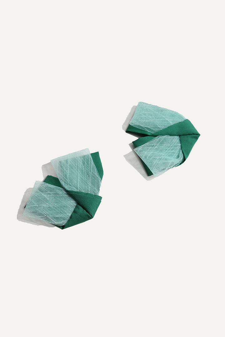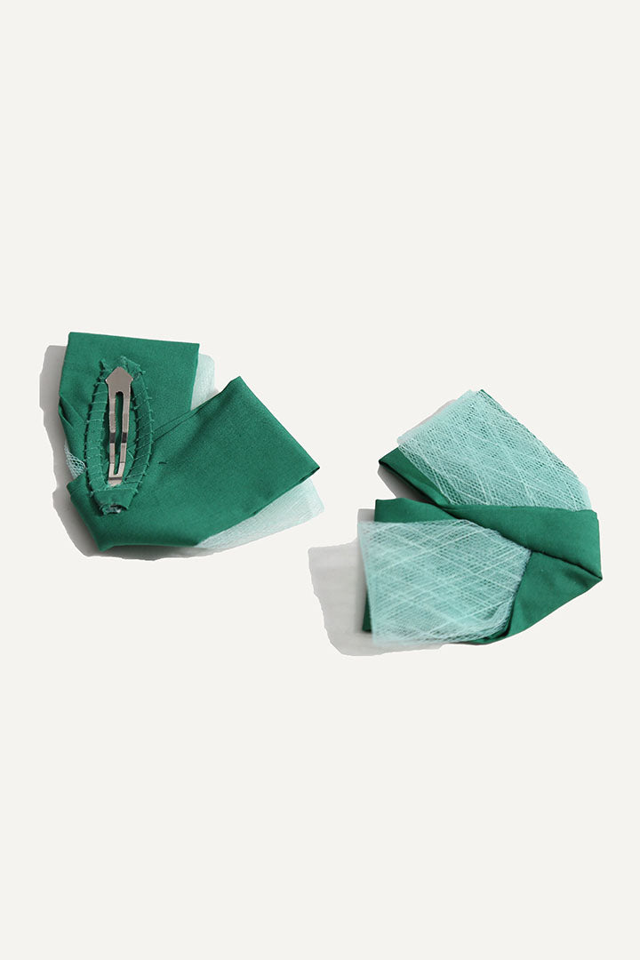 A two-piece hair clip set that is delicate and luxurious. Fringed pieces of Cotton Poplin and Argyle Tulle are layered together to create clips that appear butterfly-like.