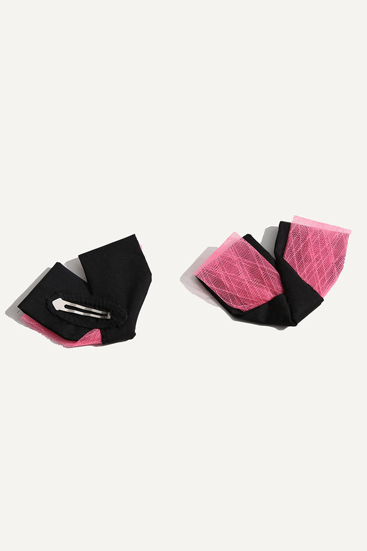 A two-piece hair clip set that is delicate and luxurious. Fringed pieces of Cotton Poplin and Argyle Tulle are layered together to create clips that appear butterfly-like.
