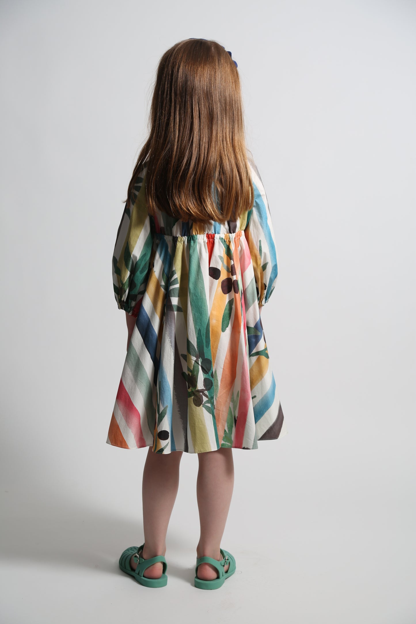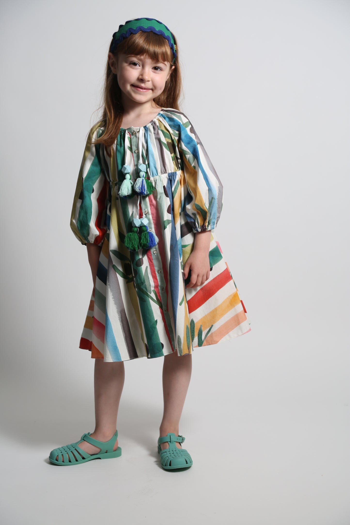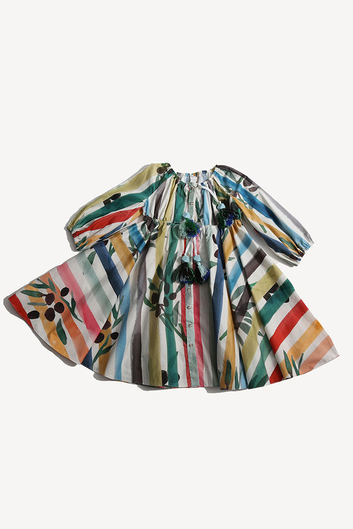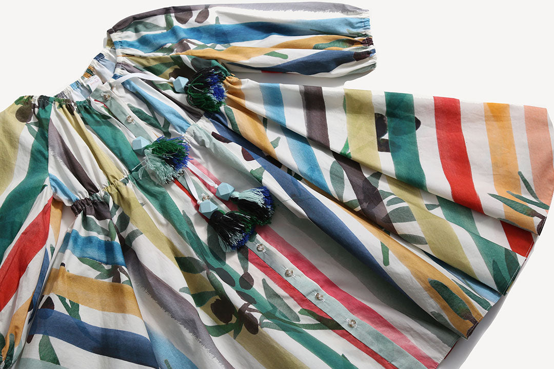 A charming shirt dress for her, made in the Garden of Peaceful Stripes print. This tea length twirl dress features buttons down the center front for easy dressing. Made complete with cinched 3/4 sleeves and a sweet ribbon tie and tassel detail at the elastic neckline and waistband. A cute style, perfect for both everyday wear and more formal occasions.