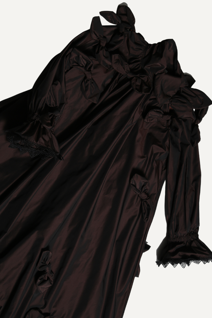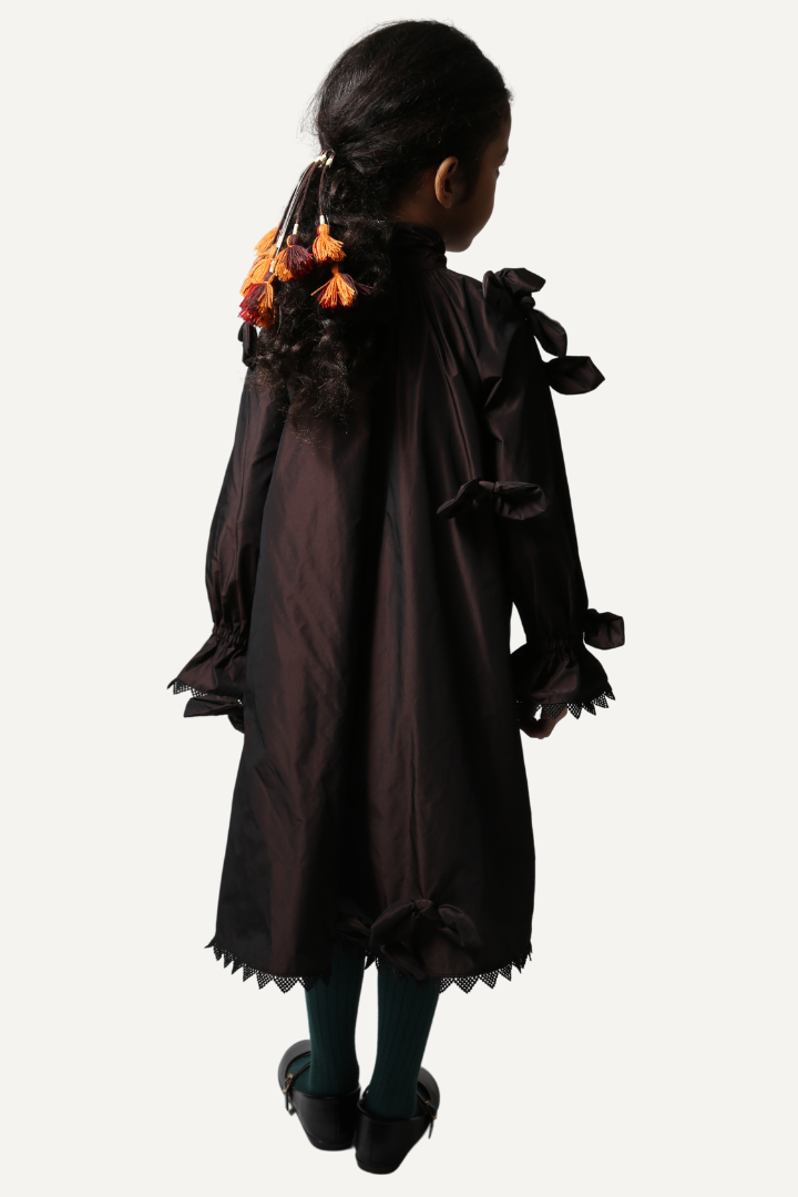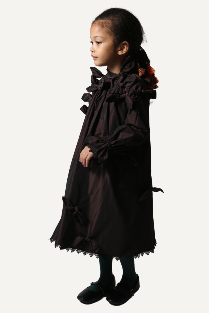 The perfect party dress for your sweet girl. This tea-length frock boasts a voluminous, graceful silhouette. Self-padded bows are playfully scattered across the design, creating a whimsical and eye-catching effect. A soft cotton lining ensures comfort, while a layer of tulle crinoline adds extra fullness for a flared shape. Finished with embroidery eyelet trim at the sleeve cuffs and hem, the dress also features in-seam pockets and a unique front closure with buttons and functional bow ties.