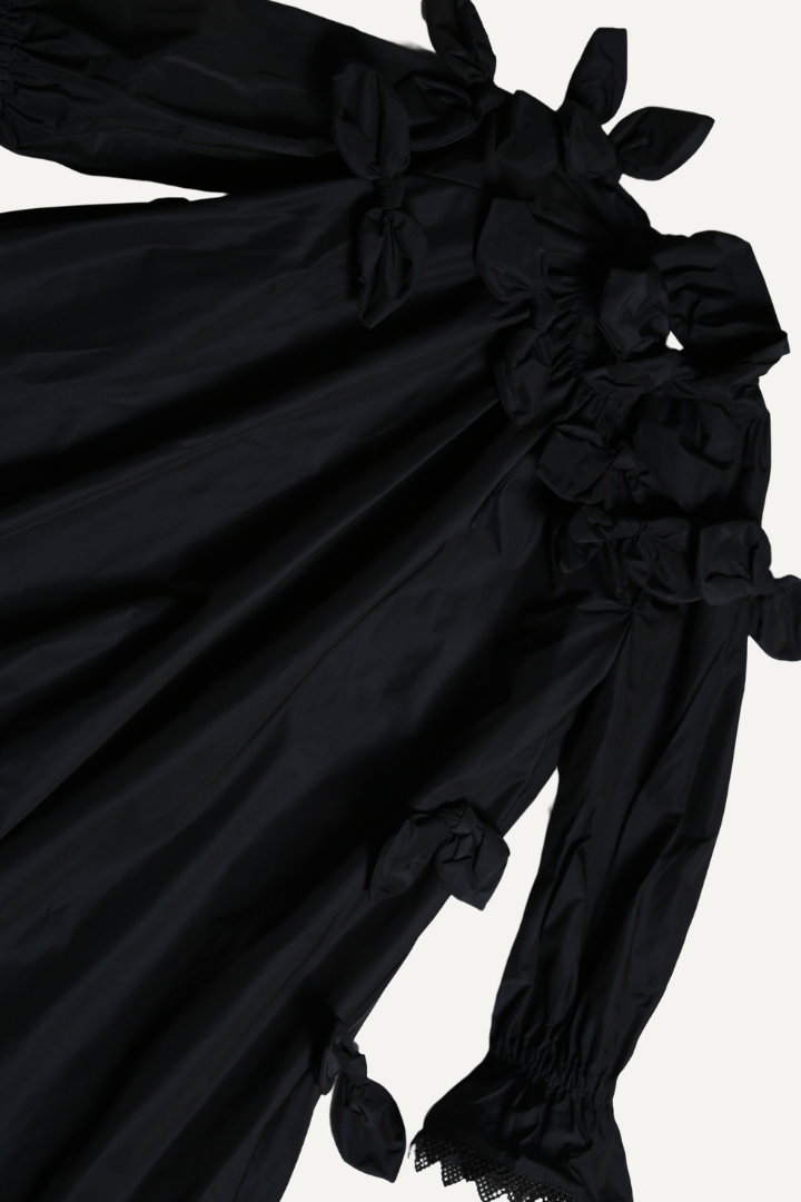 The perfect party dress for your sweet girl. This tea-length frock boasts a voluminous, graceful silhouette. Self-padded bows are playfully scattered across the design, creating a whimsical and eye-catching effect. A soft cotton lining ensures comfort, while a layer of tulle crinoline adds extra fullness for a flared shape. Finished with embroidery eyelet trim at the sleeve cuffs and hem, the dress also features in-seam pockets and a unique front closure with buttons and functional bow ties.