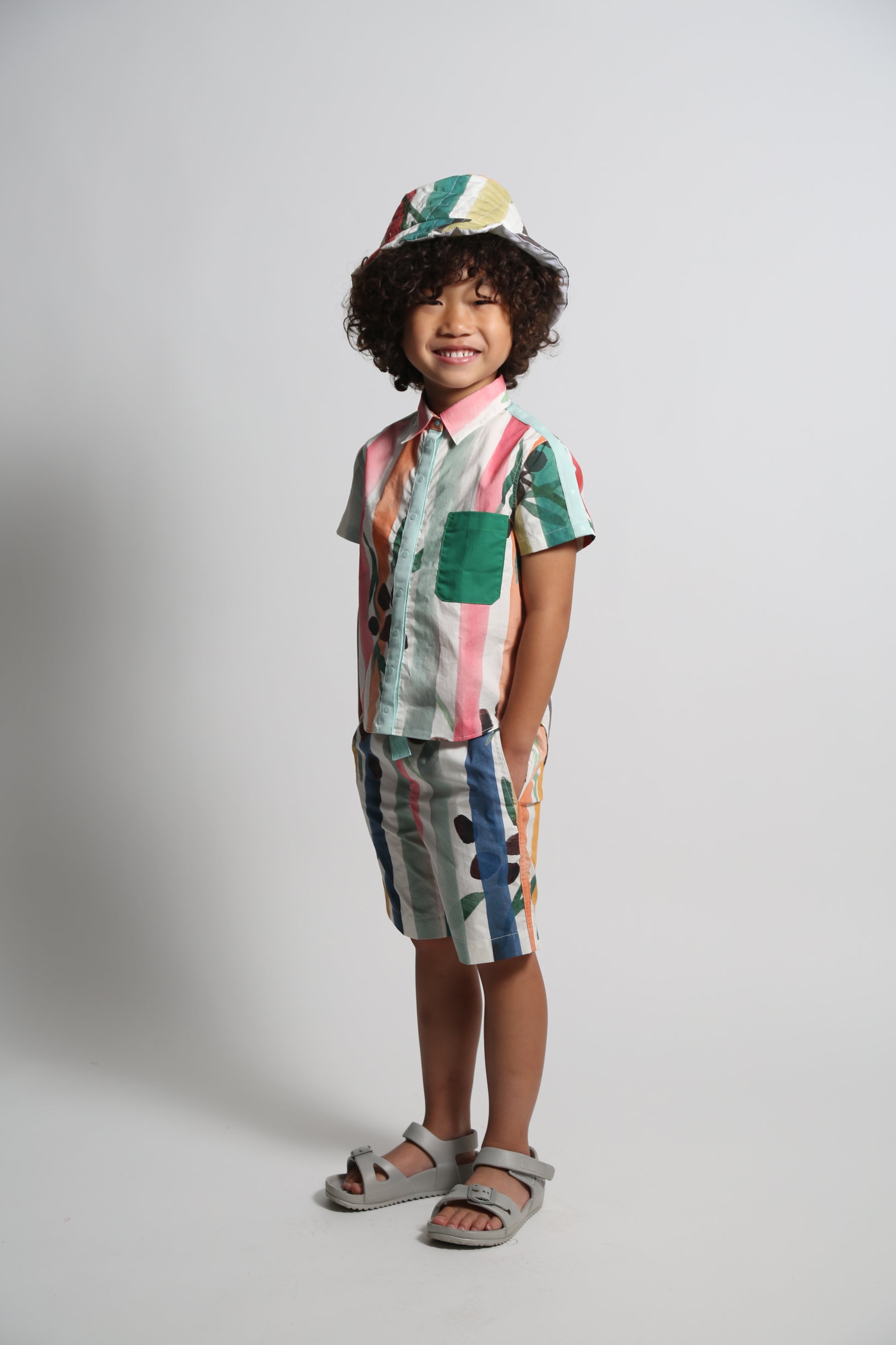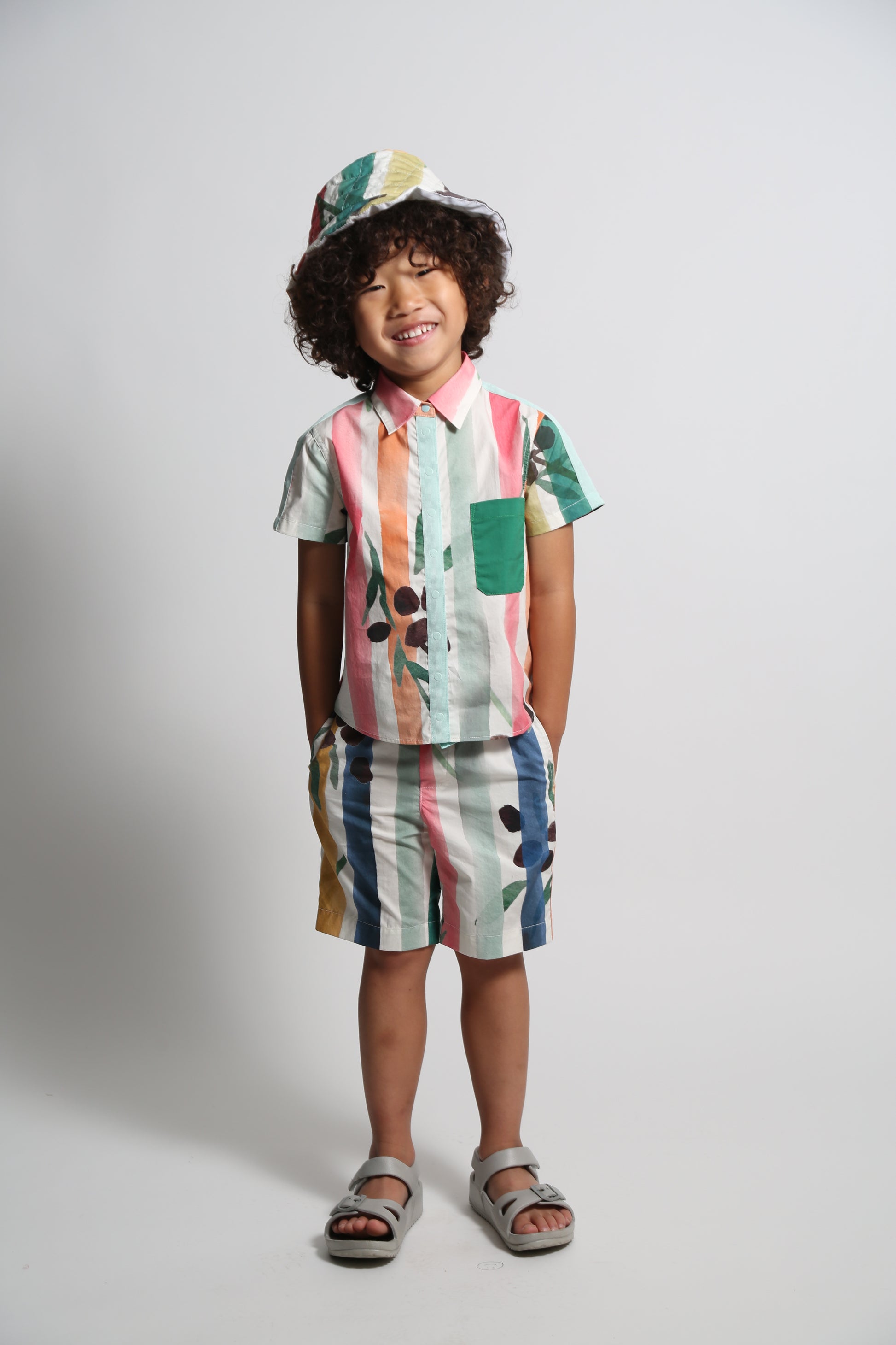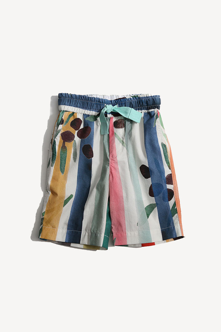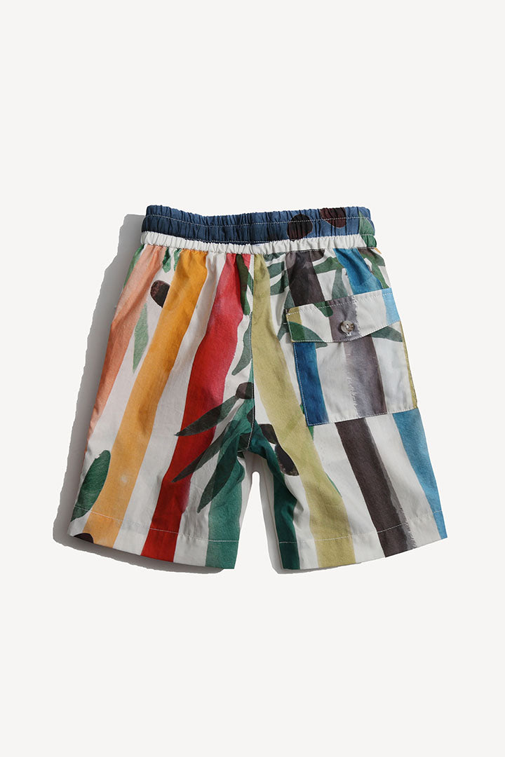 Knee pants made in this season's Garden of Peaceful Stripes print, these classic flat-front shorts are perfect for his day-to-day adventures and activities. Featuring a simple pull-on elastic waist with a drawstring ribbon tie, on-seam slant pockets, and a flap back pocket.