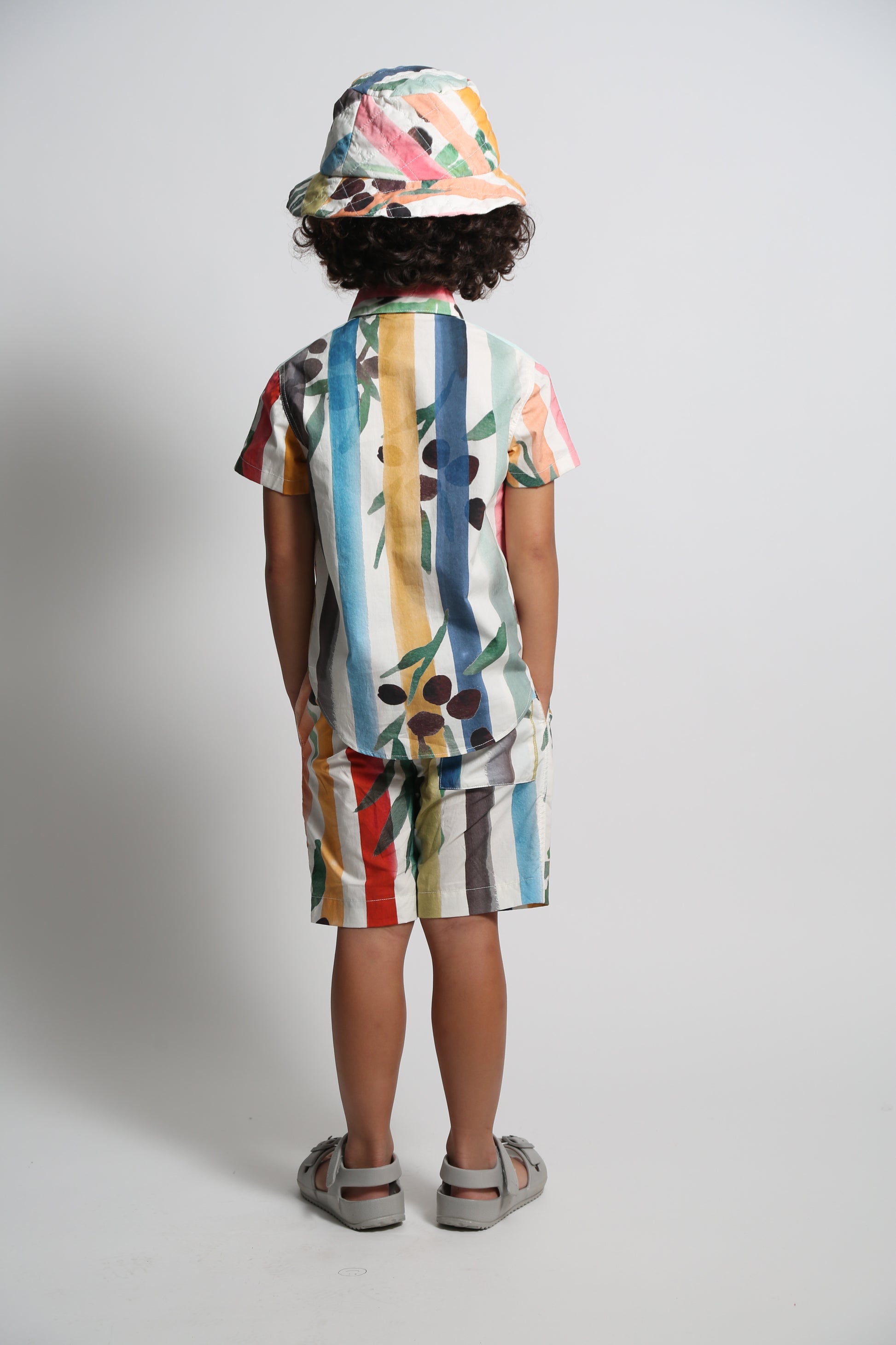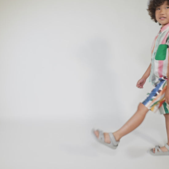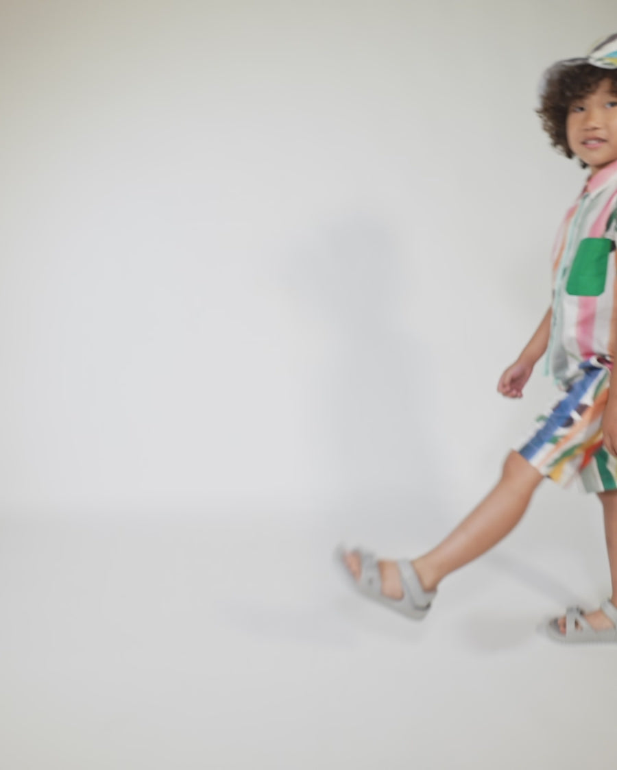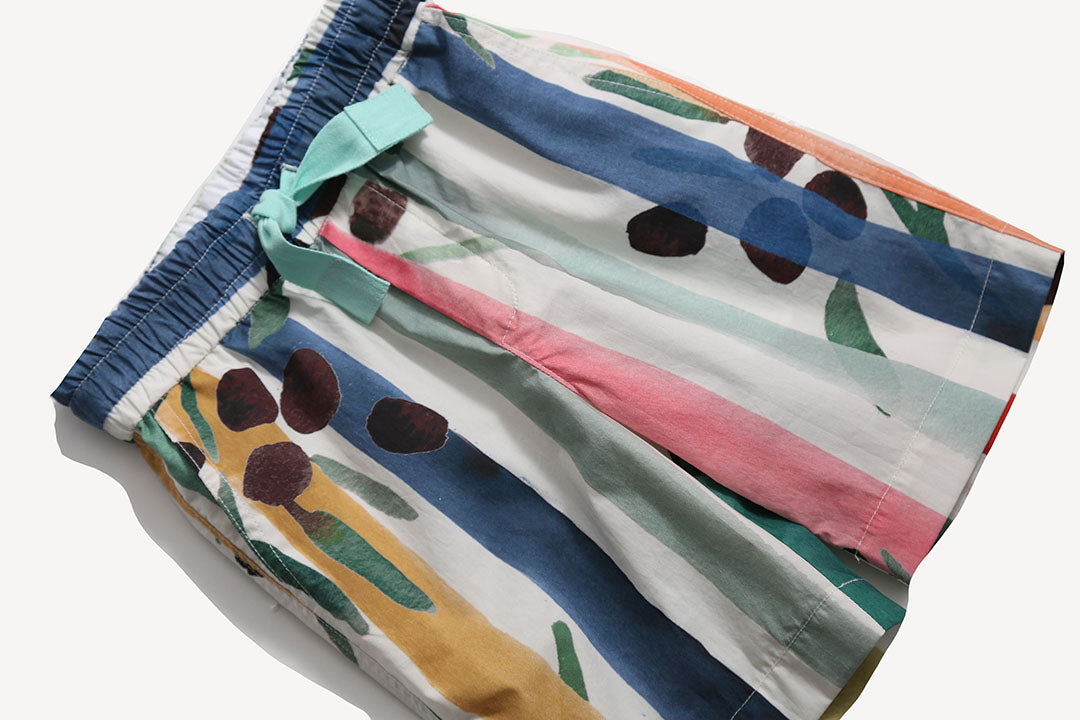 Knee pants made in this season's Garden of Peaceful Stripes print, these classic flat-front shorts are perfect for his day-to-day adventures and activities. Featuring a simple pull-on elastic waist with a drawstring ribbon tie, on-seam slant pockets, and a flap back pocket.