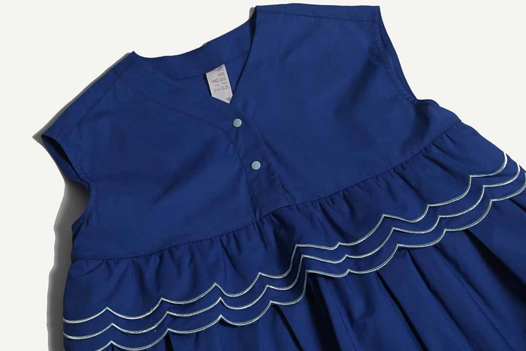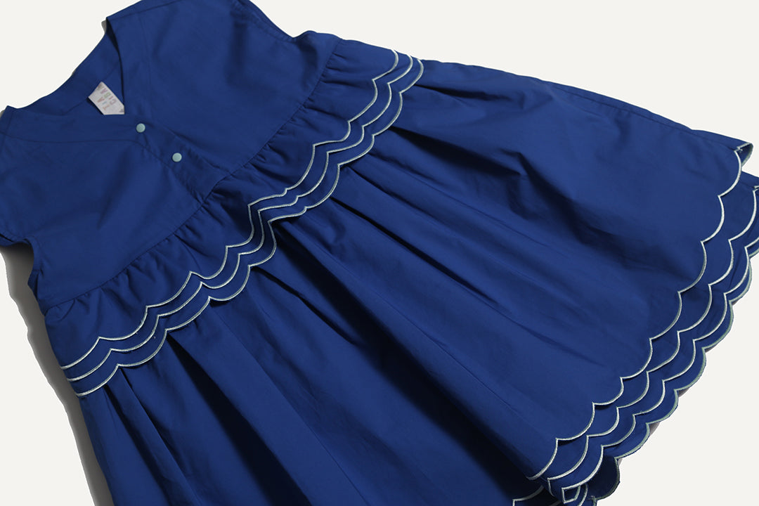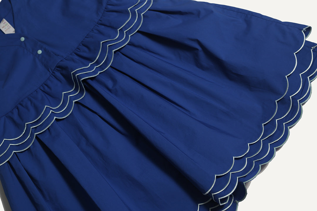 A smart shirt dress style that is an adorable look for the summertime! This tea length frock features dropped shoulders and boxy volume silhouette, made comfortably in the soft Classic Cotton Poplin. The peplum-style waist and hem is beautifully tiered and scalloped, finished neatly with embroidered thread at each tier, adding a touch of whimsy to the silhouette. An easy henley style snap closure makes dressing a breeze and in-seam pockets help them hold all their treasures. Perfect for casual outings or special occasions, this versatile dress is sure to be a wardrobe favorite!