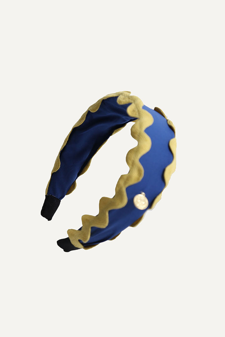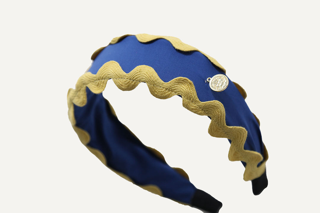 Enhance her style with this soft Classic Cotton Poplin headband, designed for both comfort and flair. Trimmed with a contrast ric rac ribbon along both edges and finished with a small shiny coin as a decorative accent at one side. This accessory is sure to make a statement wherever she goes!