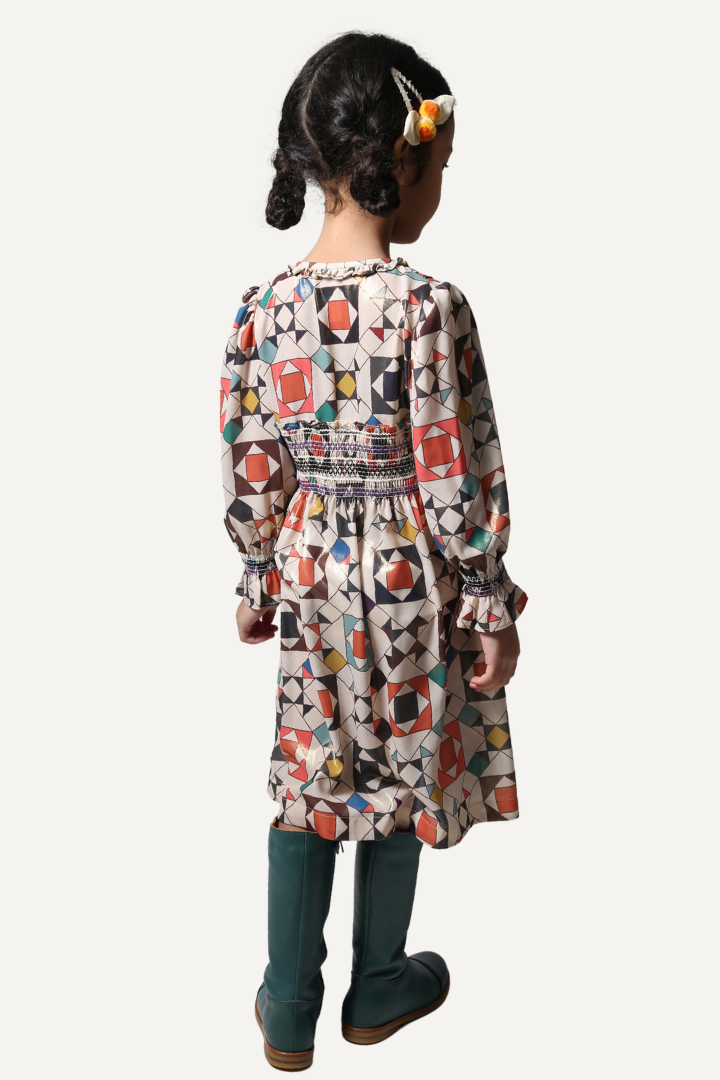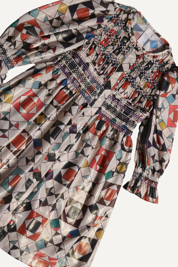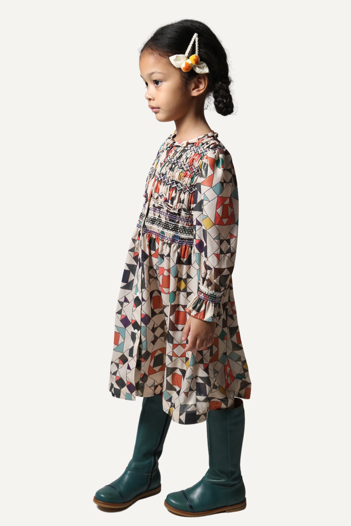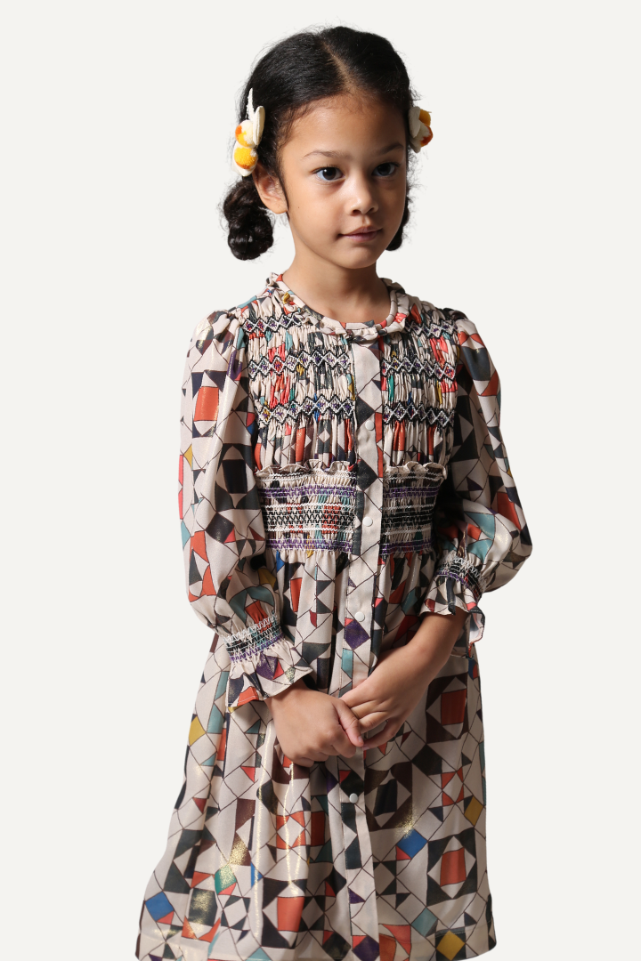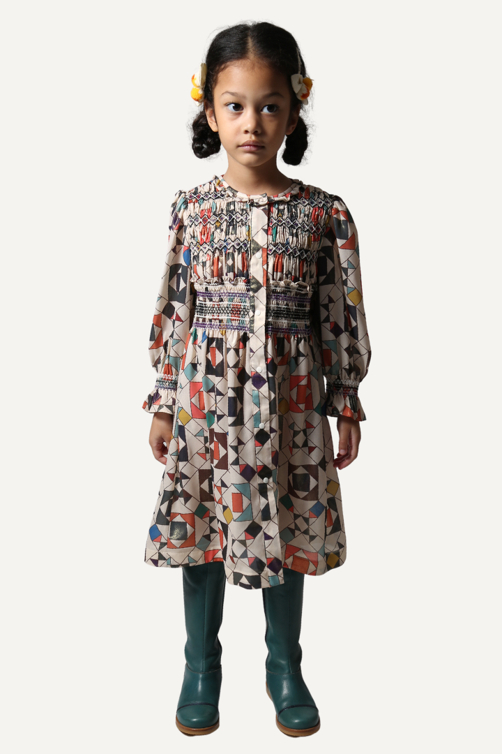 Made in the season's print in the shimmering liquid crepe fabric, this tea-length smocked shirt dress is a sweet style for everyday. Featuring a classic crew neckline and long sleeves with a ruffled finish. Intricate smocking decorates the bodice, waist, and sleeve cuffs—delicately handcrafted at the bodice and expertly machine-smocked at the waist and cuffs. With a convenient snap closure at the center front and a lightweight, unlined design, this dress is perfect for all of her adventures.