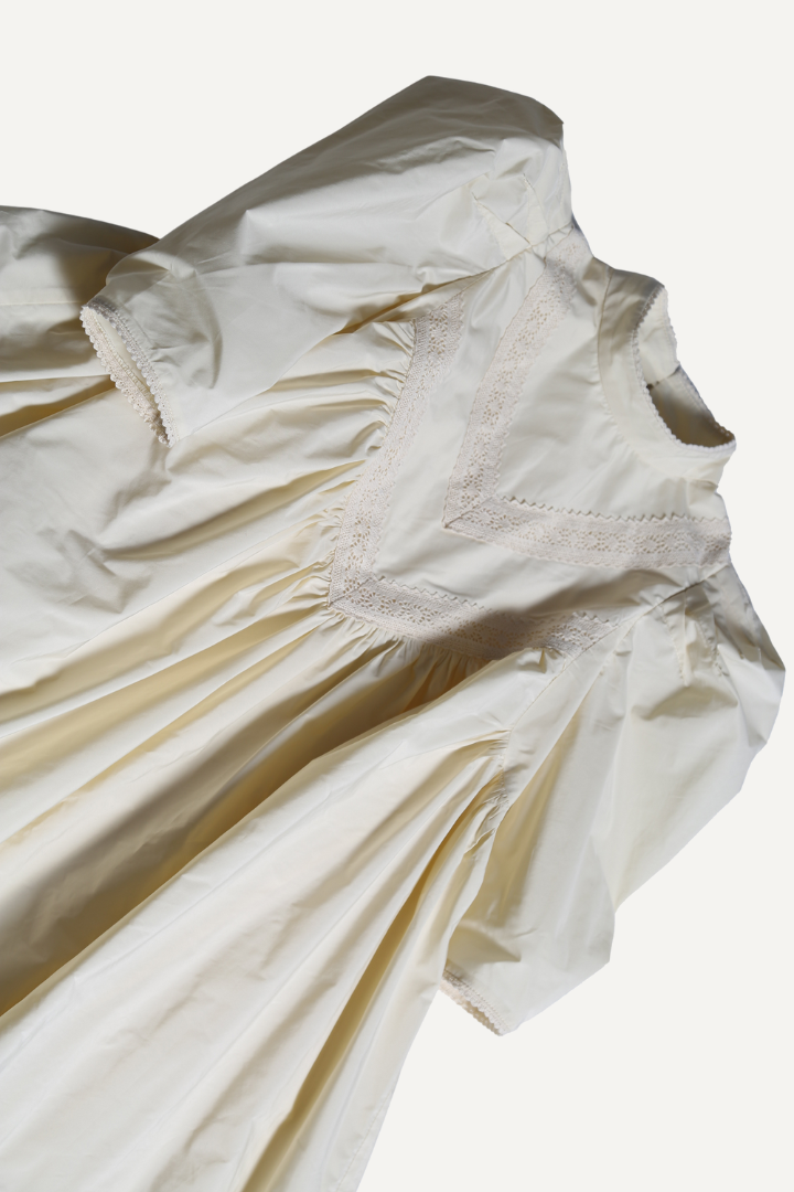Made in the luxurious Taffeta, this 3/4 sleeve voluminous gown features a striking high-low hem. The mock neckline adds sophistication, while the back closure is secured with a button, loop, and a modesty lip ribbon. Delicate crochet eyelet trim forms a V-shape at the front bodice and a rectangular detail at the back, with subtle accents peeking from the sleeve hems. Fully lined for comfort, this gown is a timeless piece for her occasional wardrobe.