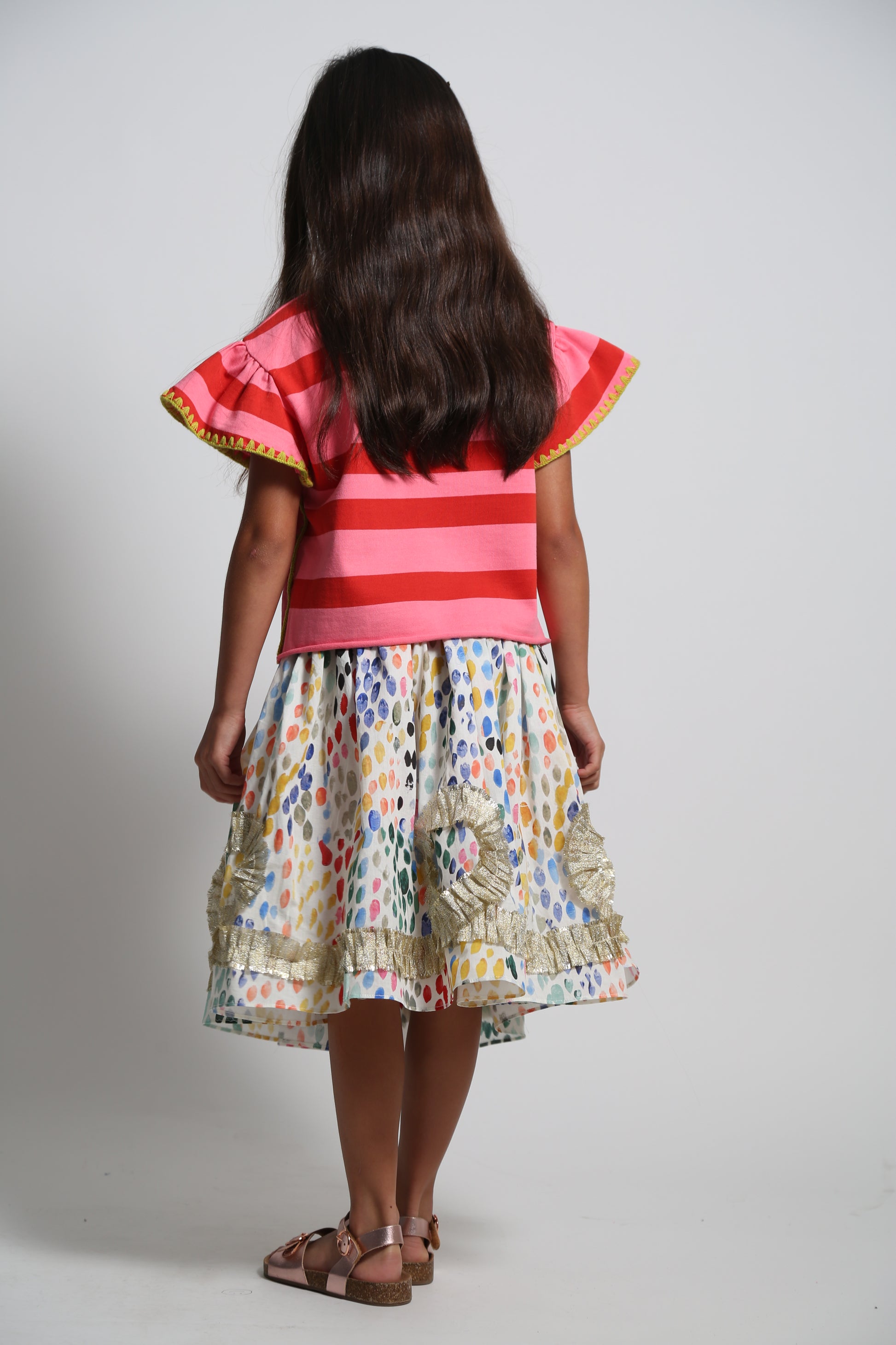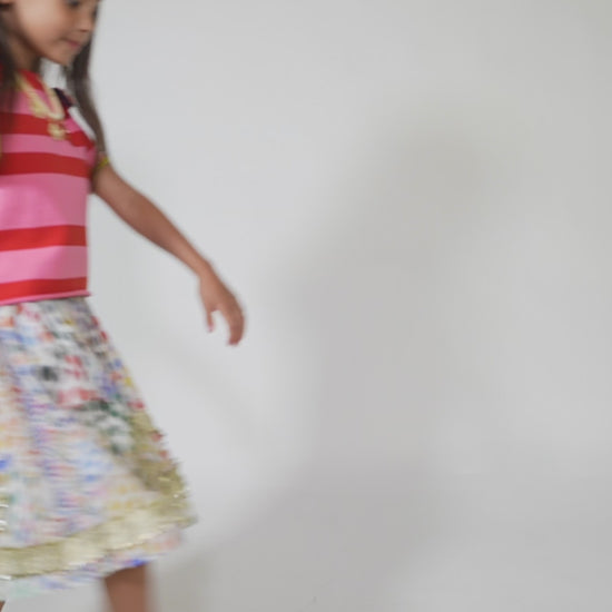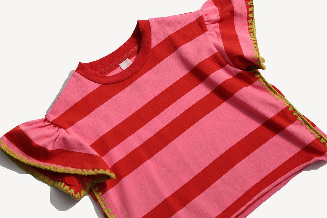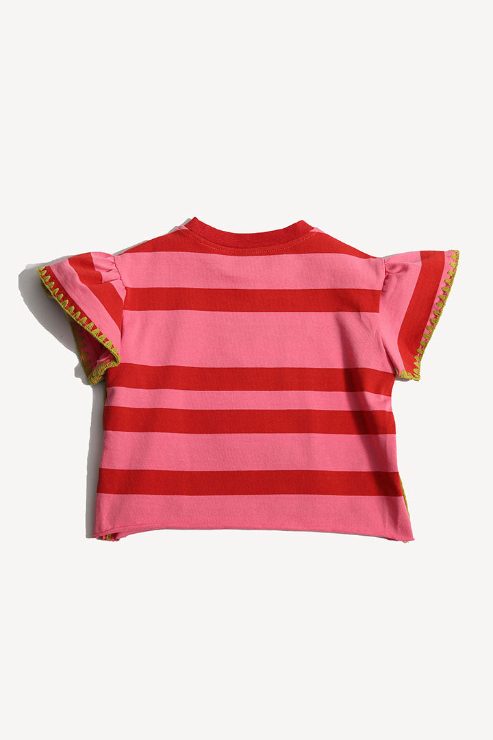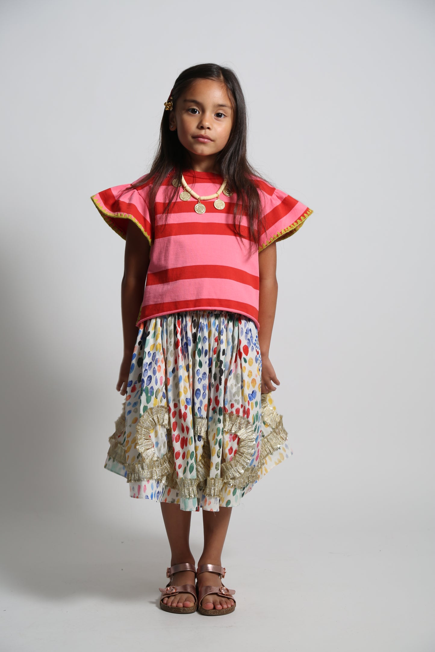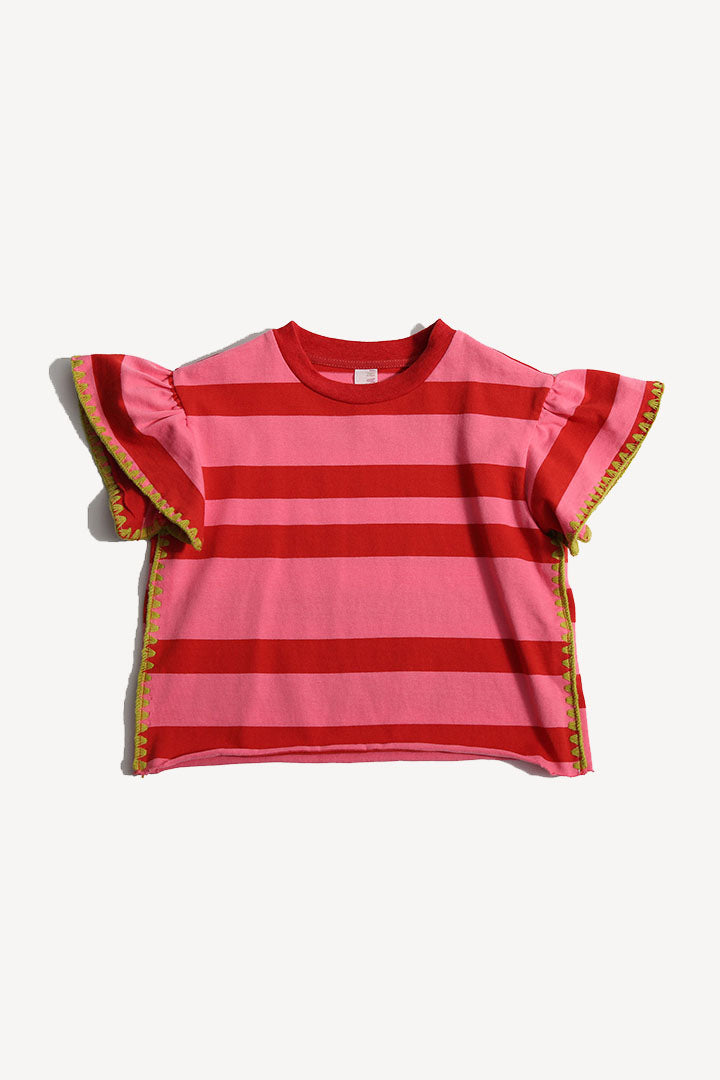 This easy-fit t-shirt in the Mykonos Stripe Jersey is made sweetly with handkerchief hem flounce short sleeves. Crochetted yarn is trimmed neatly at the sleeves and sides with glow-in-the-dark reflective yarn as a fun finish. Featuring a comfortable ribbed crew neckline and a raw edge at the hem. A stunning combo for your little when worn with the Alexandra Ribbon Pleated Skirt.