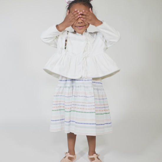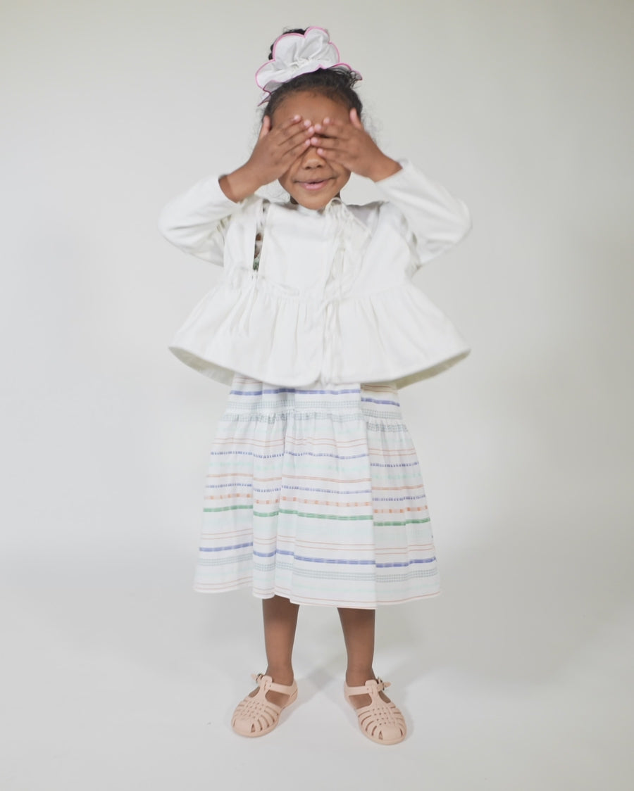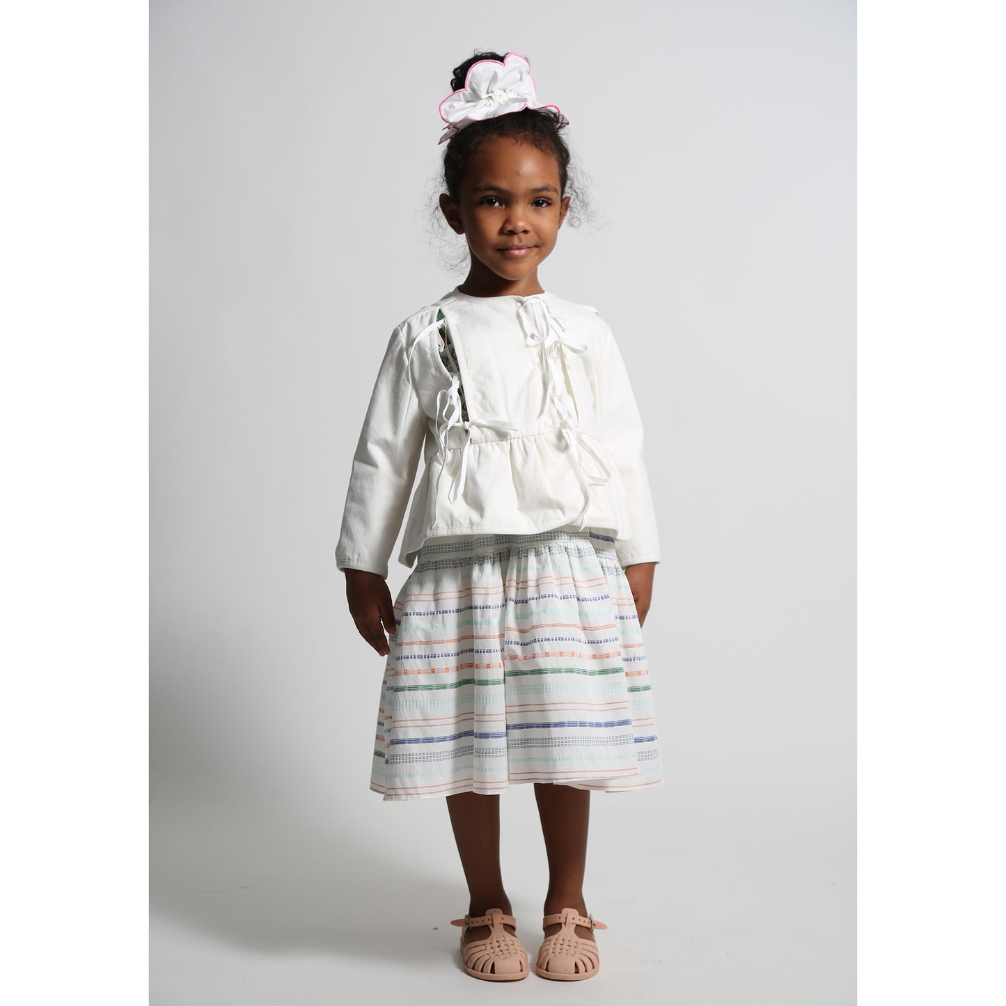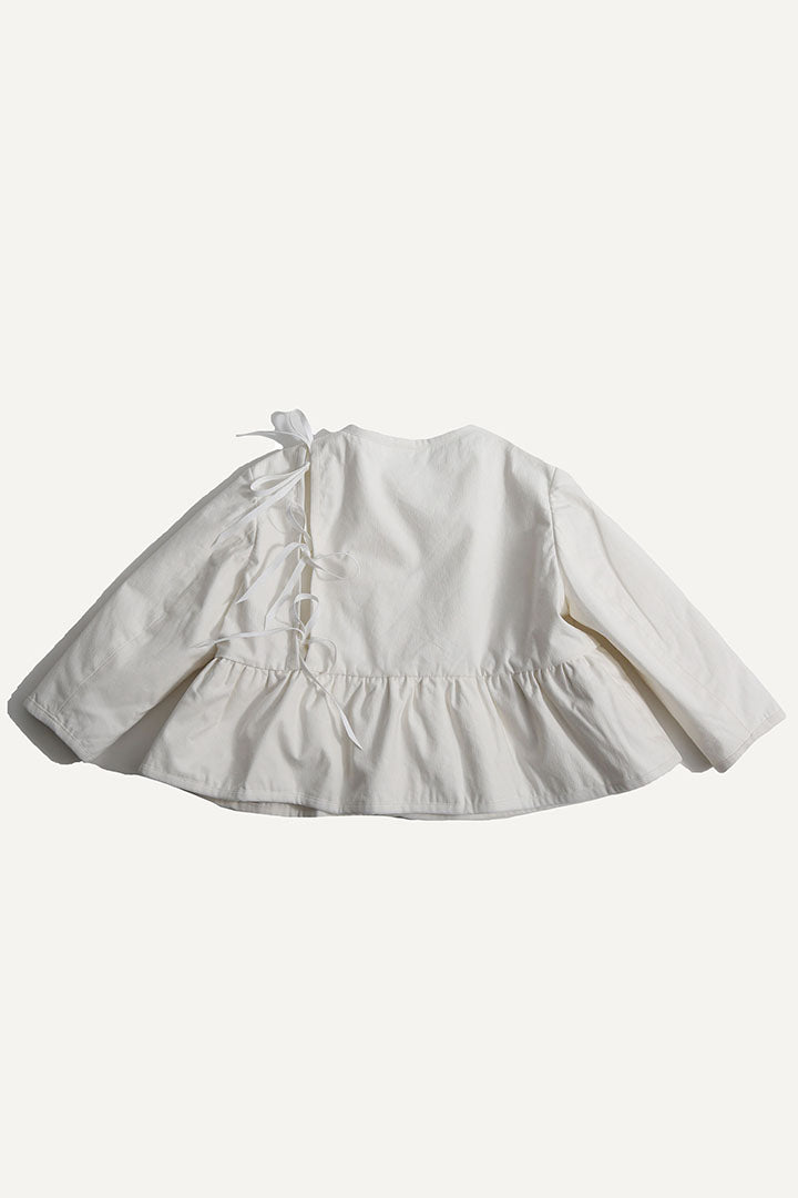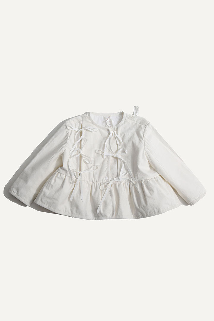 A charming occasional spring jacket boasting a sweet peplum-style flared hem. This lightly padded girls' jacket features a classic crew neckline and snap buttons at the center front, ensuring a secure fit for all-day wear. Ribbons line the seams at the front and are playfully placed on one side at the back to be tied into sweet bow ties, adding a whimsical touch to the design. Perfect for layering over dresses or tops, this jacket will be a spring staple for your little!