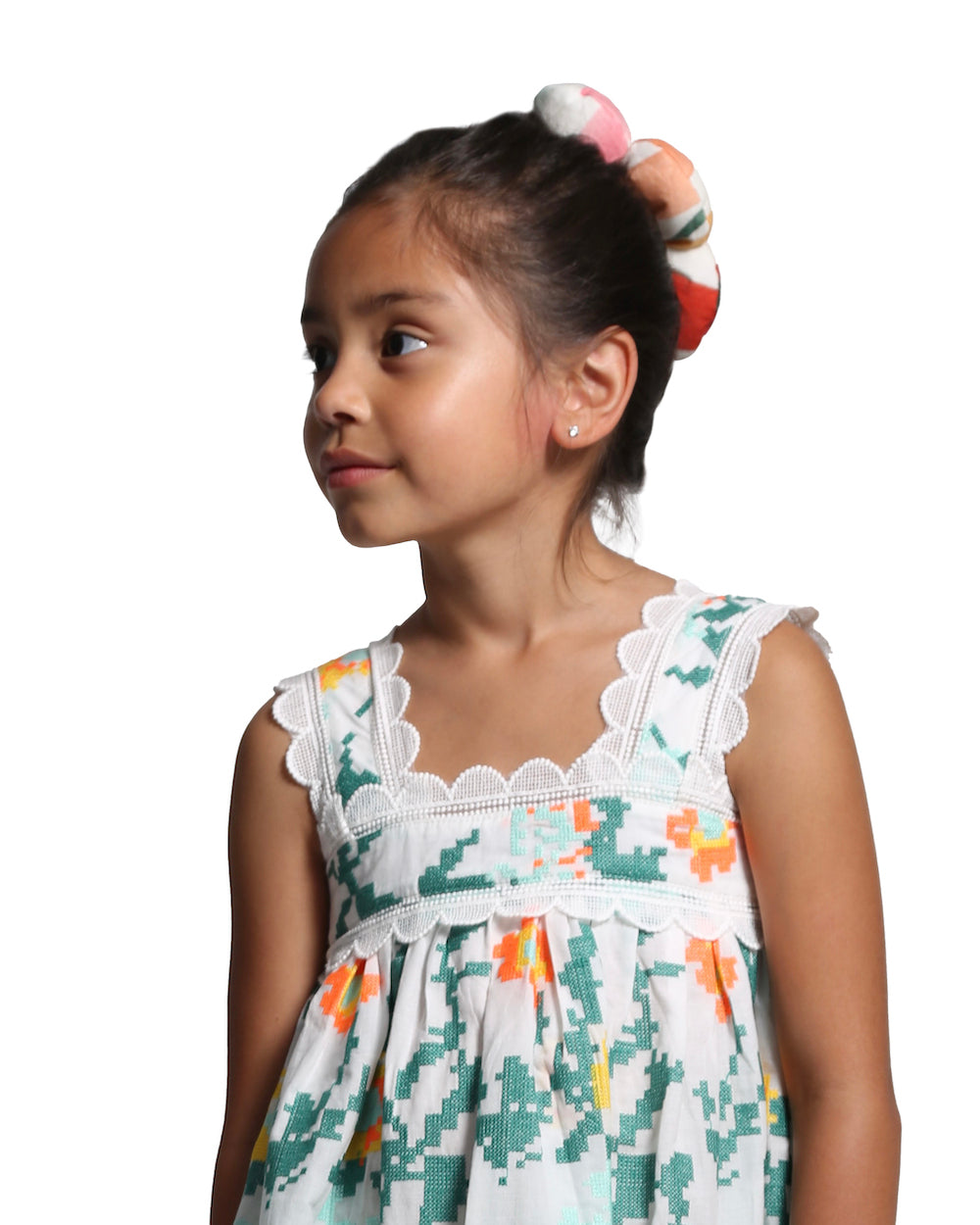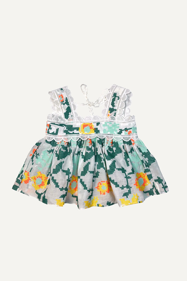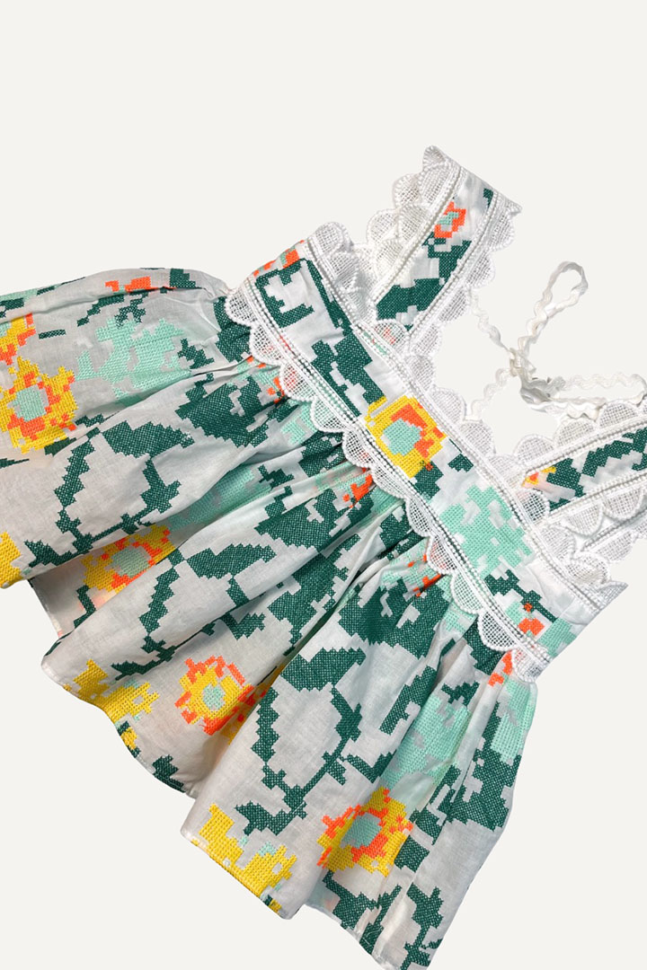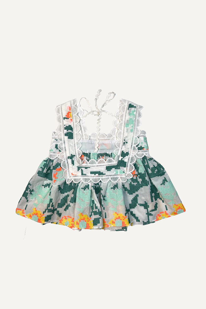 A TiA CiBANi exclusive style, only available here on our website! Embrace summer days with this charming blouse! Expertly crafted from this season's Chloris Cross-Stitch Poplin, with a soft cotton base finished with an intricate embroidery. This flowy blouse features ric rac ribbon ties to tie into a sweet bow at the back of the square neckline. Beautifully finished with embroidered lace ribbon trim throughout.