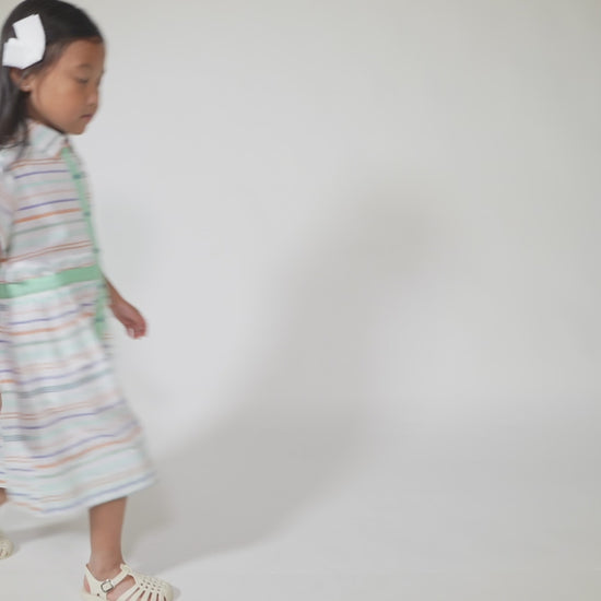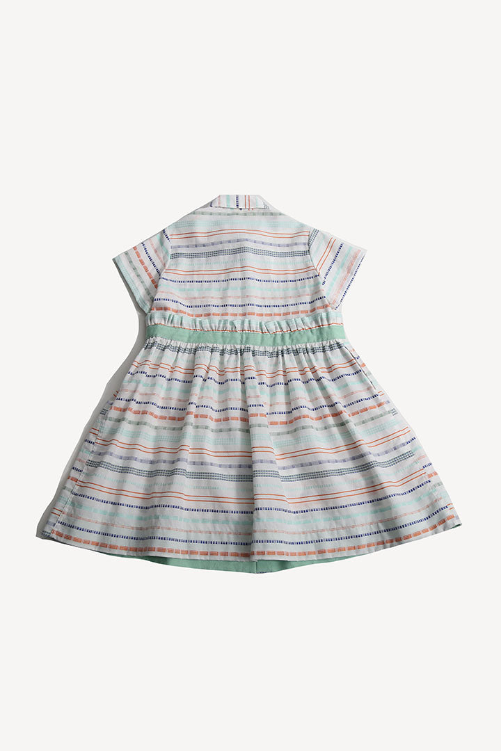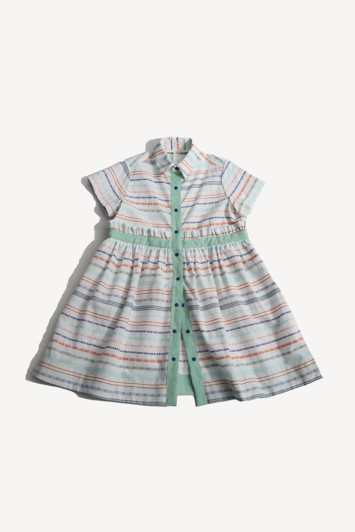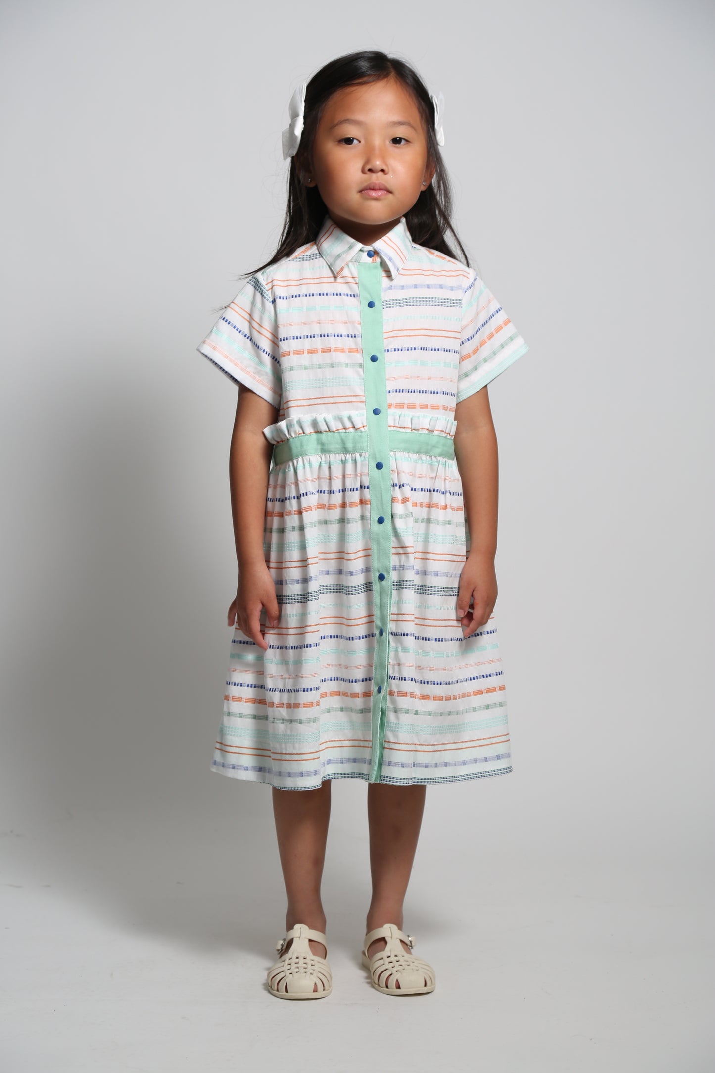 Made in the soft, cotton Paphos Stripe Shirting, this easy-fit, short-sleeve dress with ruffles at the waist makes for the cutest flared silhouette season after season. A high peter pan collar frock featuring a snap button closure and ribbon down the front and waistline, the Pia Ruffled Frock is versatile, perfect for everyday school play or for more occasional settings.