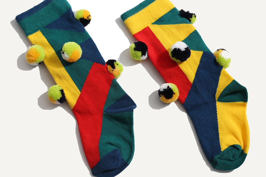 Make a statement with these stylish and comfortable mismatched knee-high geometric socks! Made up of multiple colors in a lightweight cotton knit with added spandex for comfortable all day wear. Decorated all over with multi-color pom poms for added fun and flair.
