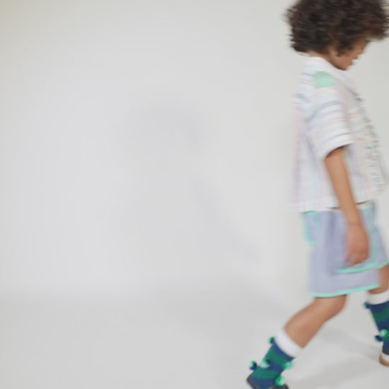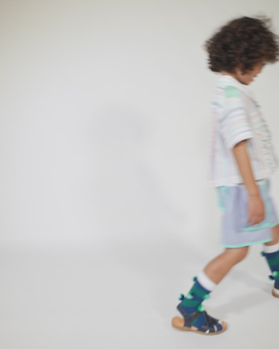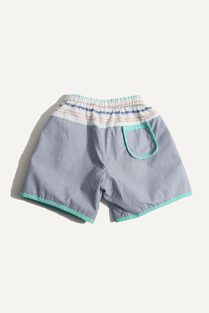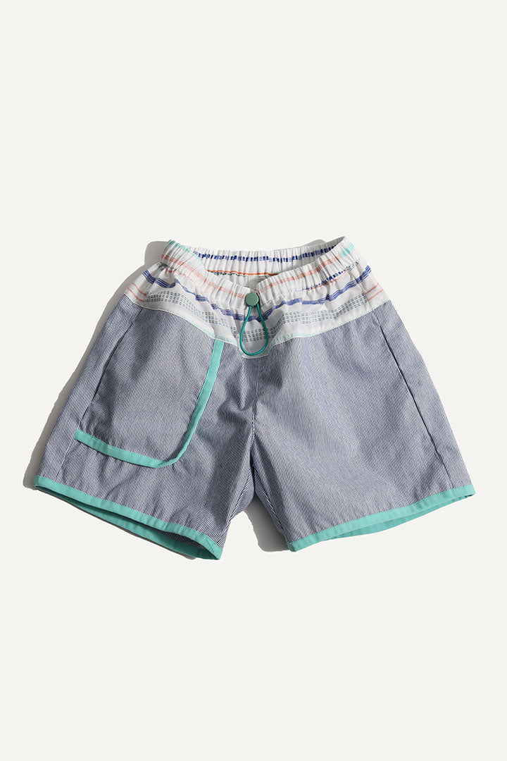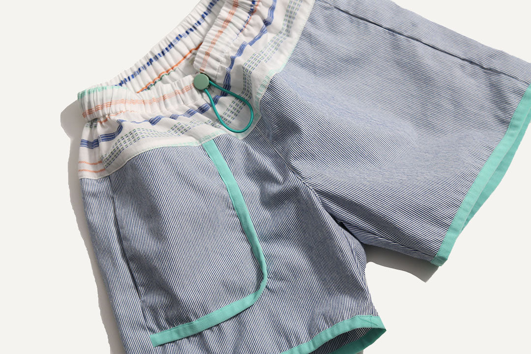 Relaxed easy-fit boy’s cargo shorts, designed for all-day comfort and play. Made in the Ticking Stripe Stretch Tarp, featuring a comfortable elastic waistband, and an adjustable elastic cord with a colorful stopper, ensuring the perfect fit. Playfully patchworked with the Paphos Stripe shirting at the waist adds a fun twist, while contrasting binding tape trims enhance the overall design. With convenient pockets at the front and back, these shorts are both practical and stylish for any adventure.