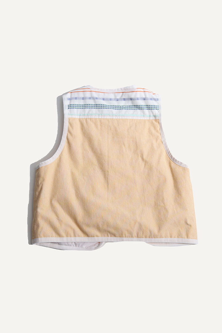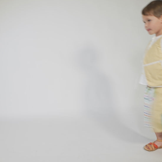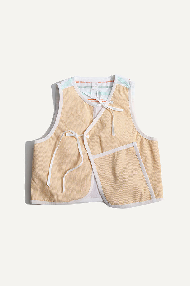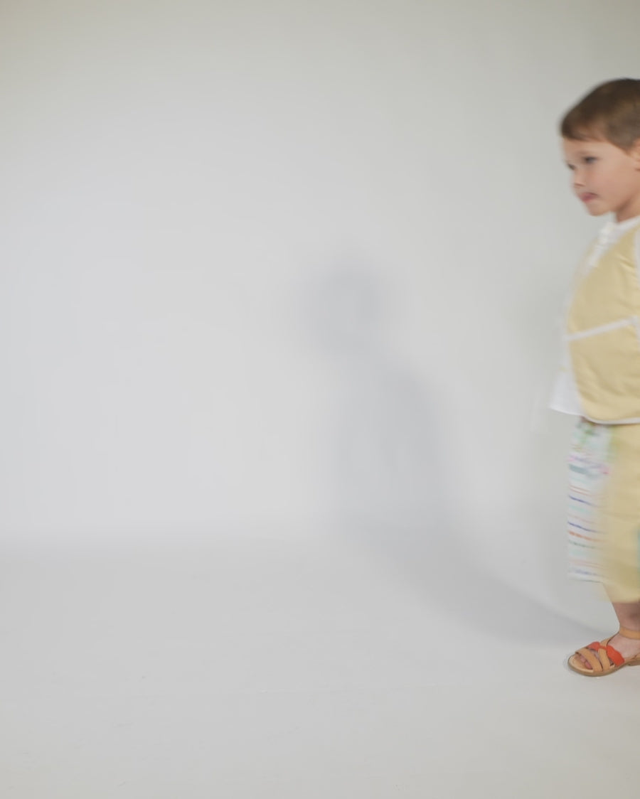 Elevate their wardrobe with our lightly padded boy’s vest made in the Ticking Stripe Stretch Tarp. This vest features a hidden snap closure and charming ribbon ties for added security and flair. Trimmed with binding tape at the edges and boasting a deep front pocket, it combines practicality with a sleek design. For a touch of fun, this top is patchworked with the Paphos Stripe Shirting at the yoke. Makes for the perfect pairing when worn with any of this season's classic button ups and matching shorts.