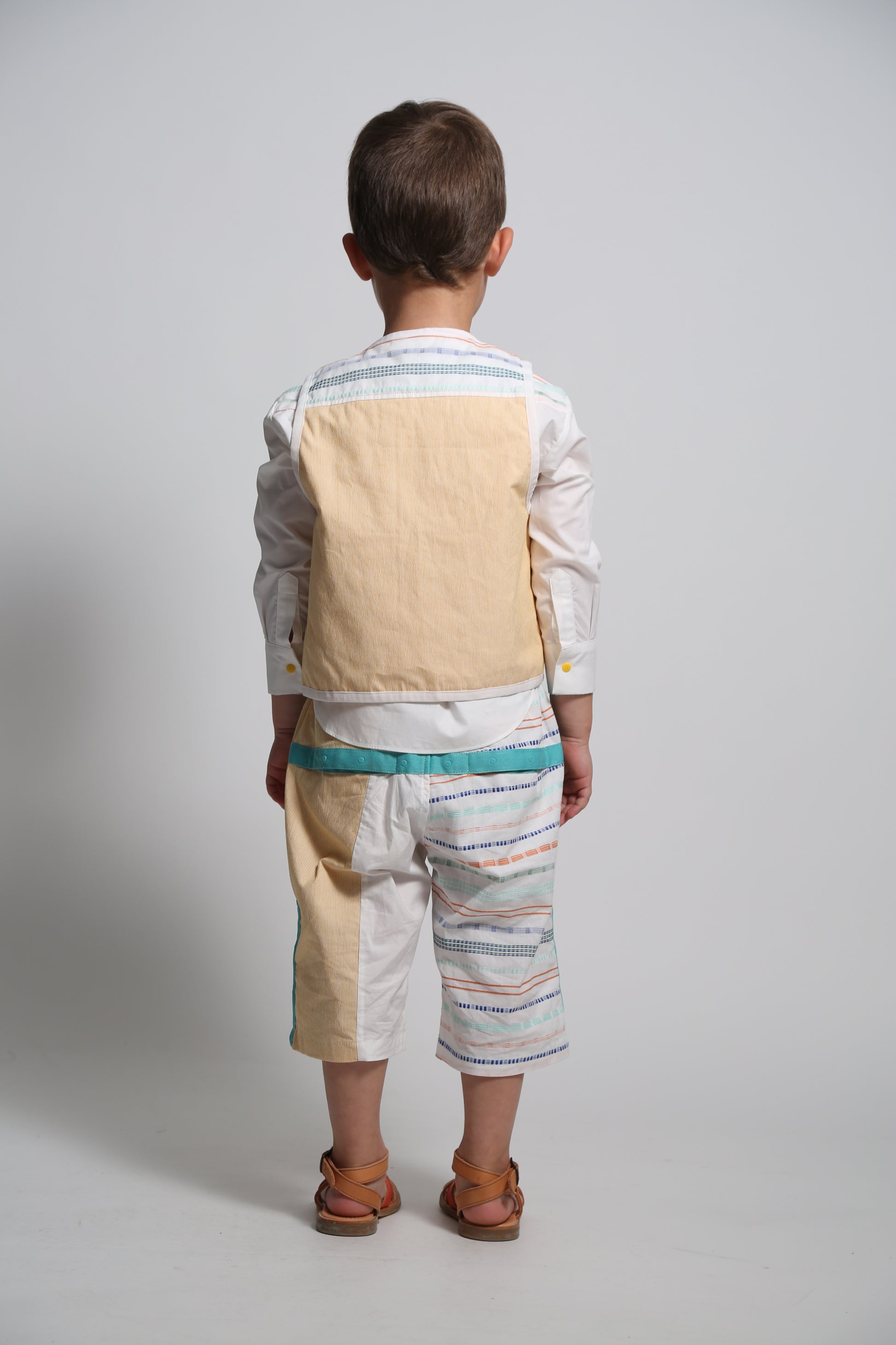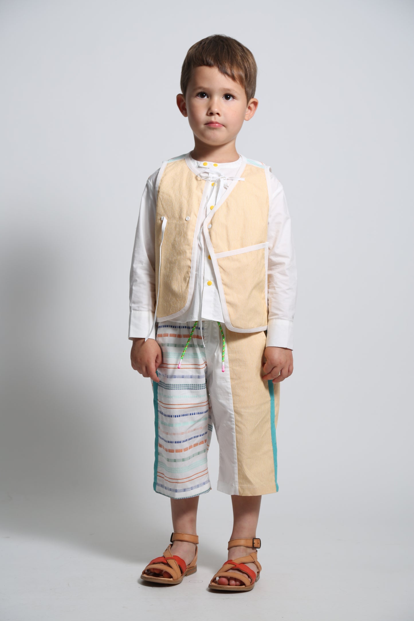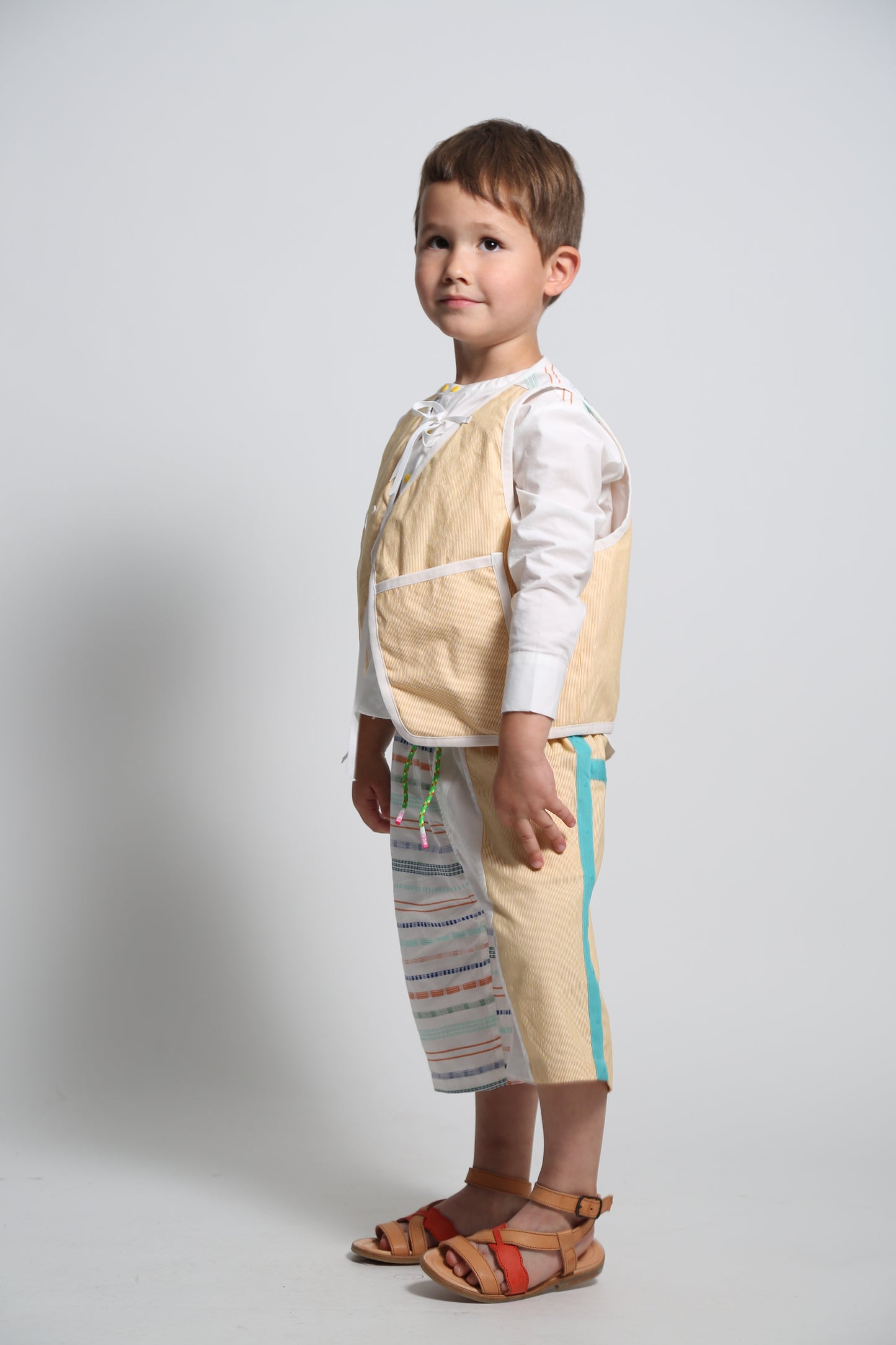 Elevate their wardrobe with our lightly padded boy’s vest made in the Ticking Stripe Stretch Tarp. This vest features a hidden snap closure and charming ribbon ties for added security and flair. Trimmed with binding tape at the edges and boasting a deep front pocket, it combines practicality with a sleek design. For a touch of fun, this top is patchworked with the Paphos Stripe Shirting at the yoke. Makes for the perfect pairing when worn with any of this season's classic button ups and matching shorts.