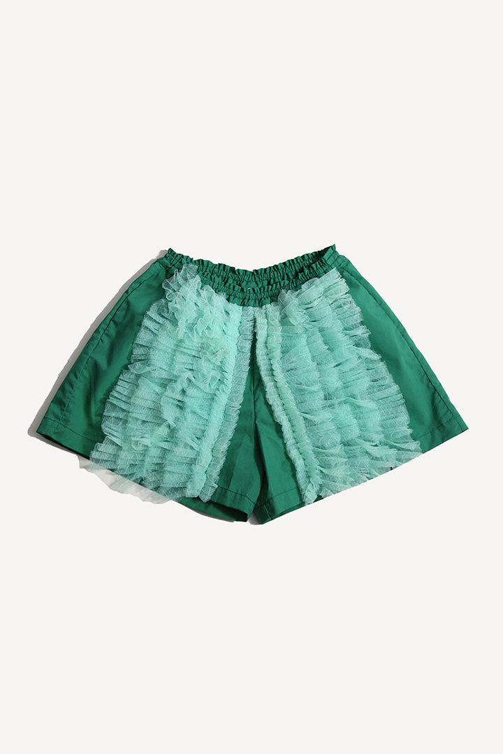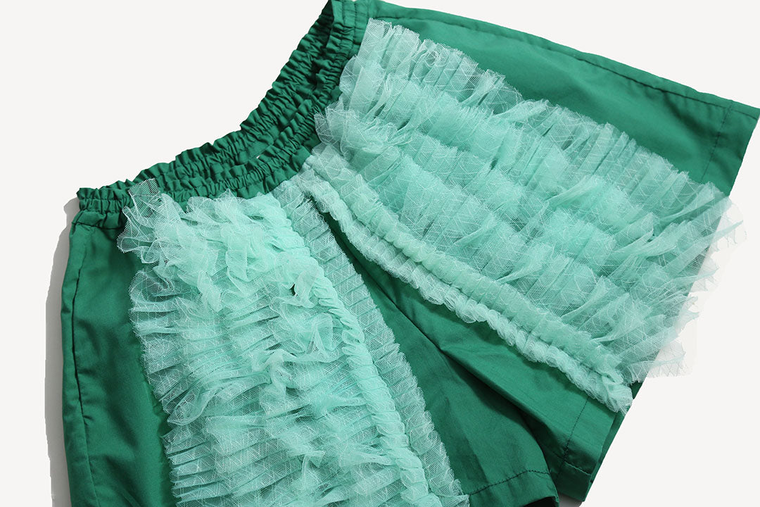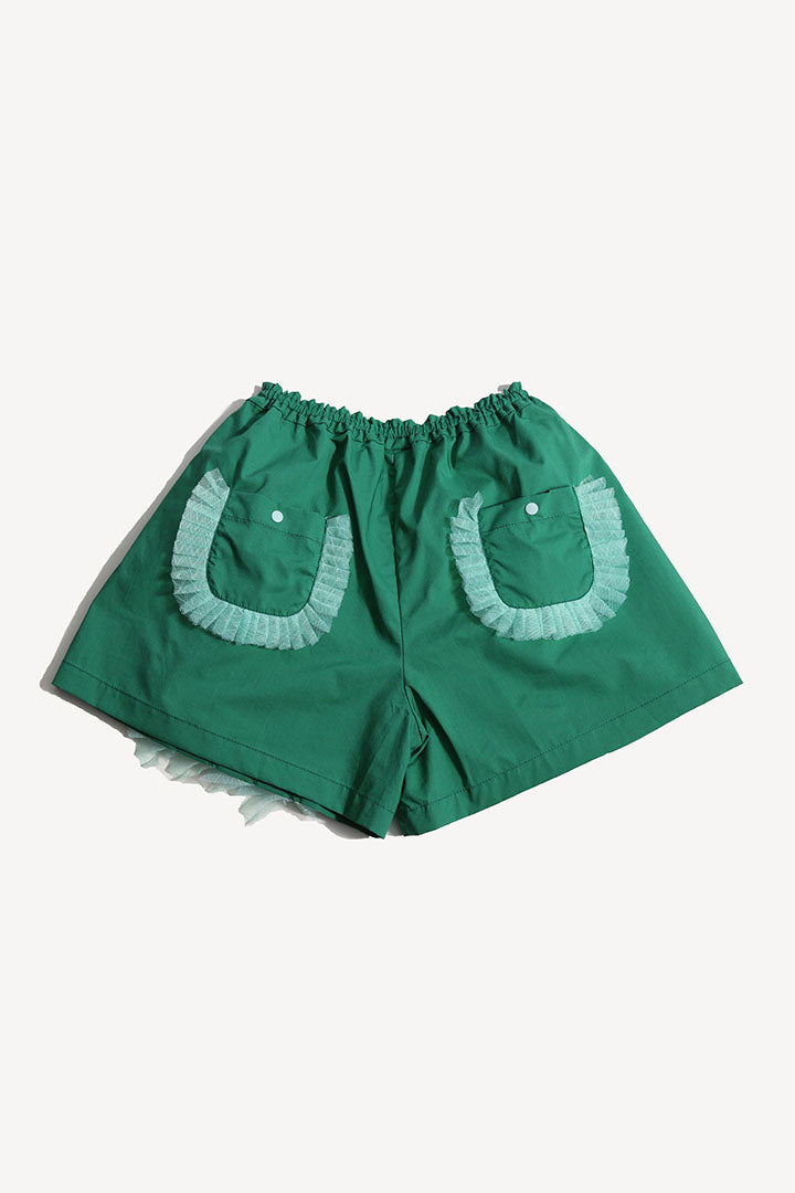 With tiers and tiers of tulle, these shorts are over the top in the best way! Featuring multiple tiers of pleated Argyle Tulle at the front of these Classic Cotton Poplin shorts, these high-waisted shorts create a voluminous look that’s both playful and chic. The design includes handy in-seam pockets and snaps at the tulle trimmed back pockets for added flair and functionality. Easy, relaxed fitting girl’s shorts with an elastic waistband for comfort and ease of wear. A true summer statement piece, pair it with the Toula Tiered Ruffle Blouse for the full tulle ensemble.